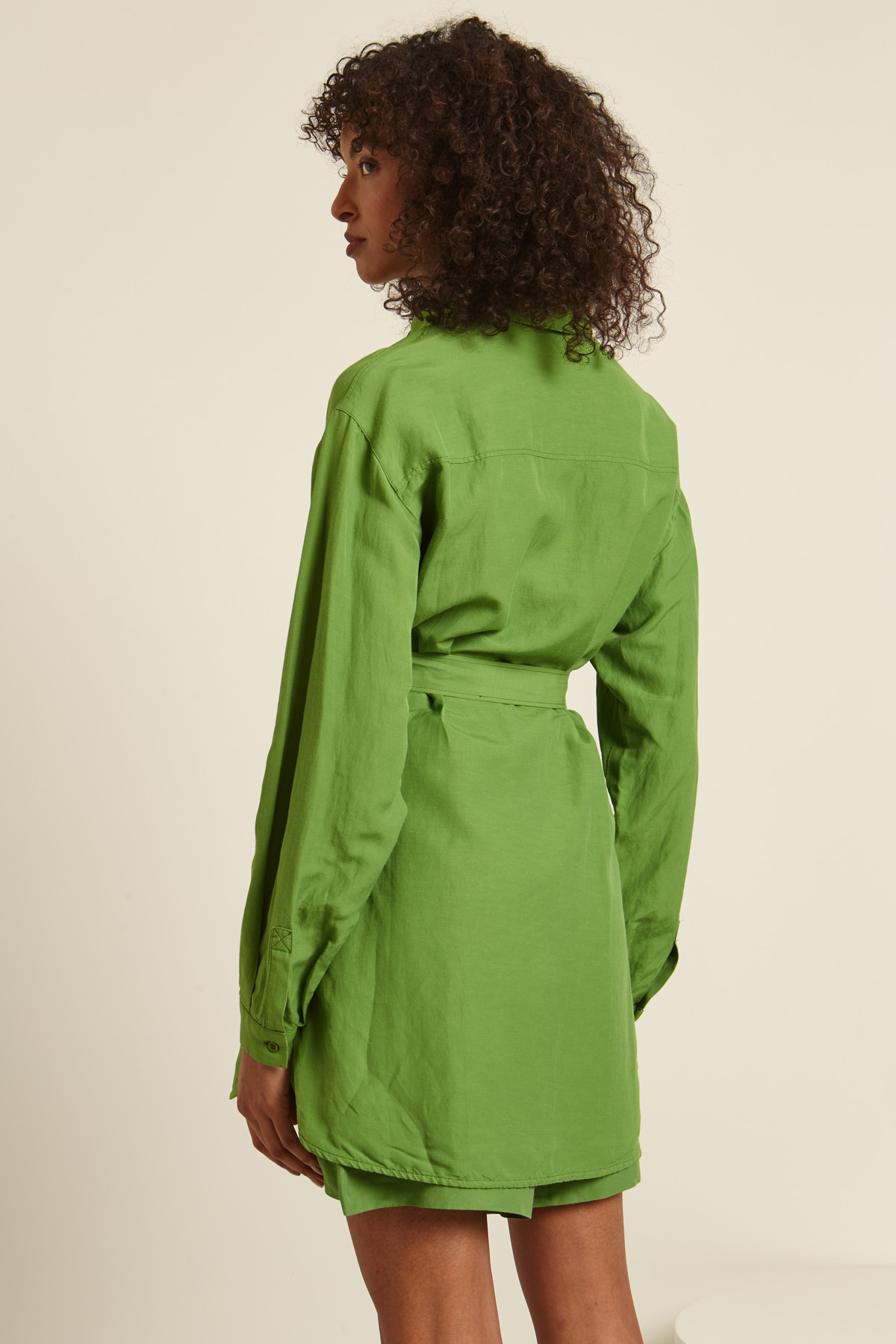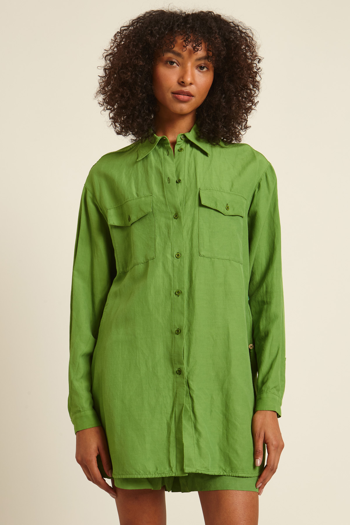 Casacca sahariana lunga realizzata in tessuto di viscosa, lino e cotone, con colletto classico, maniche lunghe con polsino e bottone, tasche applicate con patta al petto, spacchi laterali al fondo. Allacciatura tramite bottoni a vista e cintura coordinata.
