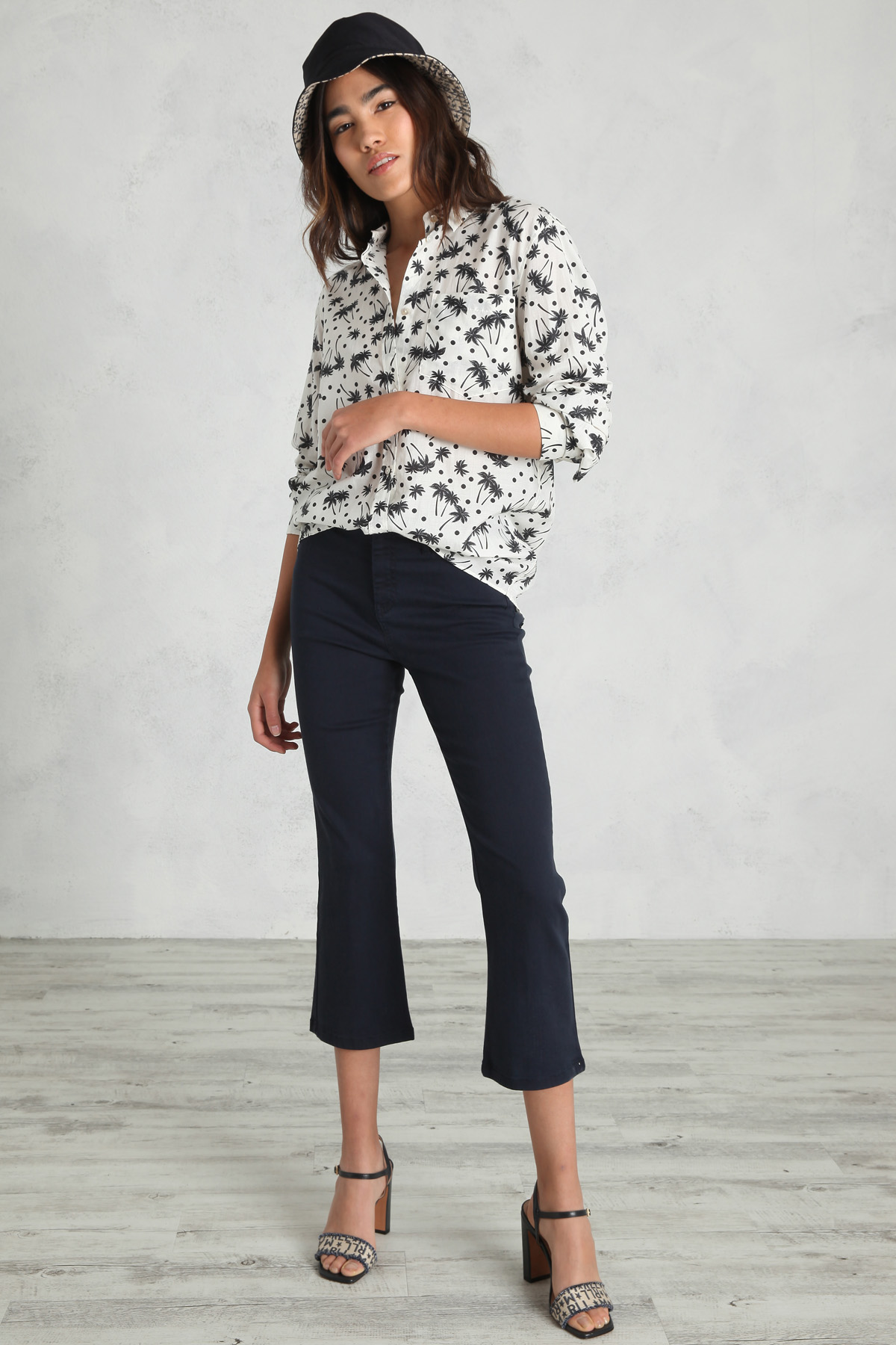 Camicia dalla linea over realizzata in mussola di cotone e seta a fantasia, con colletto classico, maniche lunghe dal giro leggermente sceso, taschino applicato e fondo arrotondato più lungo sul retro. Allacciatura tramite bottoni.