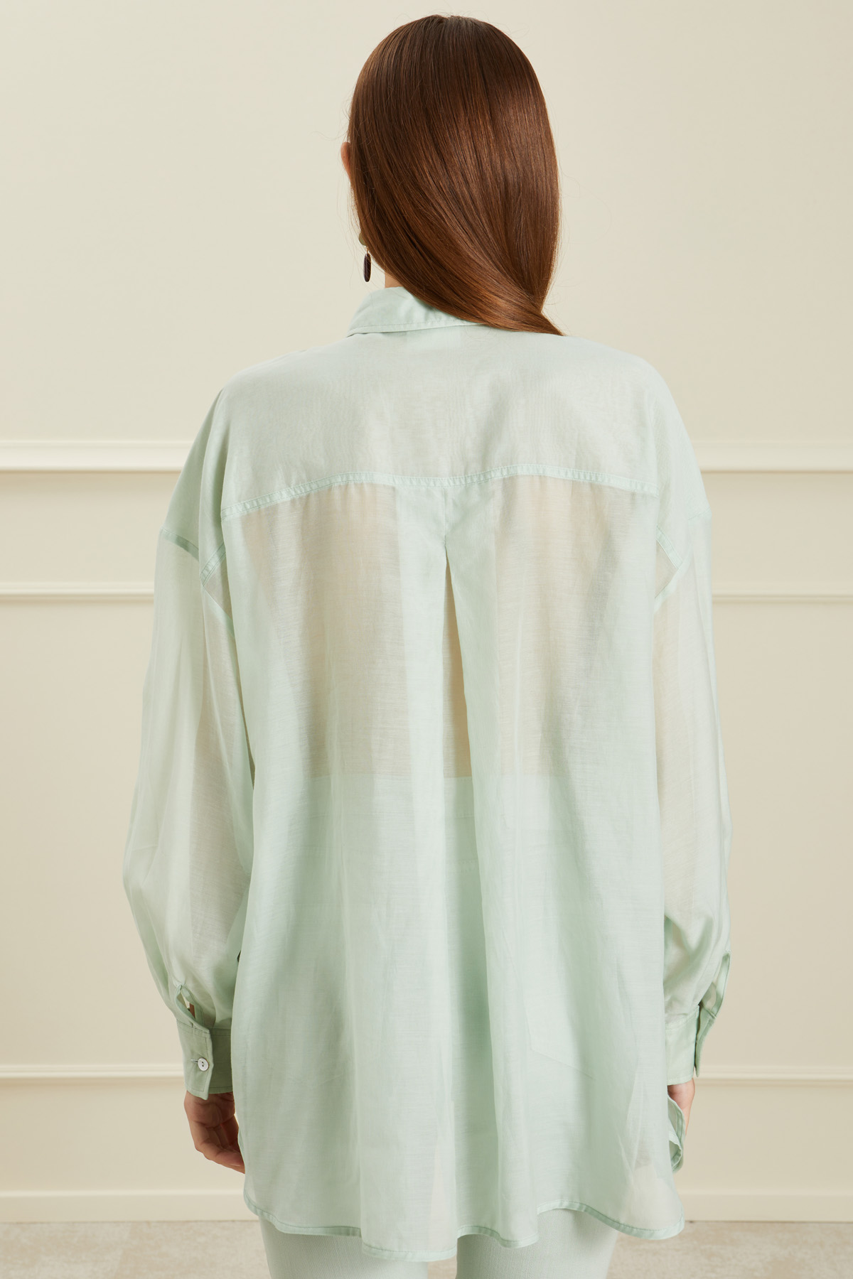 Camicia dalla linea dritta realizzata in mussola di cotone e seta, con colletto classico, maniche lunghe con polsino e bottone, taschini applicati sul davanti. Taglio carrè con cannoncino e allacciatura tramite bottoni a vista.