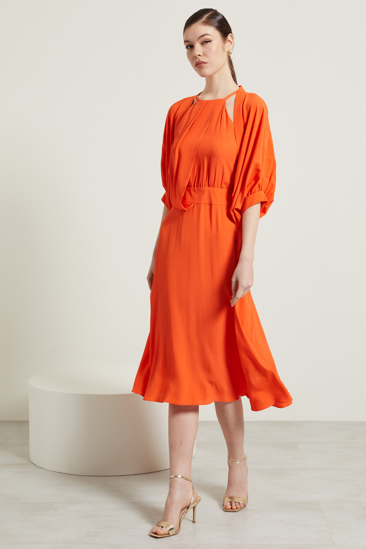 Coprispalle dalla linea fluida realizzato in crêpe de chine di misto seta, con scollo sciallato, maniche tre quarti a kimono e palloncino con polsino basso.