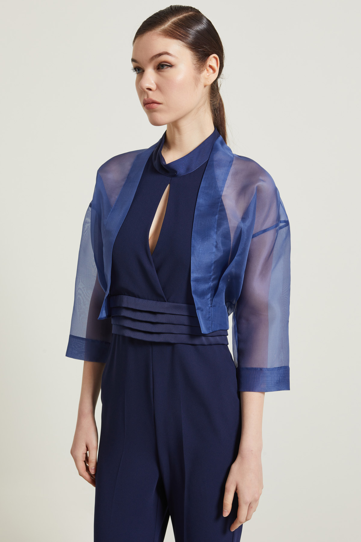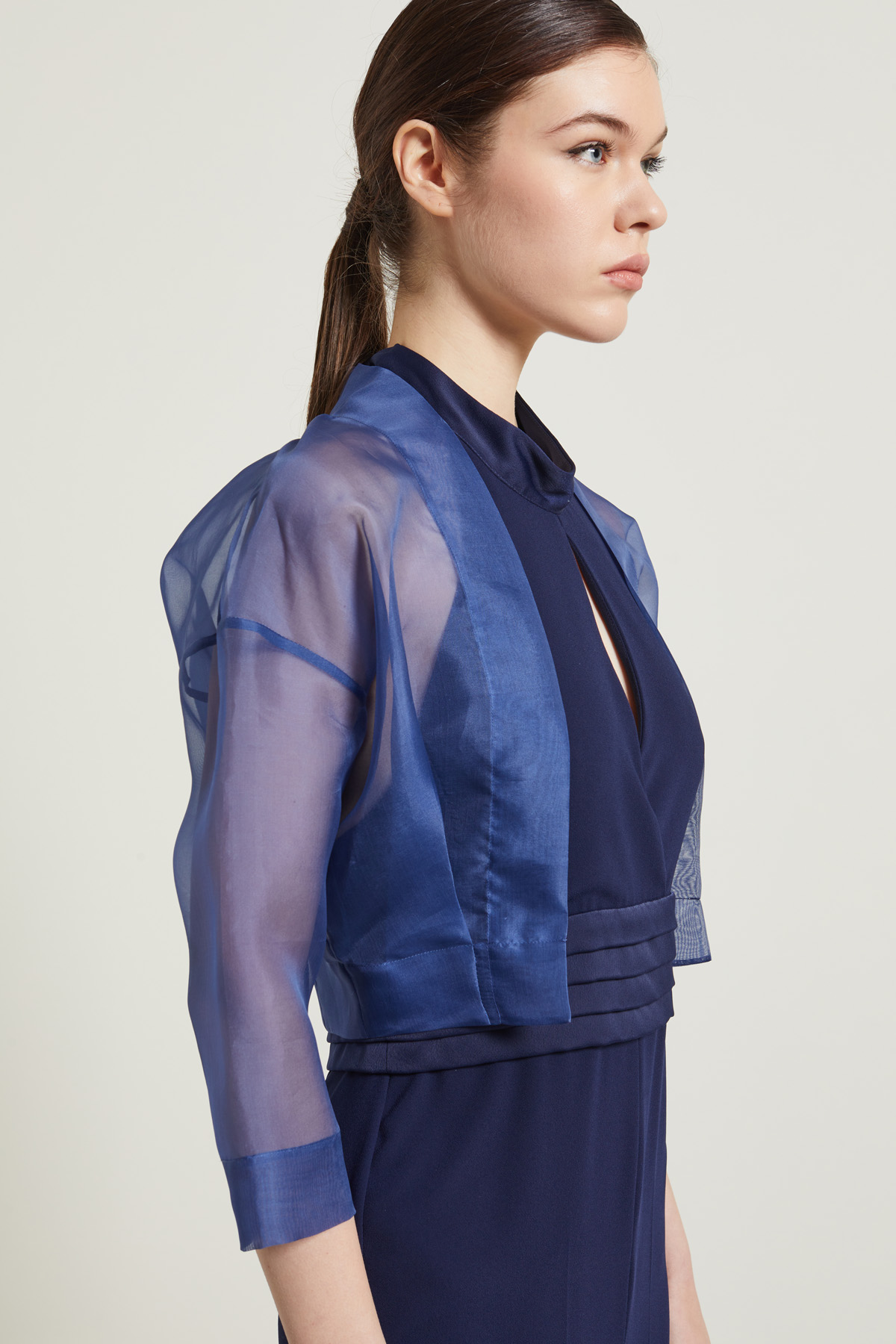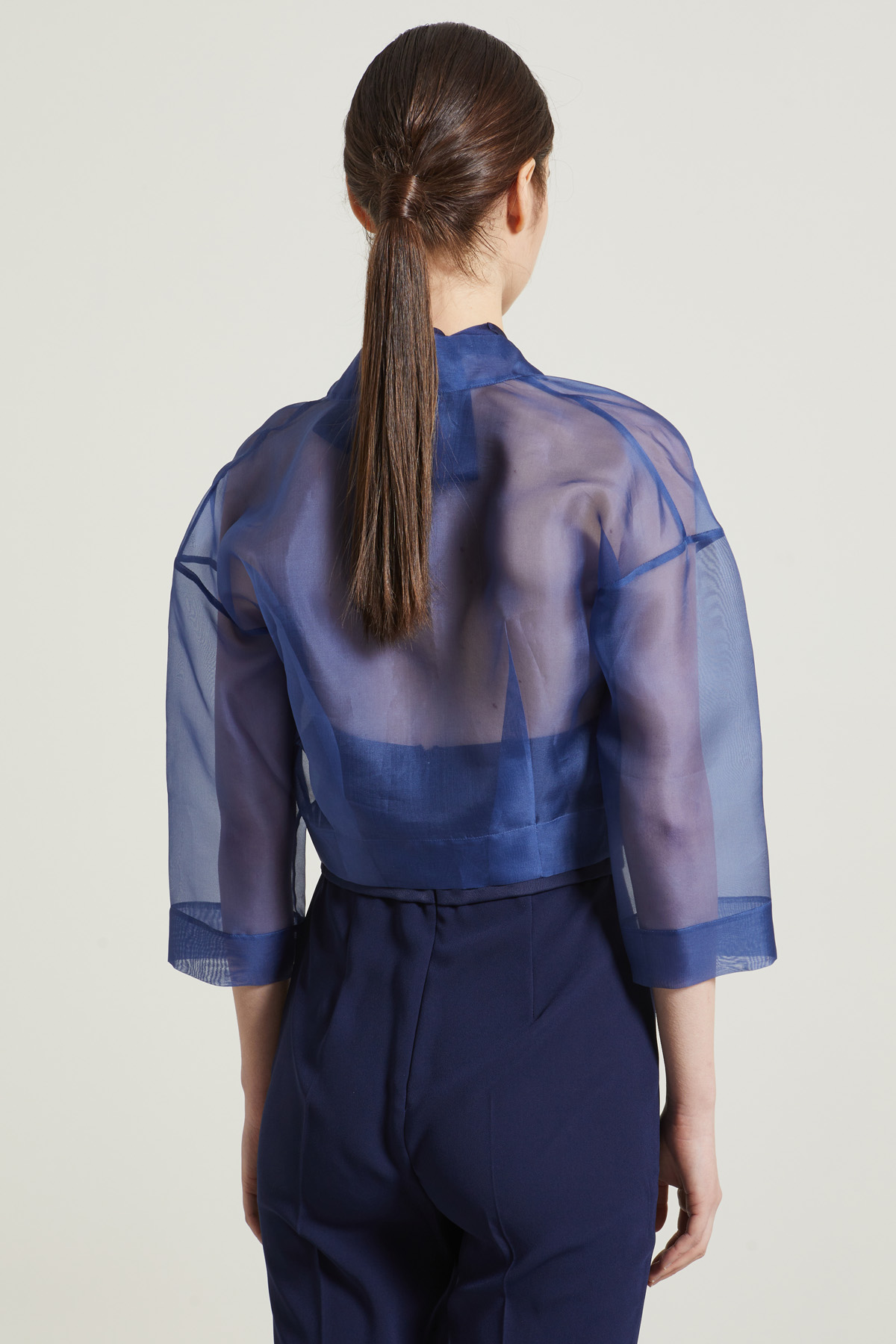 Coprispalle dalla linea boxy realizzato in organza di pura seta, con pinces e maniche tre quarti dal giro sceso.