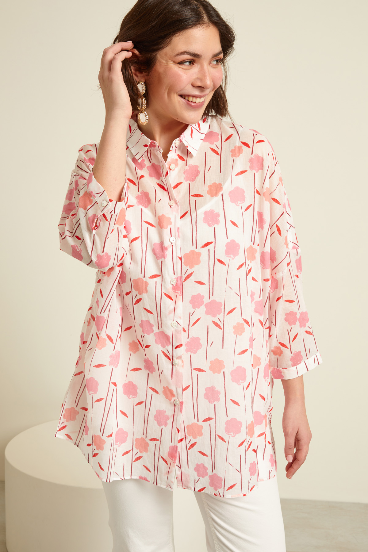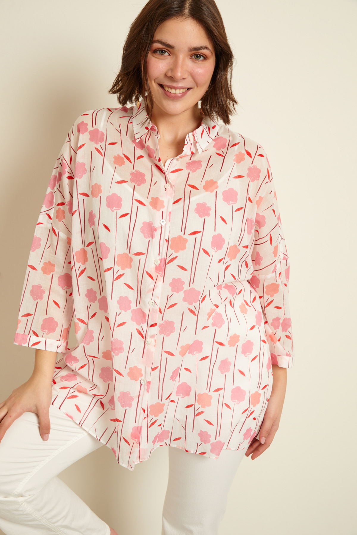 Camicia dalla linea morbida realizzata in voile di puro cotone stampato, con colletto classico, maniche a tre quarti dal giro sceso con polsino e bottone, taglio carrè nel retro e allacciatura tramite bottoni. Canotta sottoveste in abbinamento.