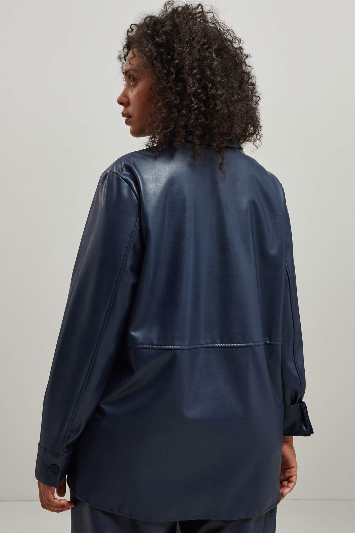 Giacca dalla linea a camicia realizzata in jersey spalmato di misto viscosa stretch effetto pelle, con colletto classico, maniche lunghe con polsino e bottone, allacciatura monopetto tramite bottoni a vista. Sfoderata.