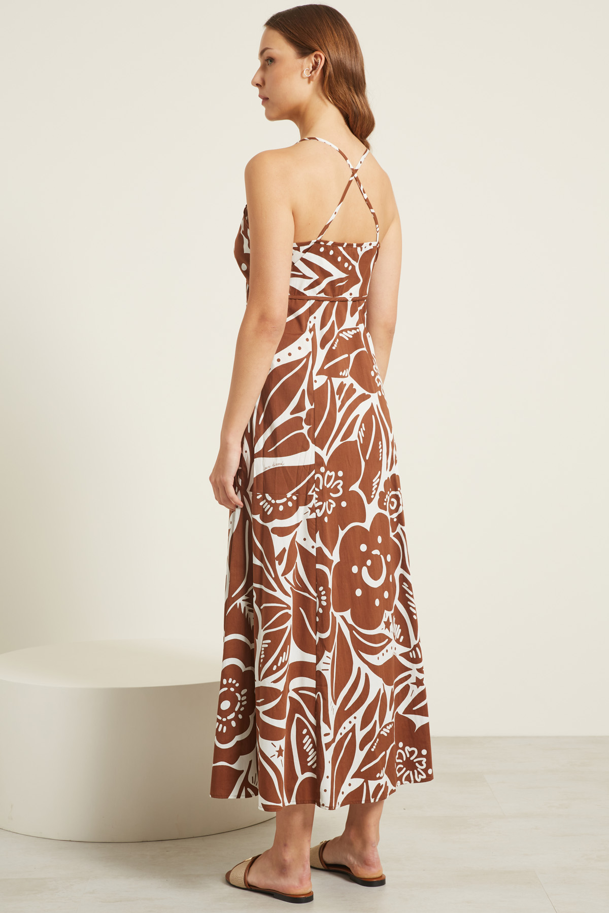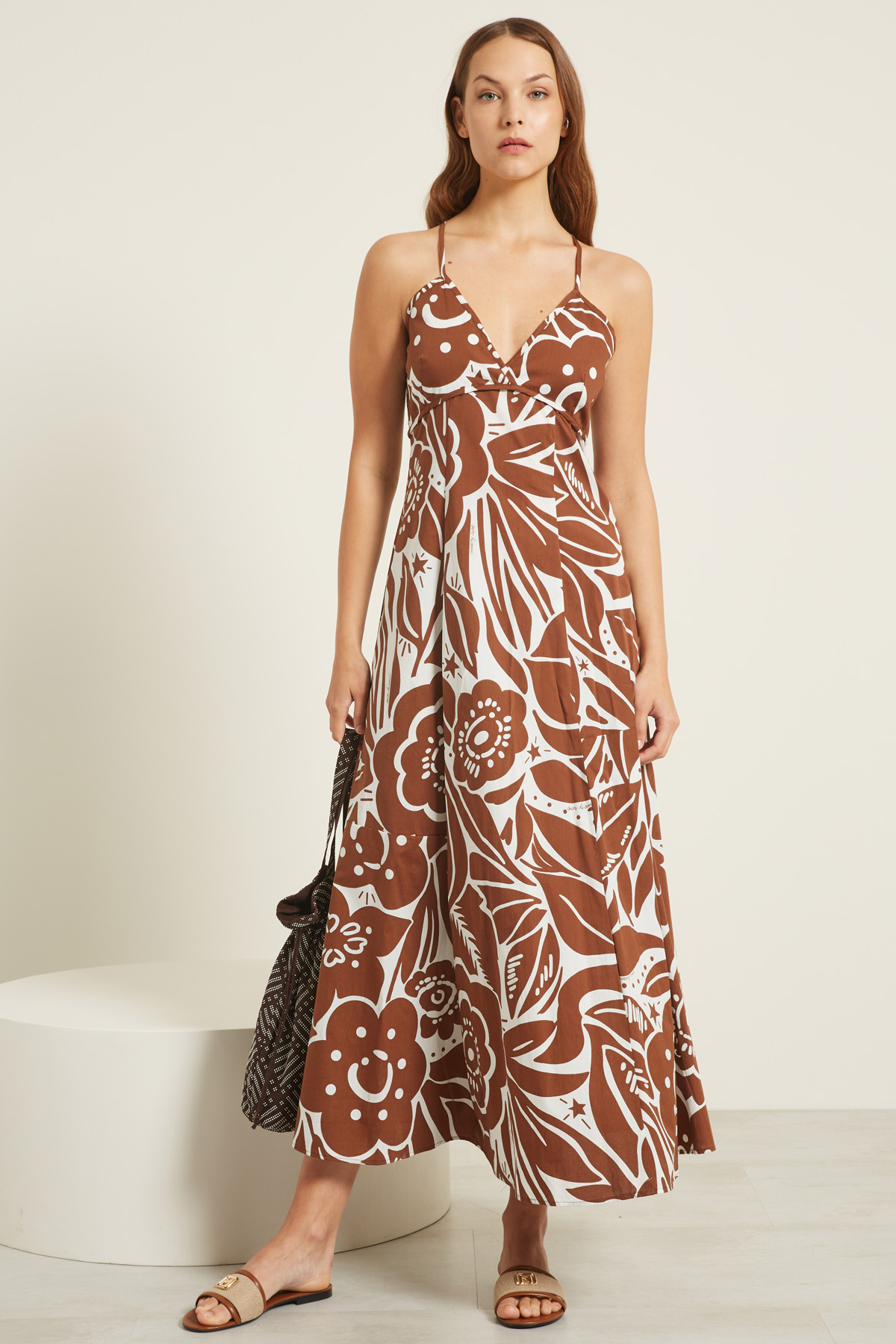Abito dalla linea svasata realizzato in popeline di cotone stretch stampato, con scollo a V e spallini sottili incrociati. Allacciatura tramite zip invisibile sul fianco. Semifoderato.