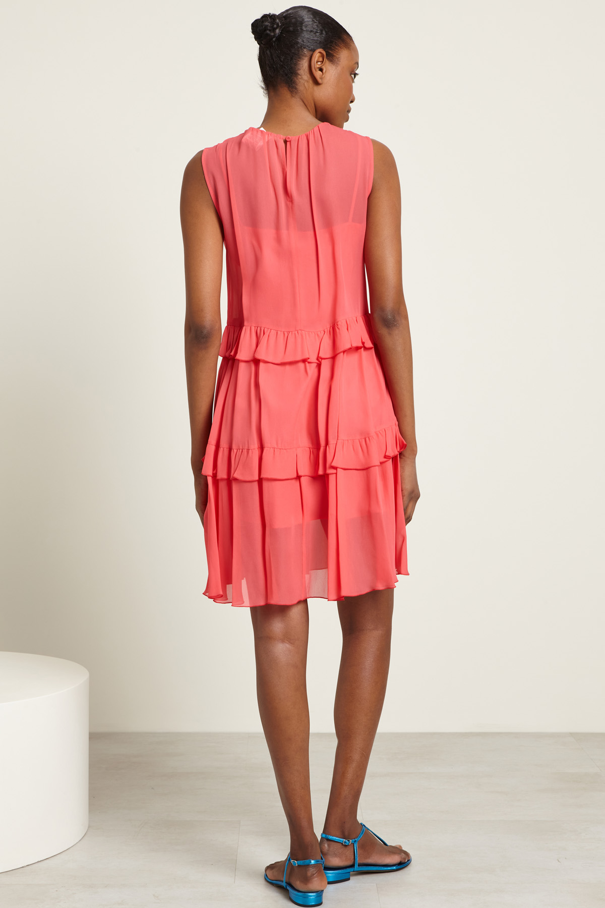Abito dalla linea fluida realizzato in georgette, con motivo di rouches, scollo a giro, senza maniche e allacciatura a goccia tramite bottone nel retro. Sottoveste in abbinamento.