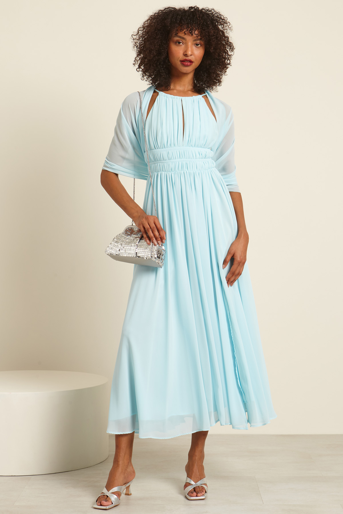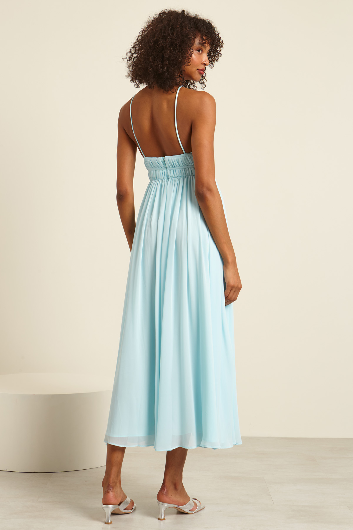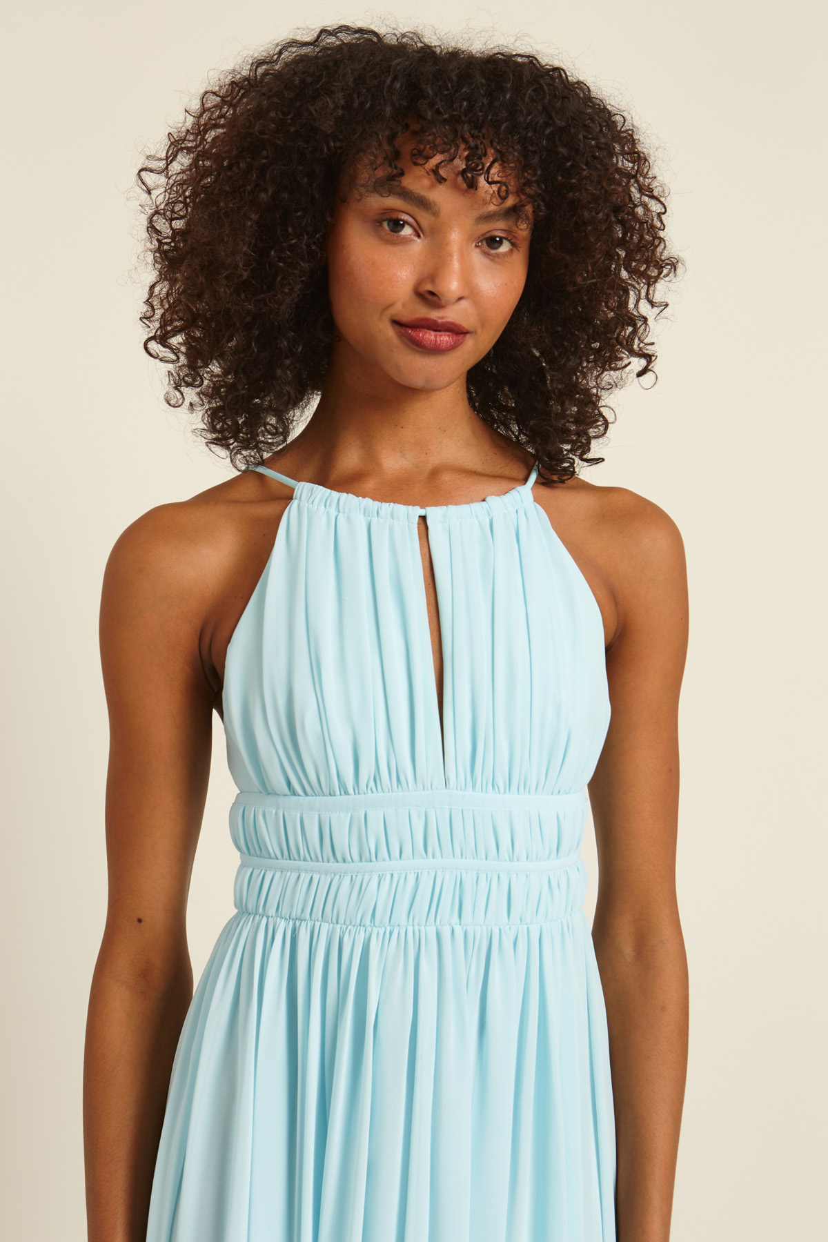 Abito smanicato lungo dalla linea fluida realizzato in georgette, con scollo ampio, spalline sottili con coulisse e dettaglio cut out sul davanti, motivo di arricciature sul davanti e spacco a fondo capo. Allacciatura tramite zip invisibile nel retro. Foderato.