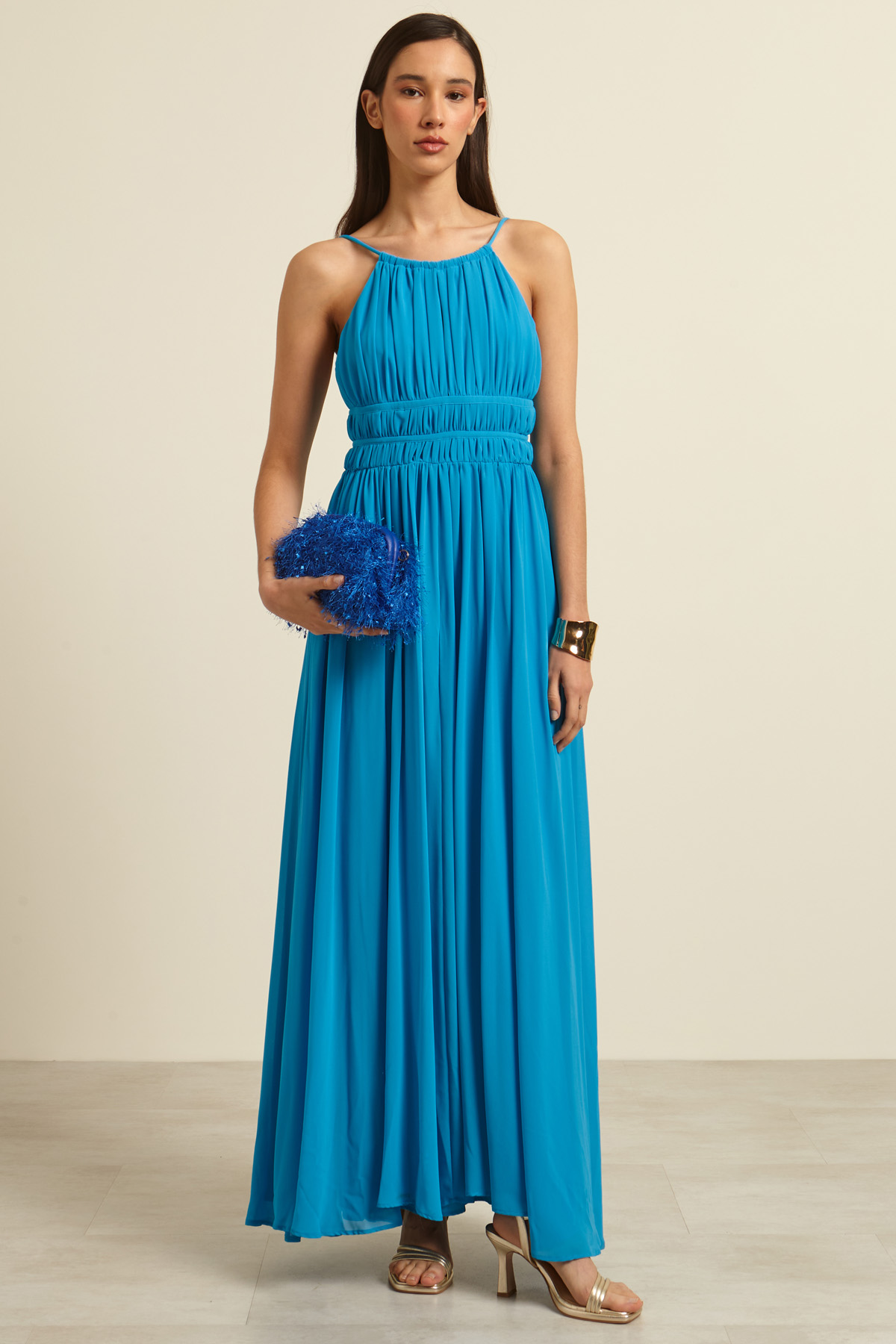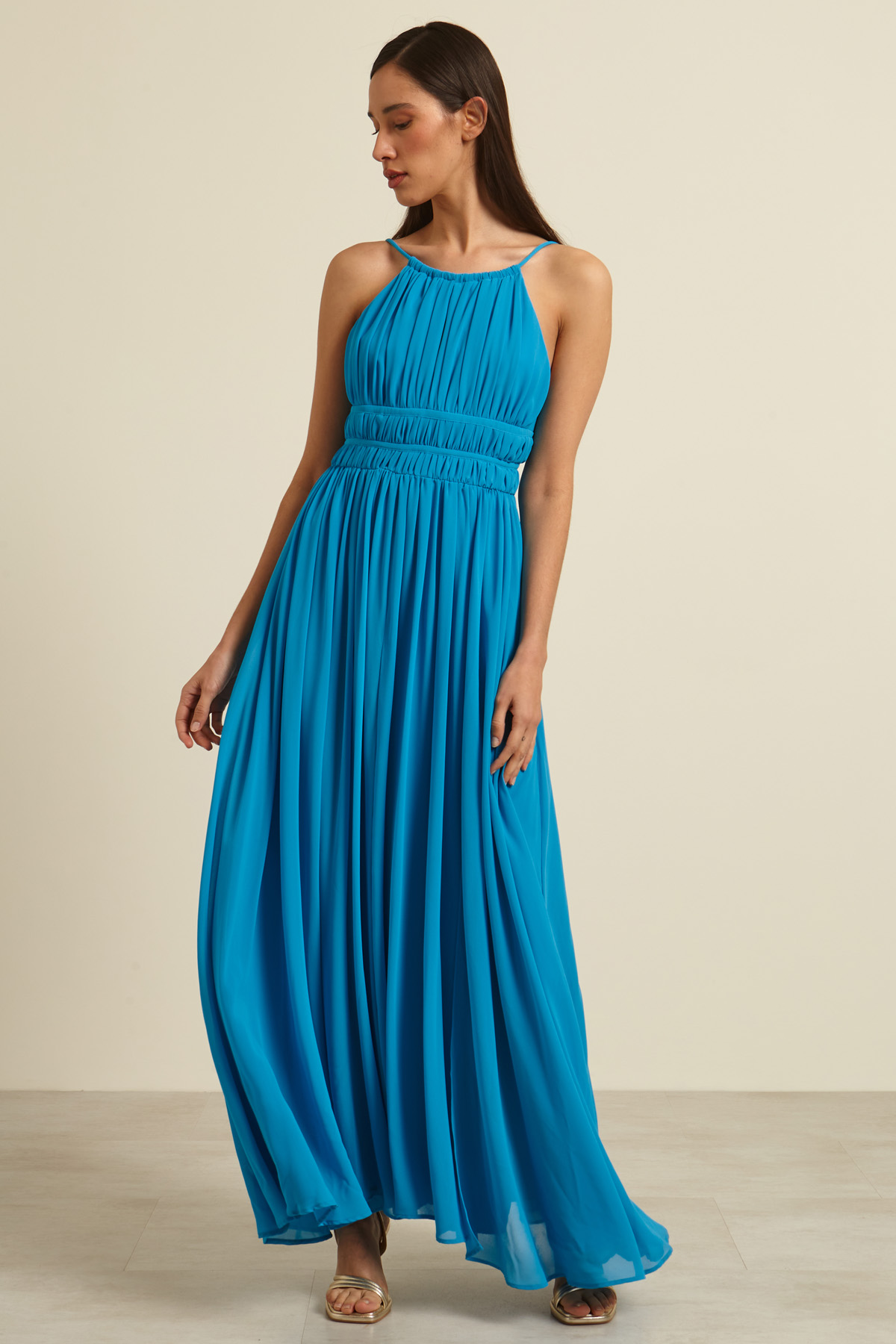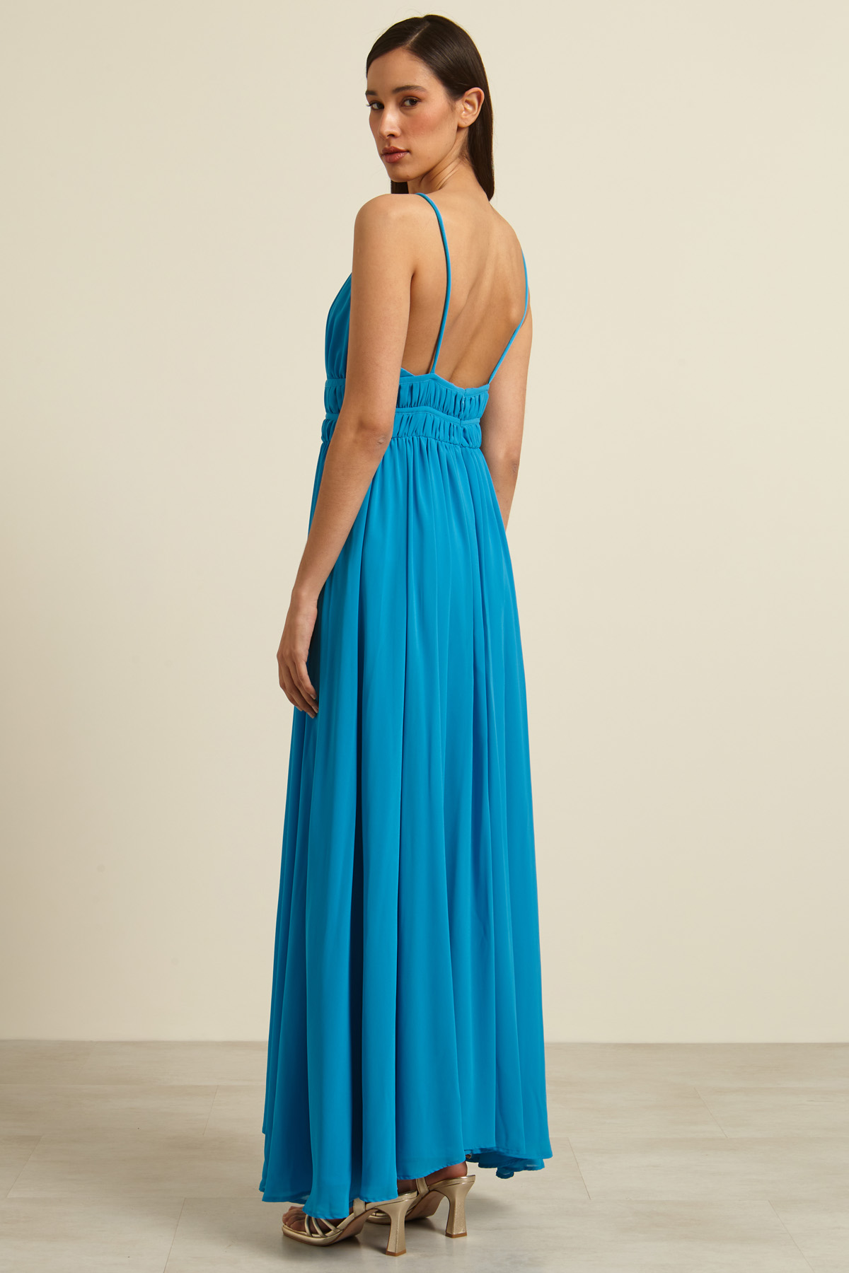 Abito smanicato lungo dalla linea fluida realizzato in georgette, con scollo ampio, spalline sottili con coulisse e dettaglio cut out sul davanti, motivo di arricciature sul davanti e spacco a fondo capo. Allacciatura tramite zip invisibile nel retro. Foderato.