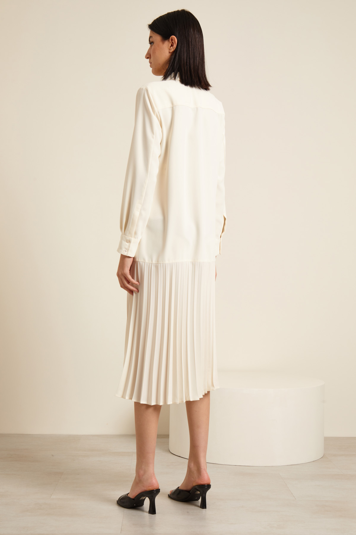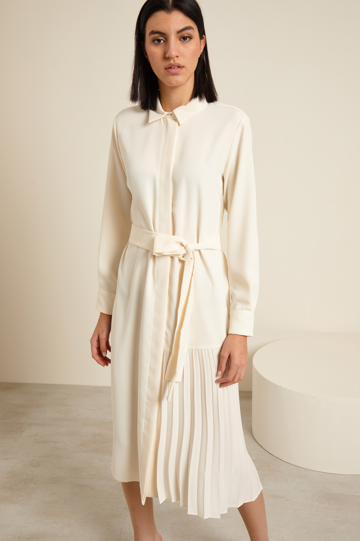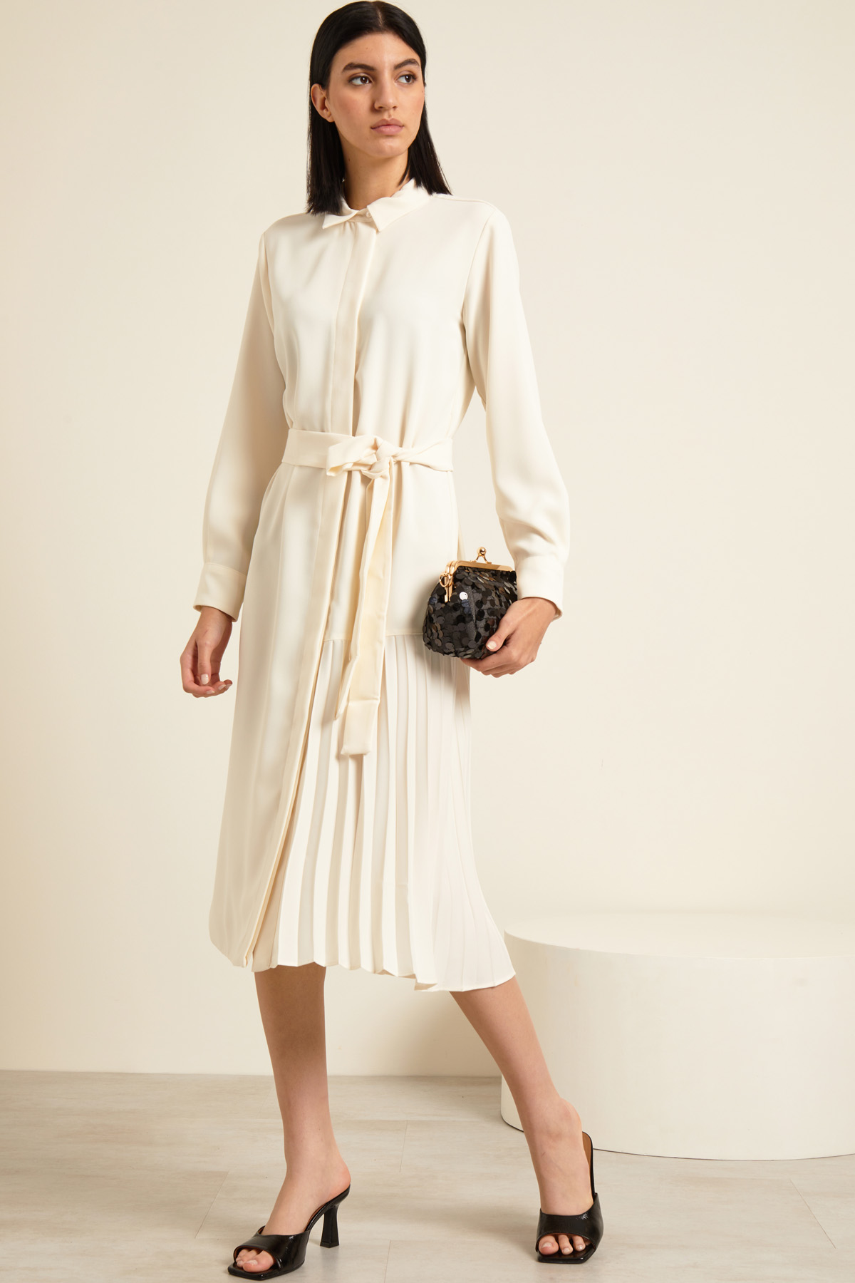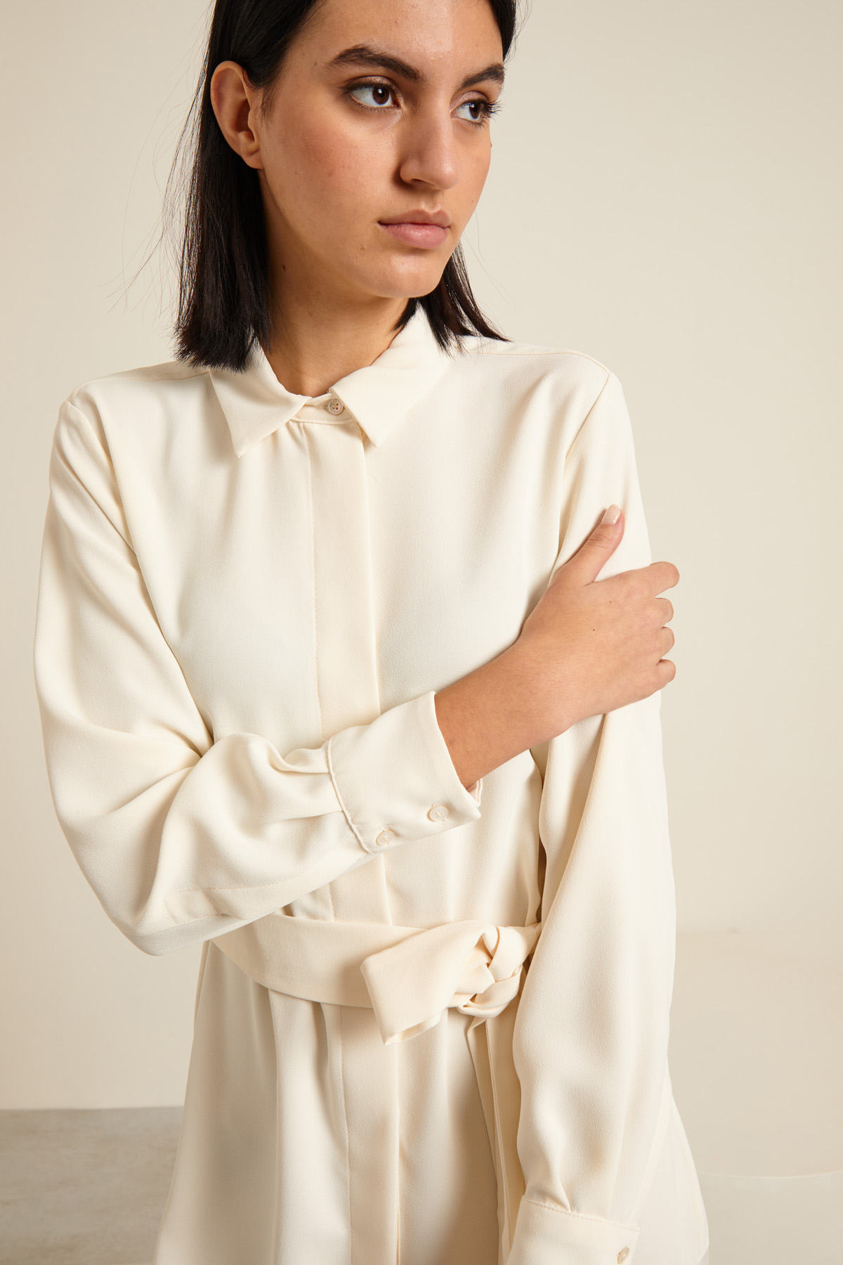 Chemisier lungo dalla linea fluida in crepe satinato con colletto a camicia, maniche lunghe con polsino e bottoni e fondo plissettato. Chiusura con bottoni nascosti su tutta la lunghezza. Capo dotato di cintura coordinata.