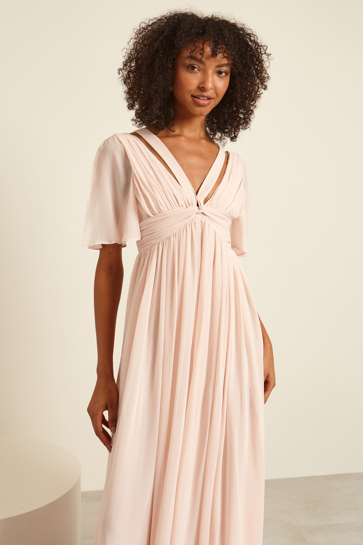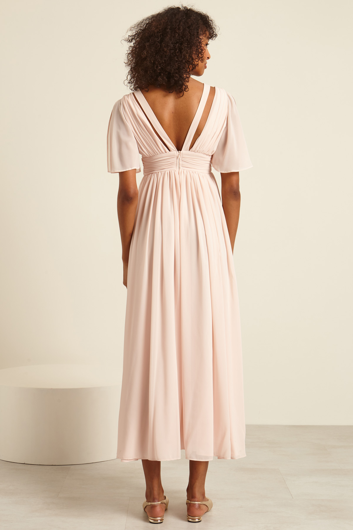 Abito lungo dalla linea fluida realizzato in georgette, con motivo drappeggiato, scollo a V e dettagli cut out, maniche corte con spacchetti, taglio in vita e spacco a fondo capo. Allacciatura tramite zip invisibile nel retro. Semifoderato.