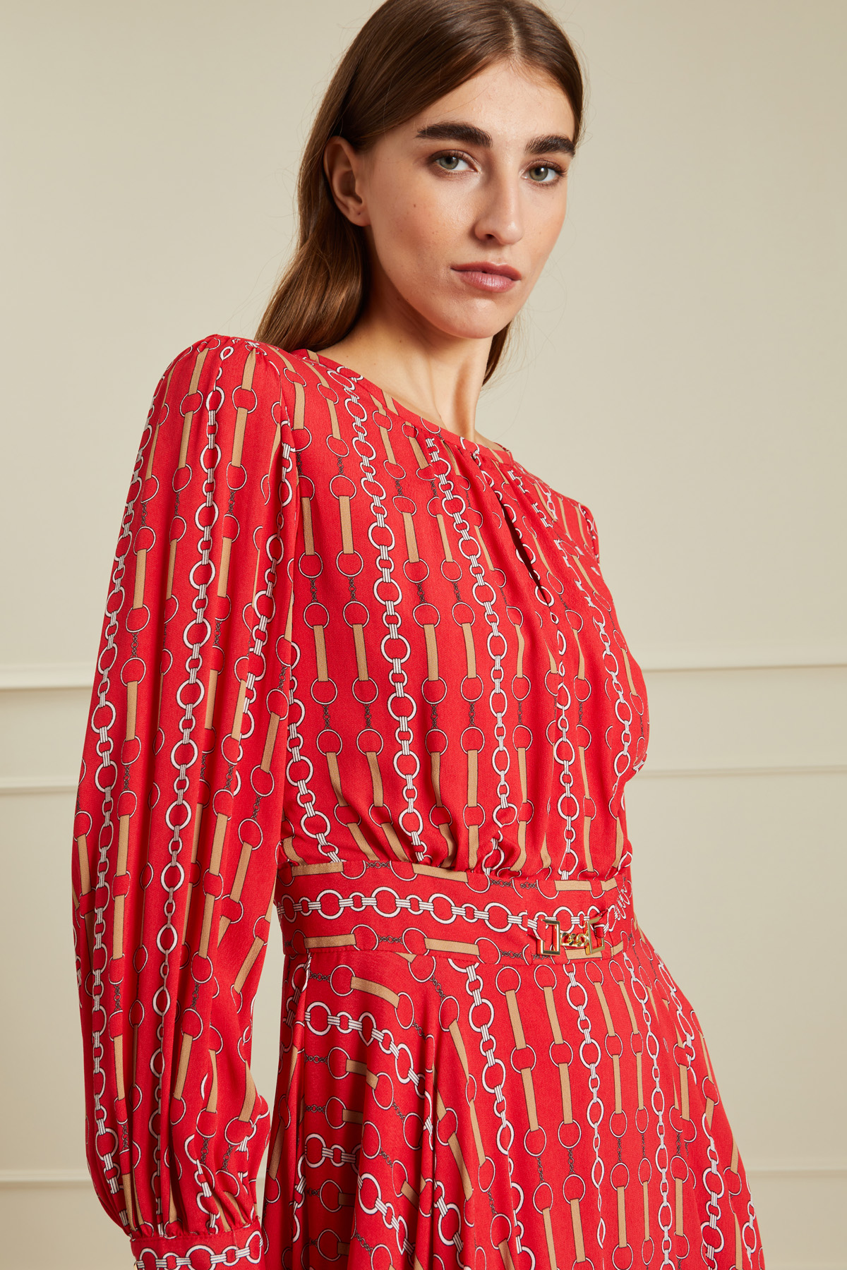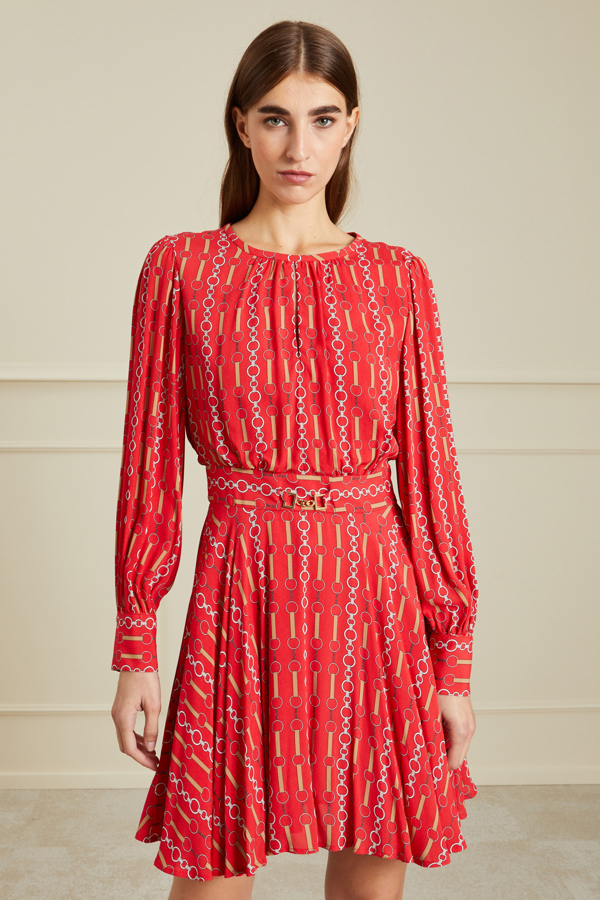 Abito dalla linea svasata al fondo realizzato in crèpe de chine, con scollo tondo con arricciatura, dettaglio di staffa in metallo sul taglio in vita, e maniche ampie con polsino al fondo. Capo foderato, con chiusura a goccia con bottone dietro e zip invisibile laterale.