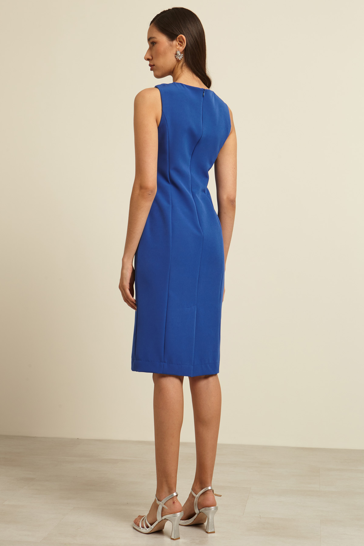 Abito midi dalla linea aderente realizzato in cady stretch con scollo con maxi nodo e motivo cut out, senza maniche. Chiusura con zip invisibile sul retro. Foderato.