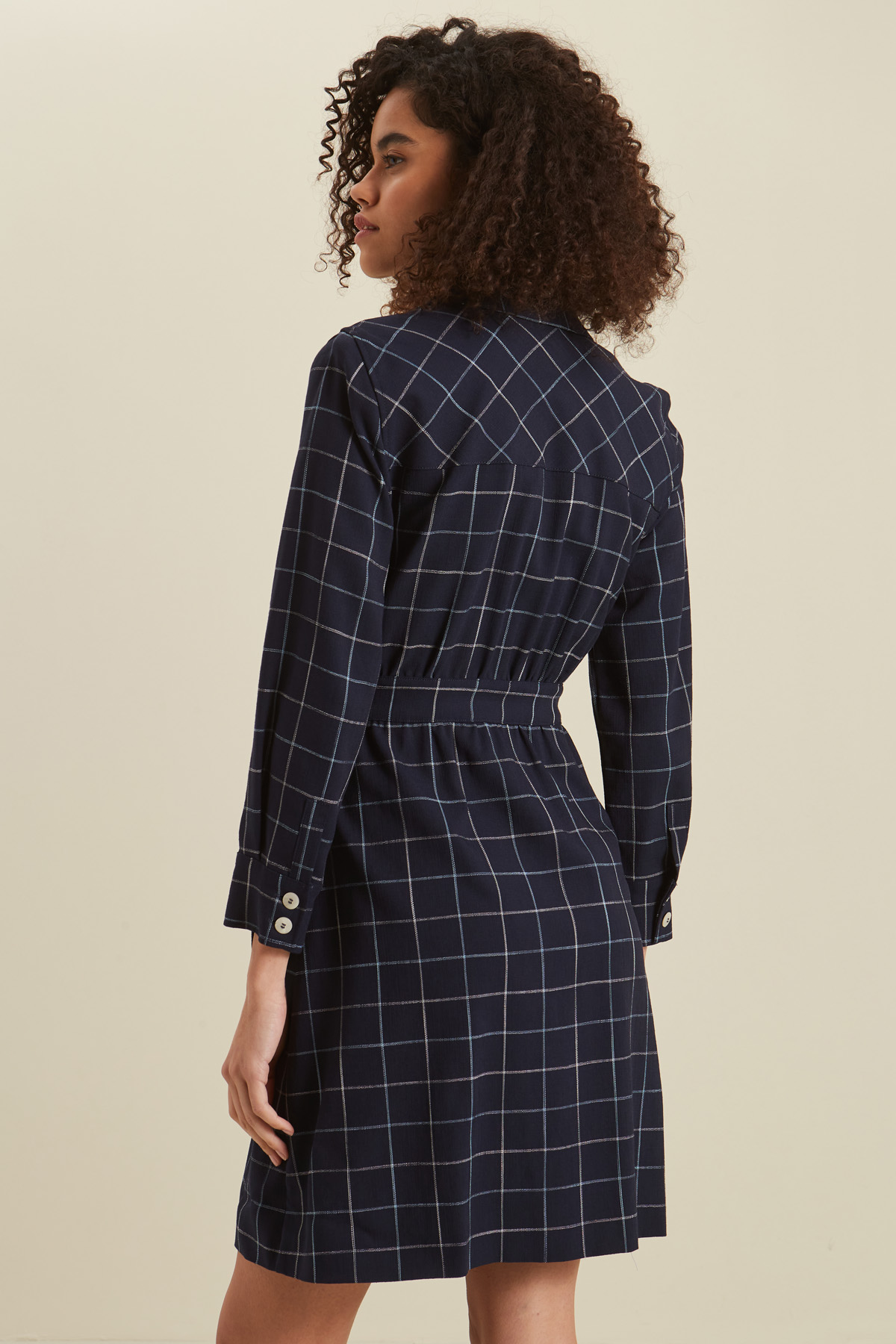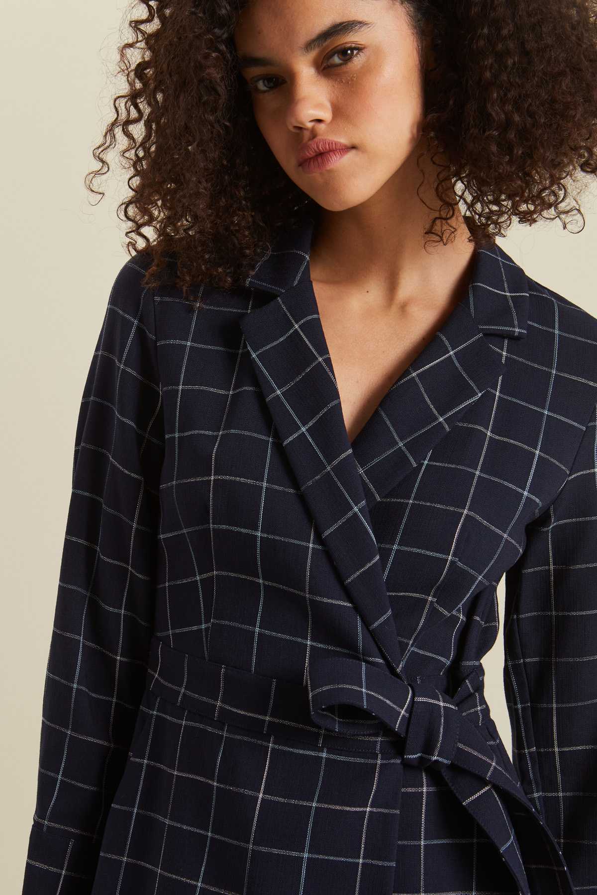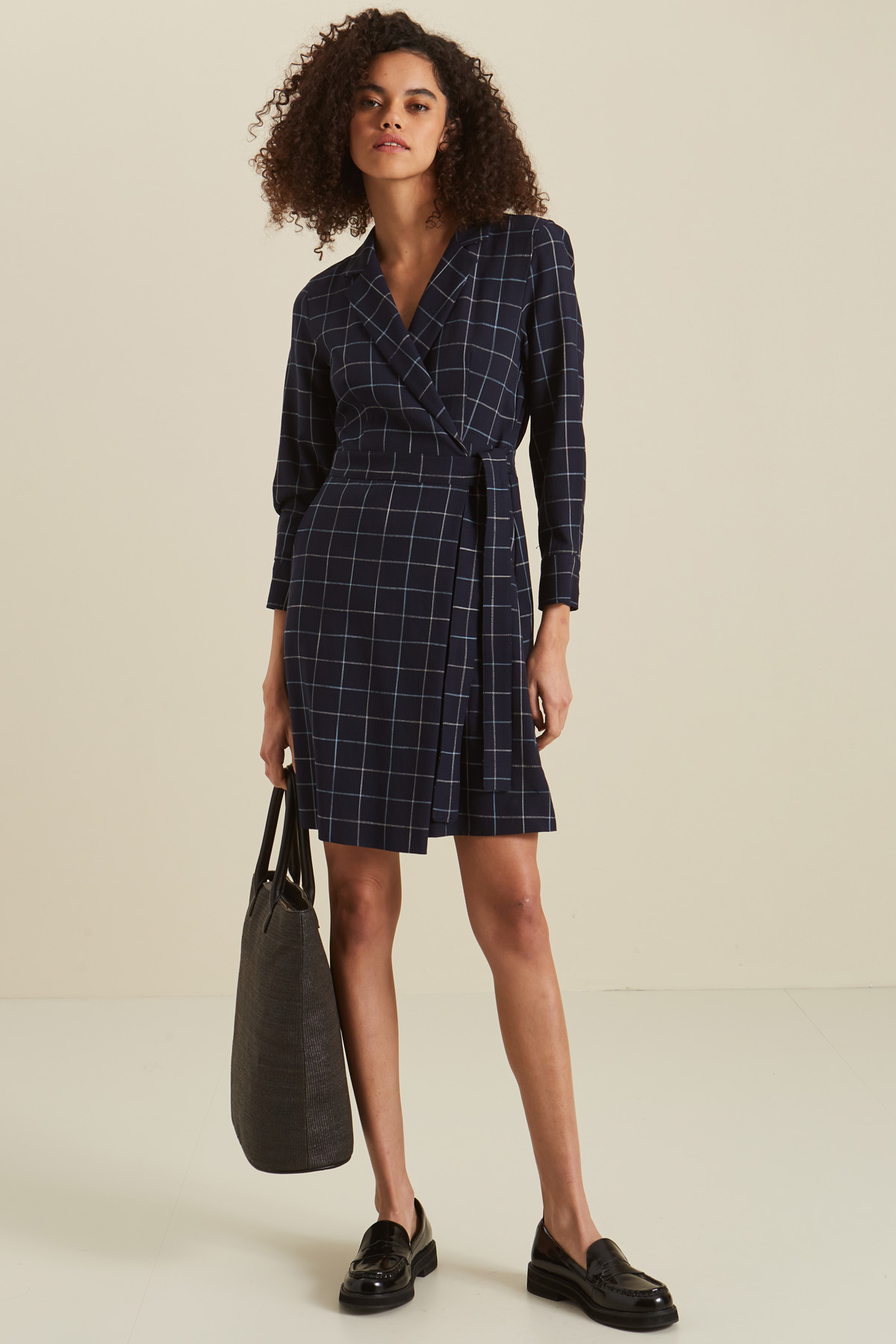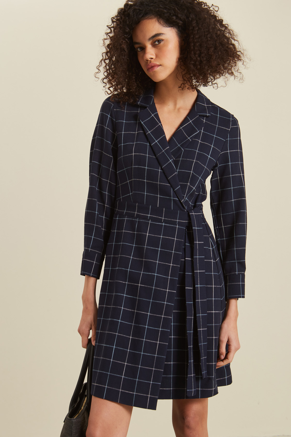 Abito a portafoglio realizzato in stuoia di misto viscosa stretch, con collo a rever incrociato, polsino e botone a fondo manica, tasche alla francese ai fianchi e chiusura tramite bottone e fusciacca.