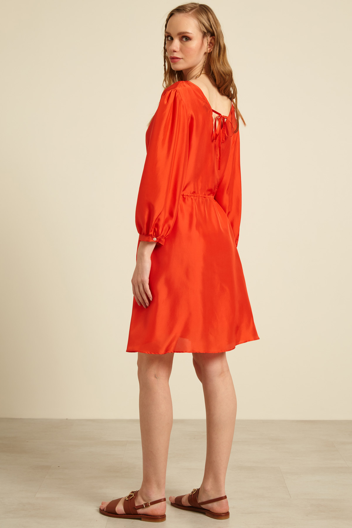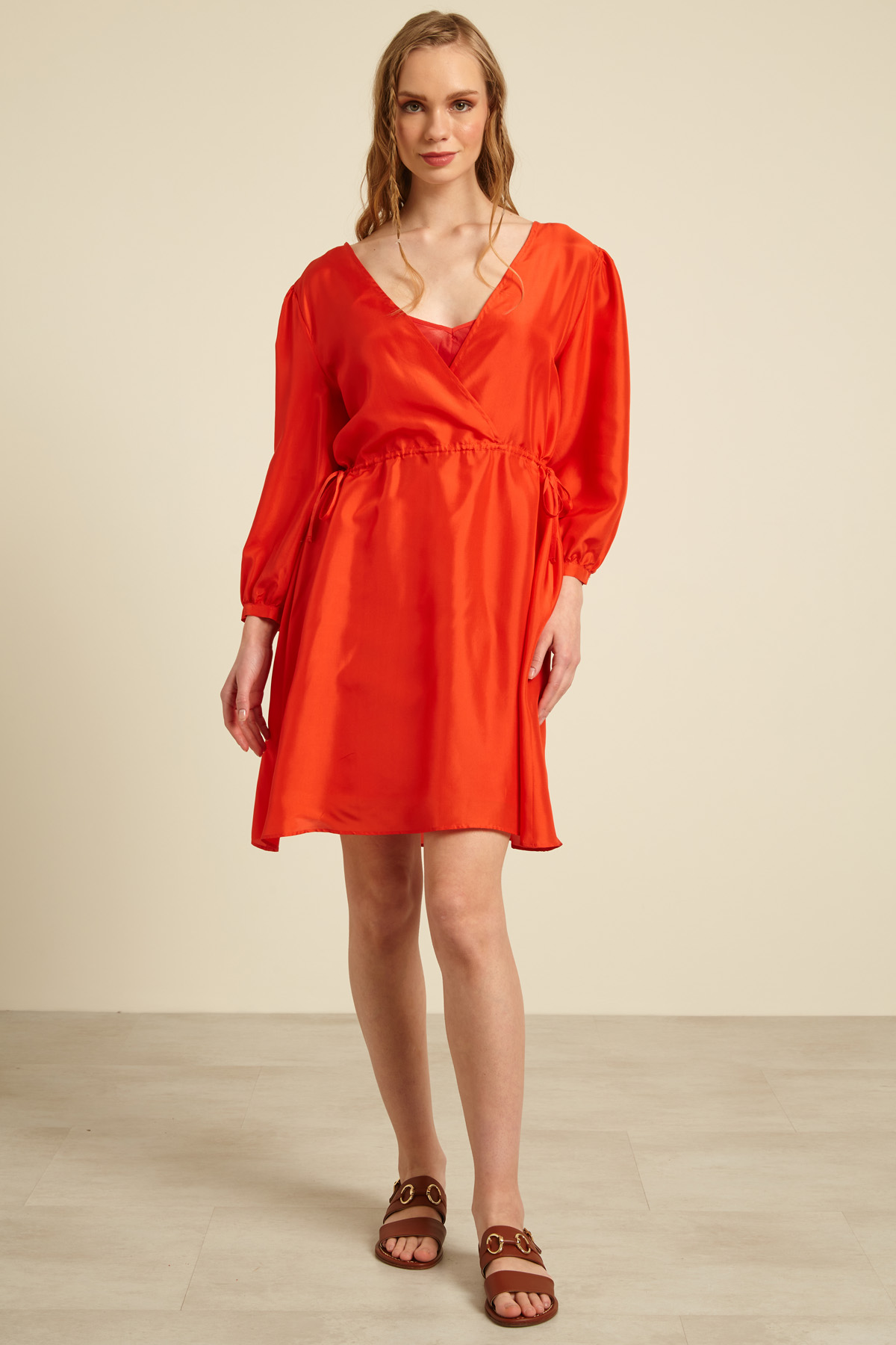 Abito dalla linea morbida realizzato in seta con scollo a V incrociato davanti e dietro, maniche a tre quarti a sbuffo con polsino e bottone al fondo e punto vita arricciato con coulisse. Allacciatura tramite cordino nel retro. Capo dotato di sottoveste.