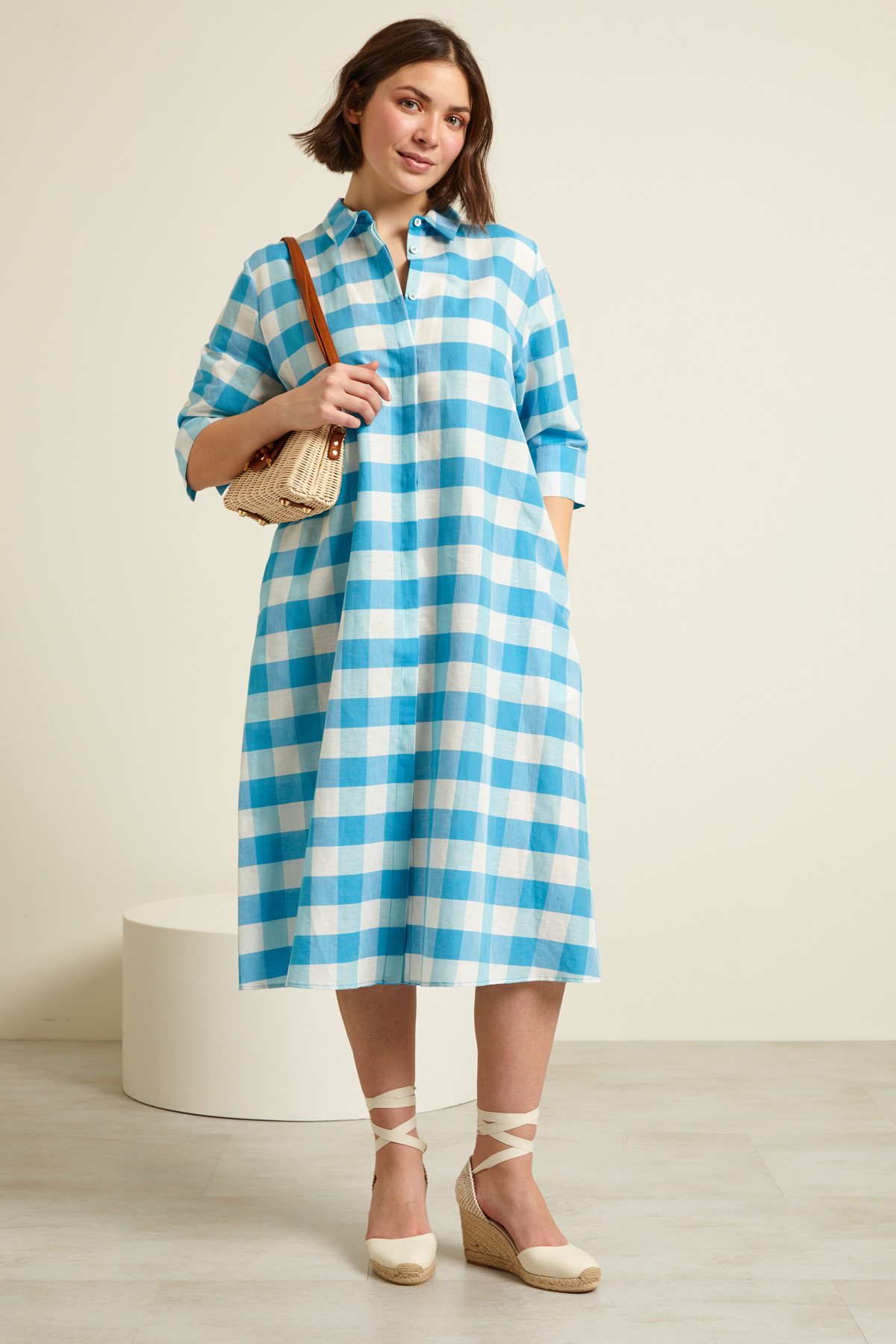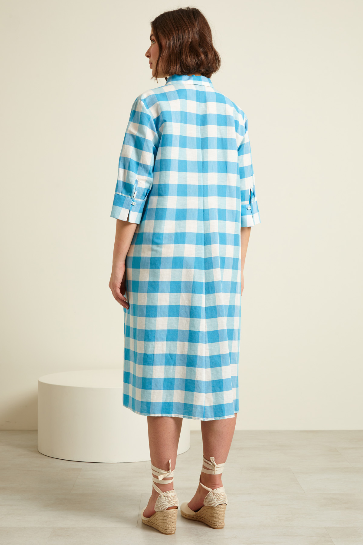 Abito chemisier realizzato in tessuto diagonale di cotone e lino tinto filo, con colletto a camicia, maniche a tre quarti, tasche laterali inserite in cucitura e allacciatura nascosta tramite bottoni.