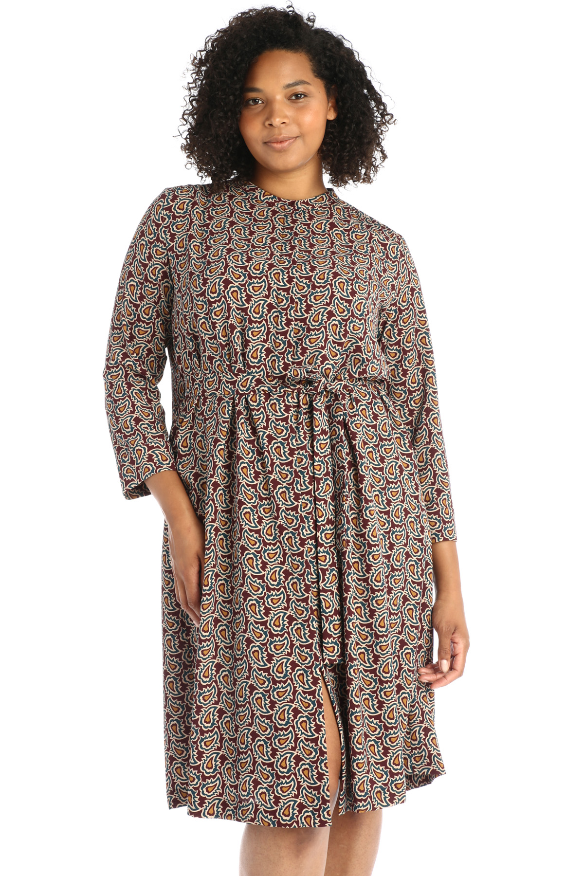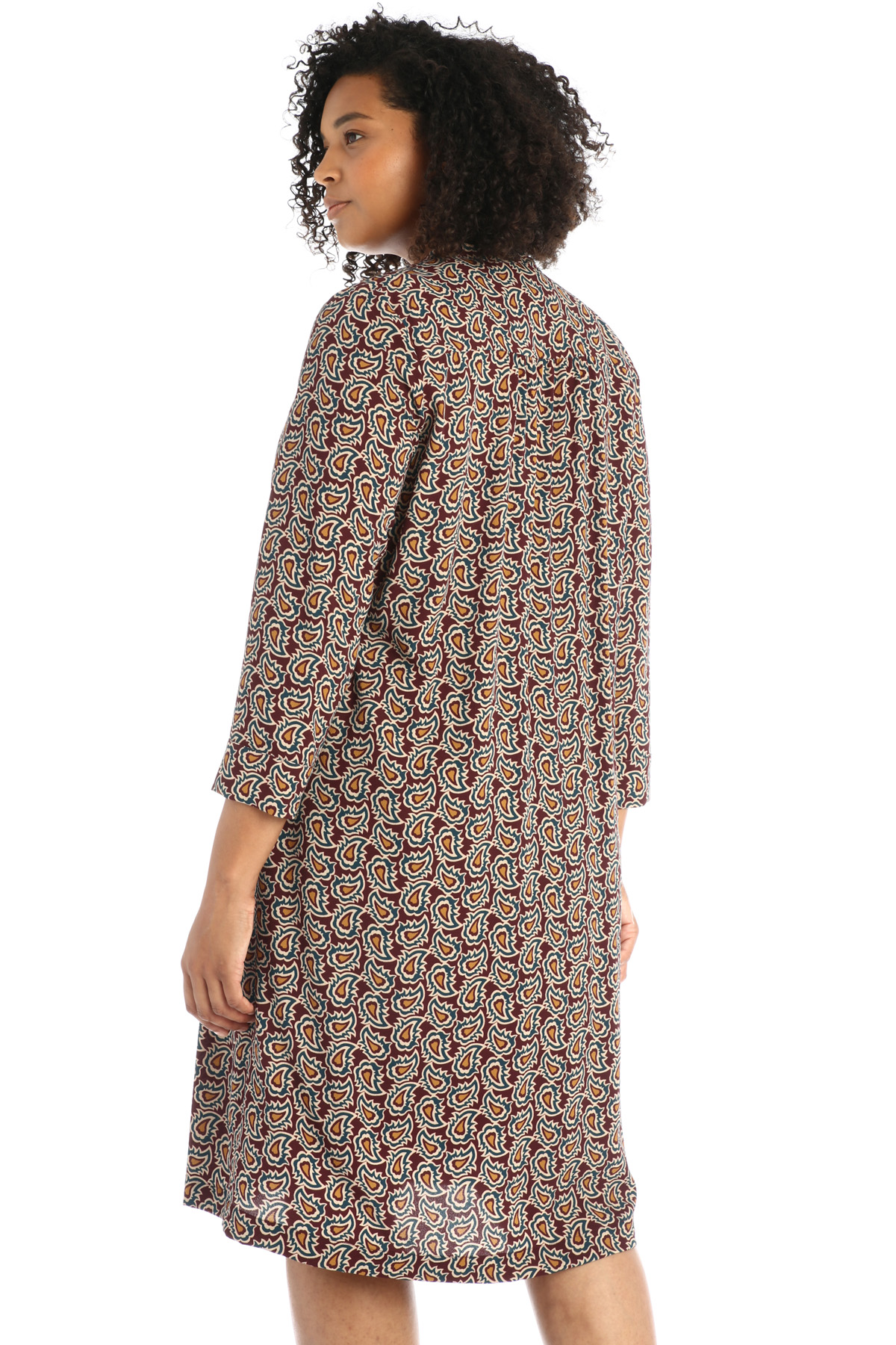 Abito chemisier realizzato in tessuto martellato stampato, con colletto alla coreana, maniche tre quarti e tasche inserite ai fianchi. Allacciatura nascosta tramite bottoni e cintura coordinata. Sottoveste in abbinamento.