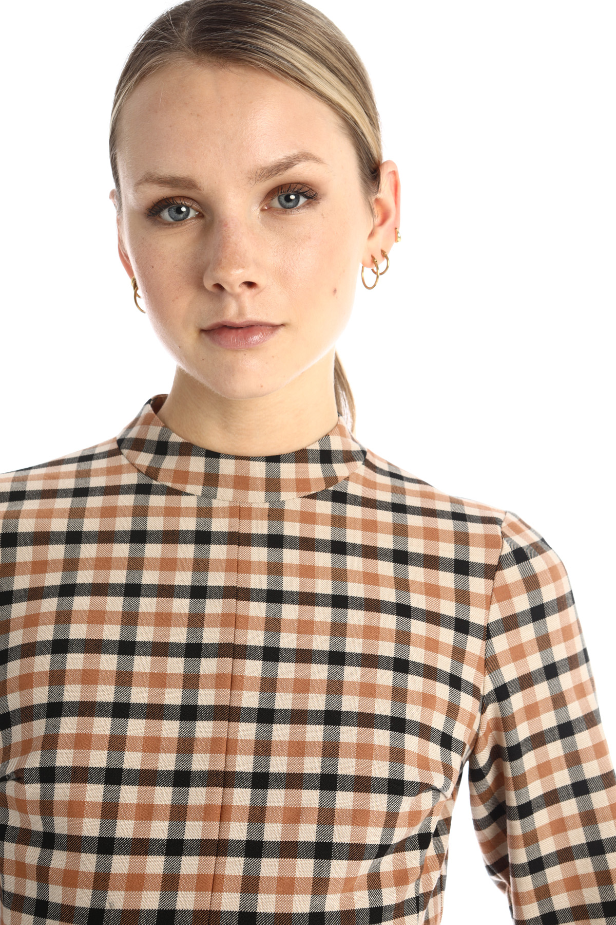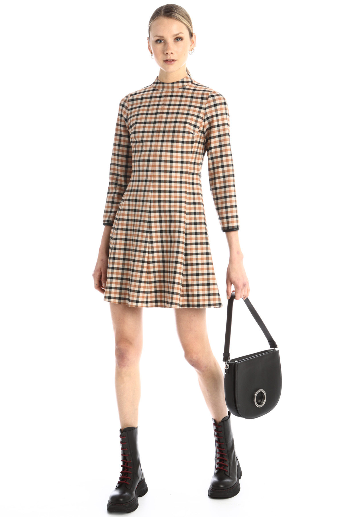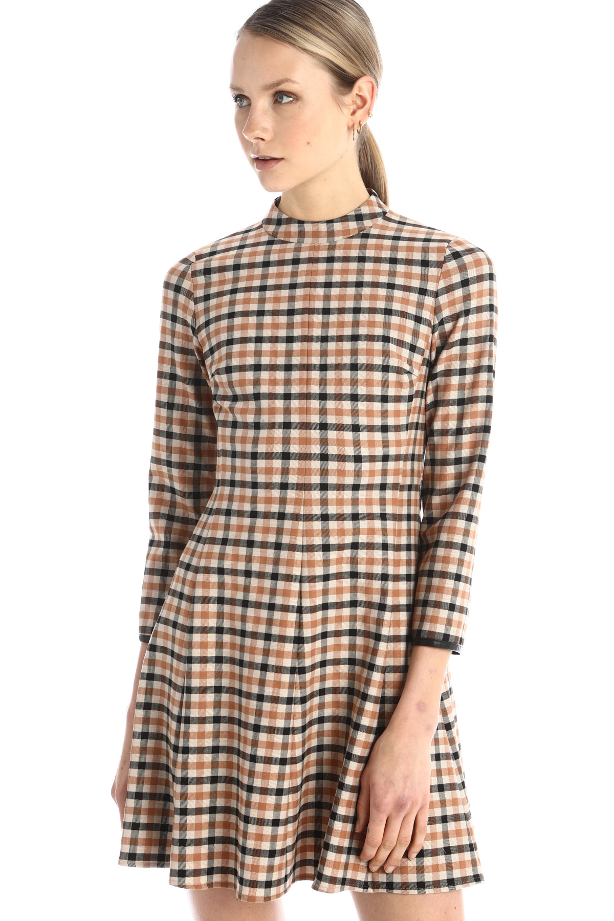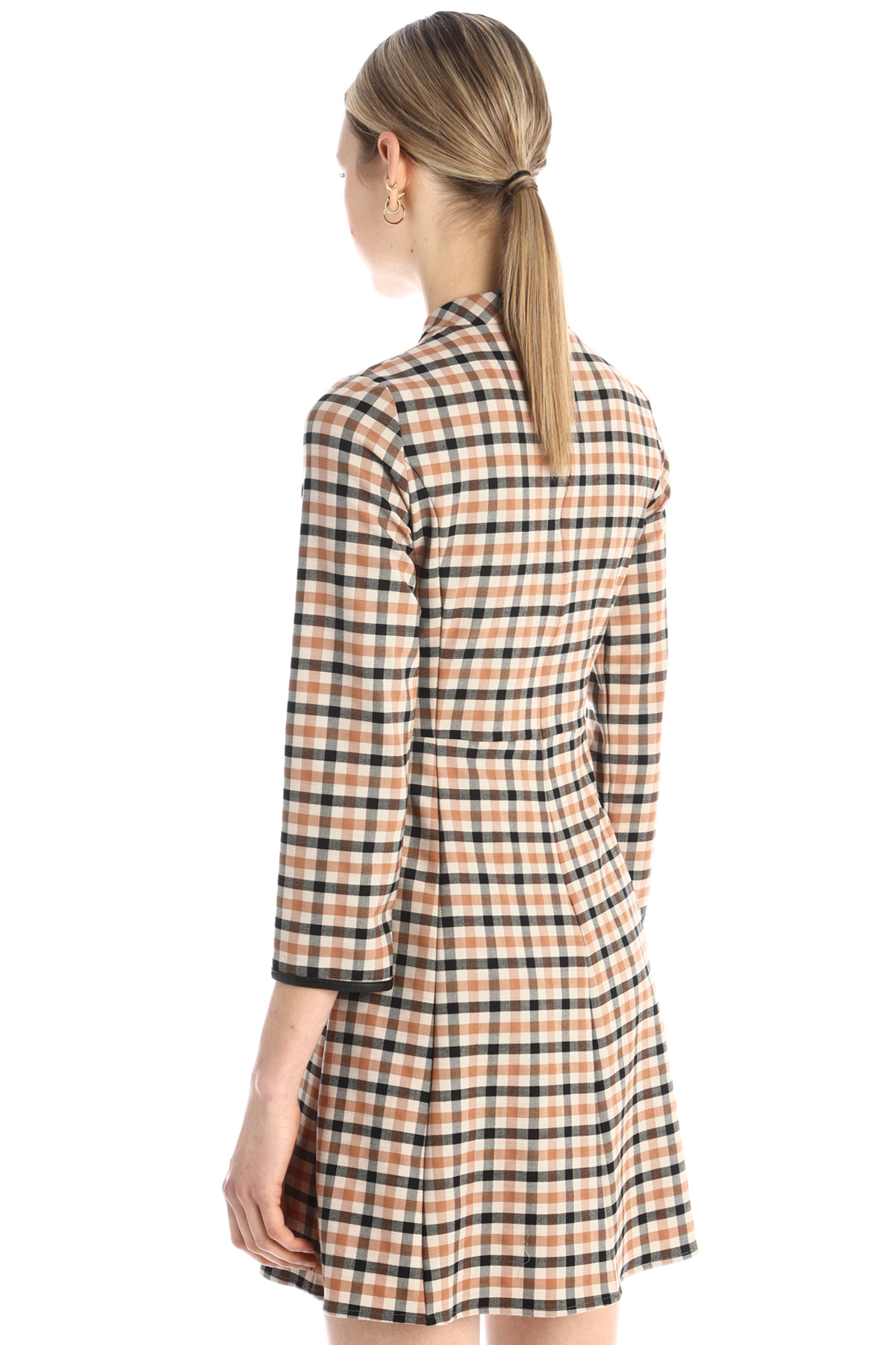 Abito dalla linea svasata realizzato in saglia di misto lana stretch tinto filo, con scollo a giro, maniche lunghe con profili rifiniti in simil pelle e allacciatura tramite zip invisibile. Capo semifoderato.