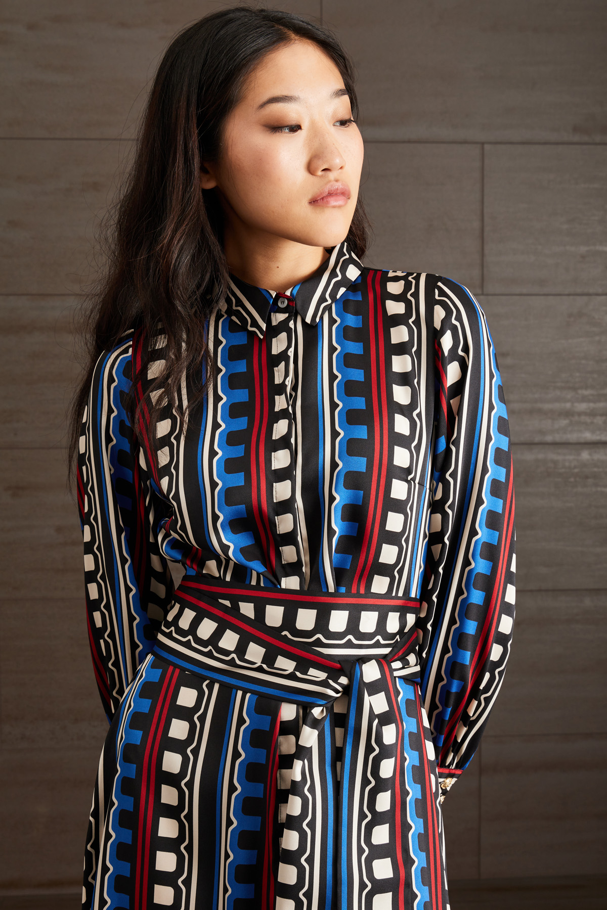 Chemisier dalla linea fluida realizzato in twill stampato, con colletto classico, maniche lunghe con polsino e bottoni, taglio in vita. Allacciatura nascosta tramite bottoni e cintura coordinata.