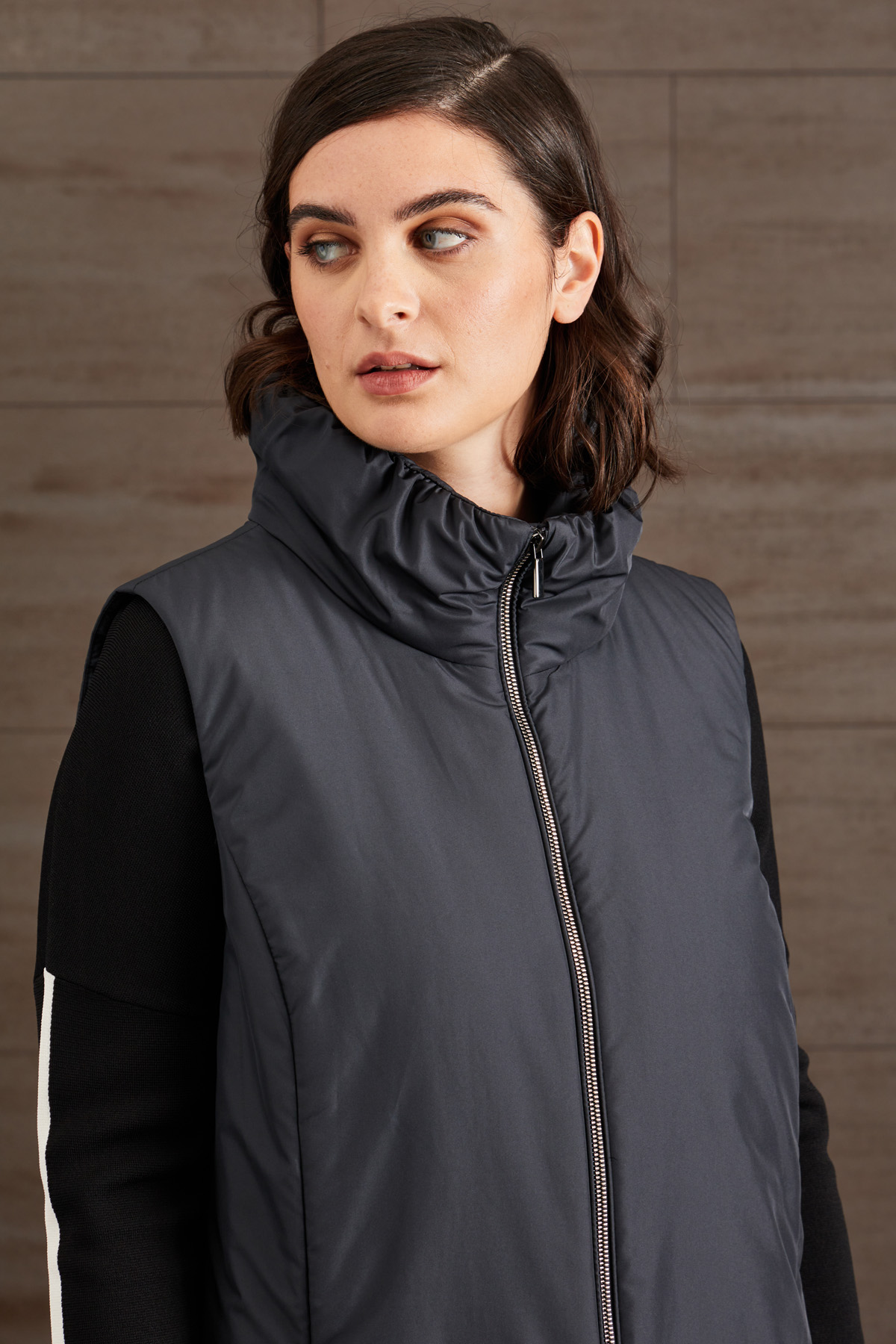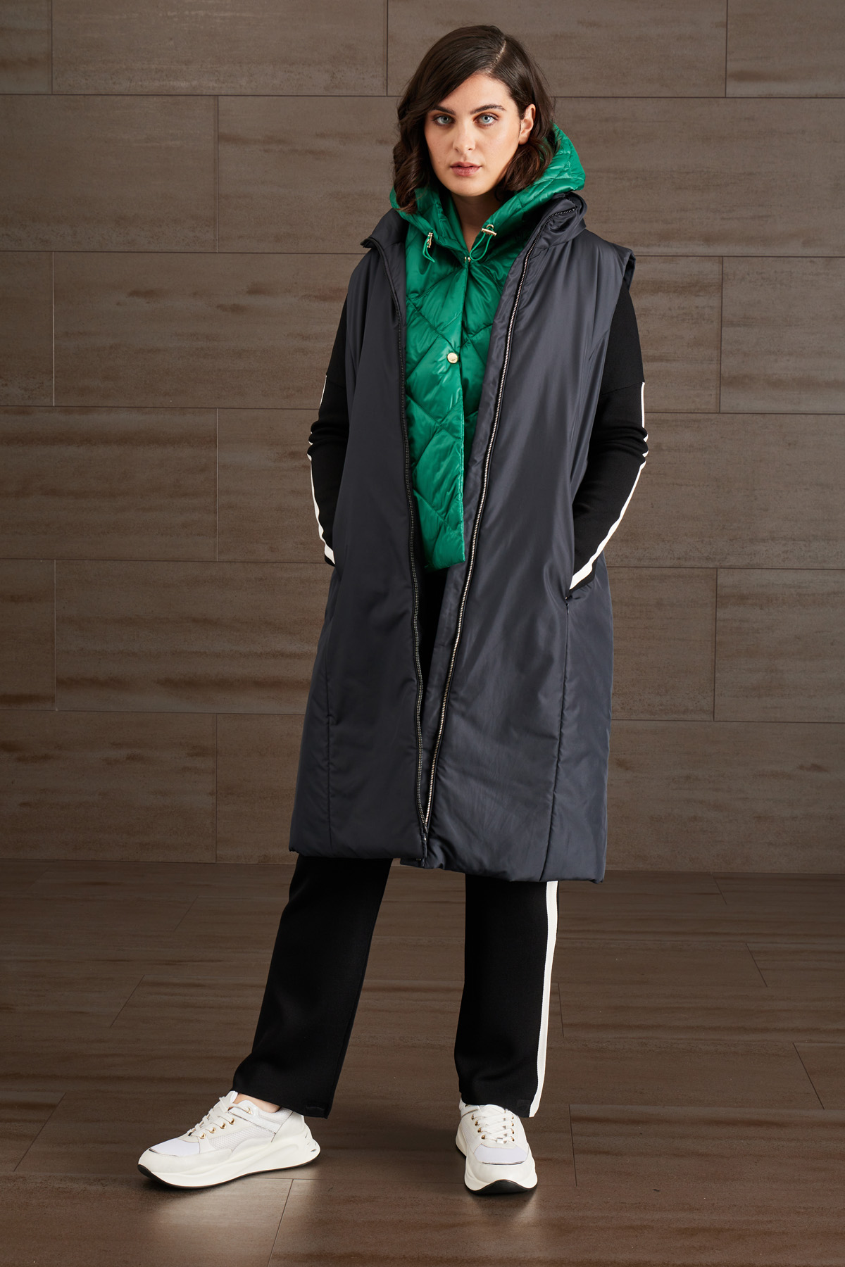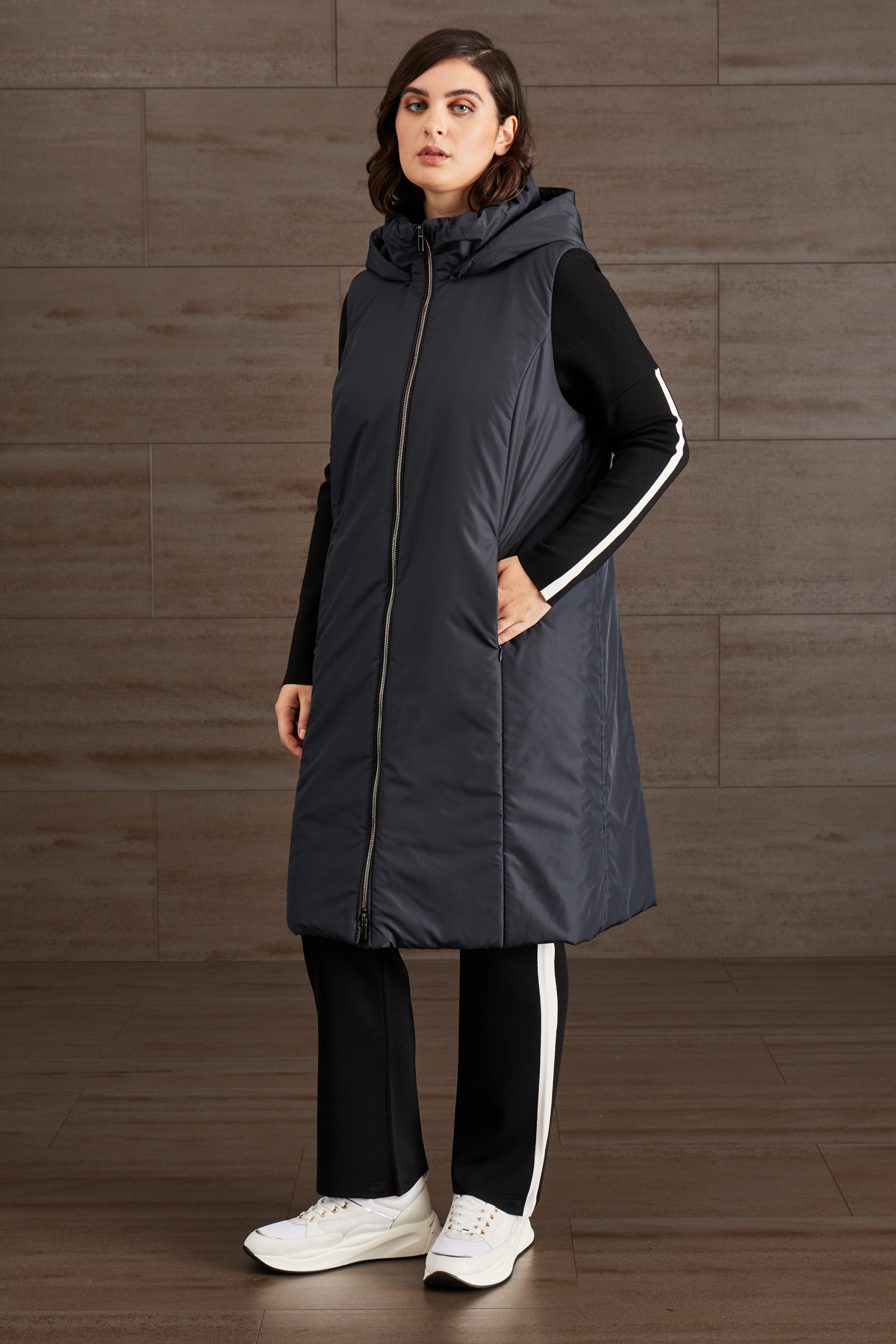 Gilet lungo dalla linea dritta realizzato in taffetà tecnico, con collo alto e cappuccio removibile, tasche inserite in cucituta con zip. Allacciatura tramite zip a doppio cursore.