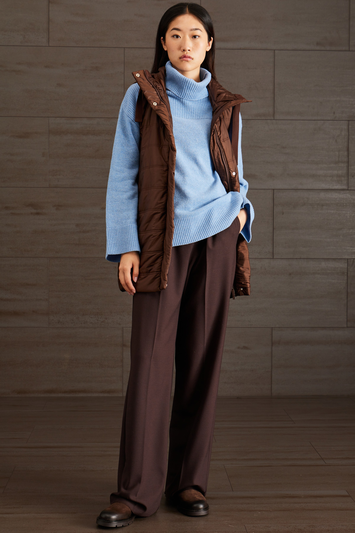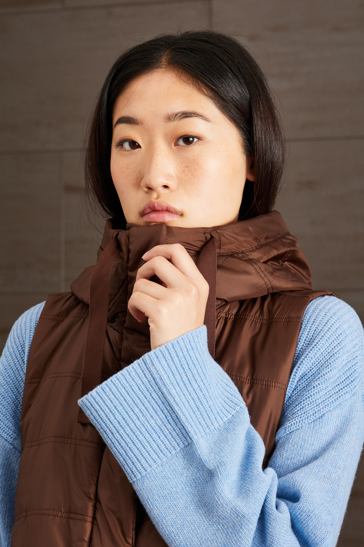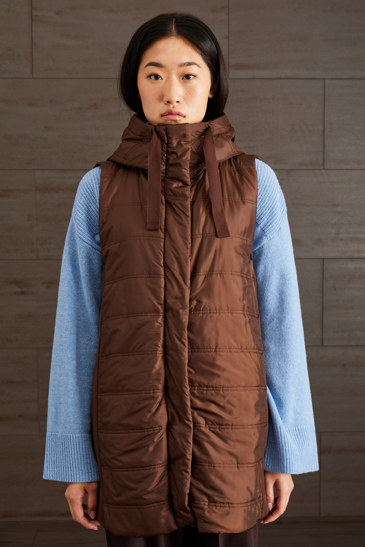 Gilet imbottito dalla linea dritta realizzato in tessuto tecnico antigoccia trapuntato co inserti in gros grain, collo alto con coulisse e tasche inserite in cucitura. Allacciatura tramite zip a doppio cursore e bottoni a pressione.