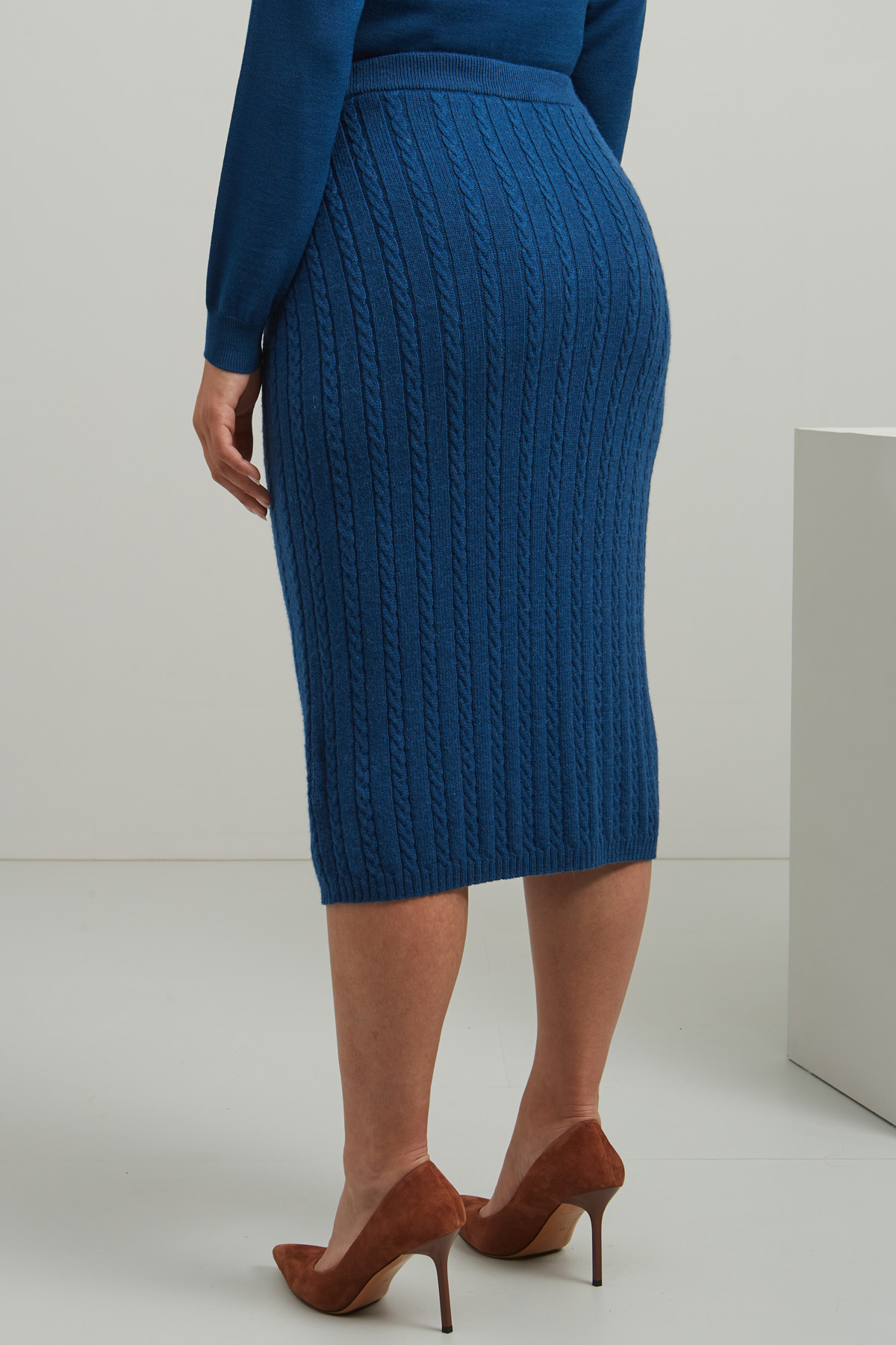 Gonna a tubino realizzata in filato di misto lana e alpaca, con inserto elastico in vita e lavorazione a trecce. Capo foderato.