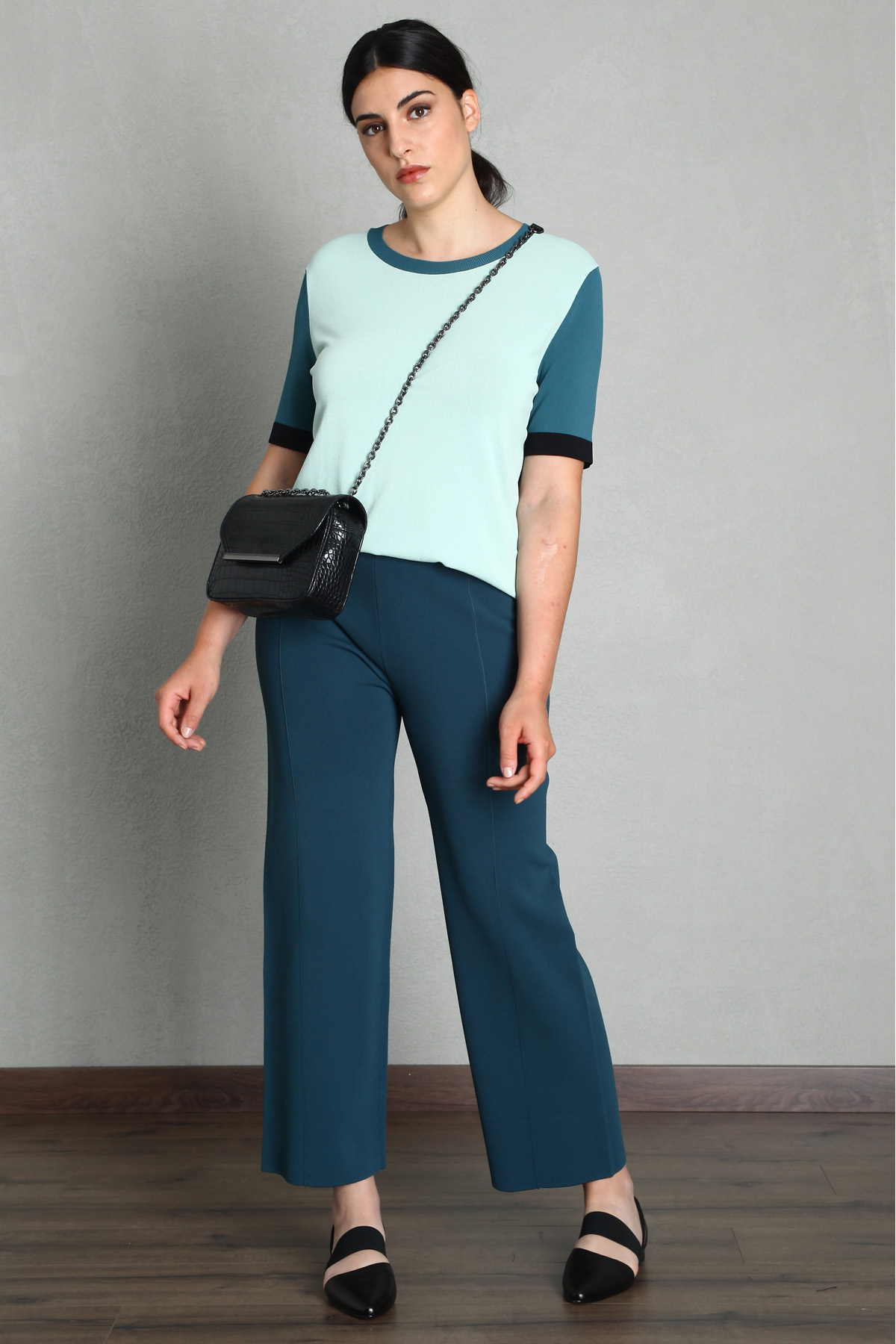 Pantaloni dalla linea dritta e morbida realizzati in maglia di misto viscosa, con inserto elastico in vita e piega cucita lungo la gamba.