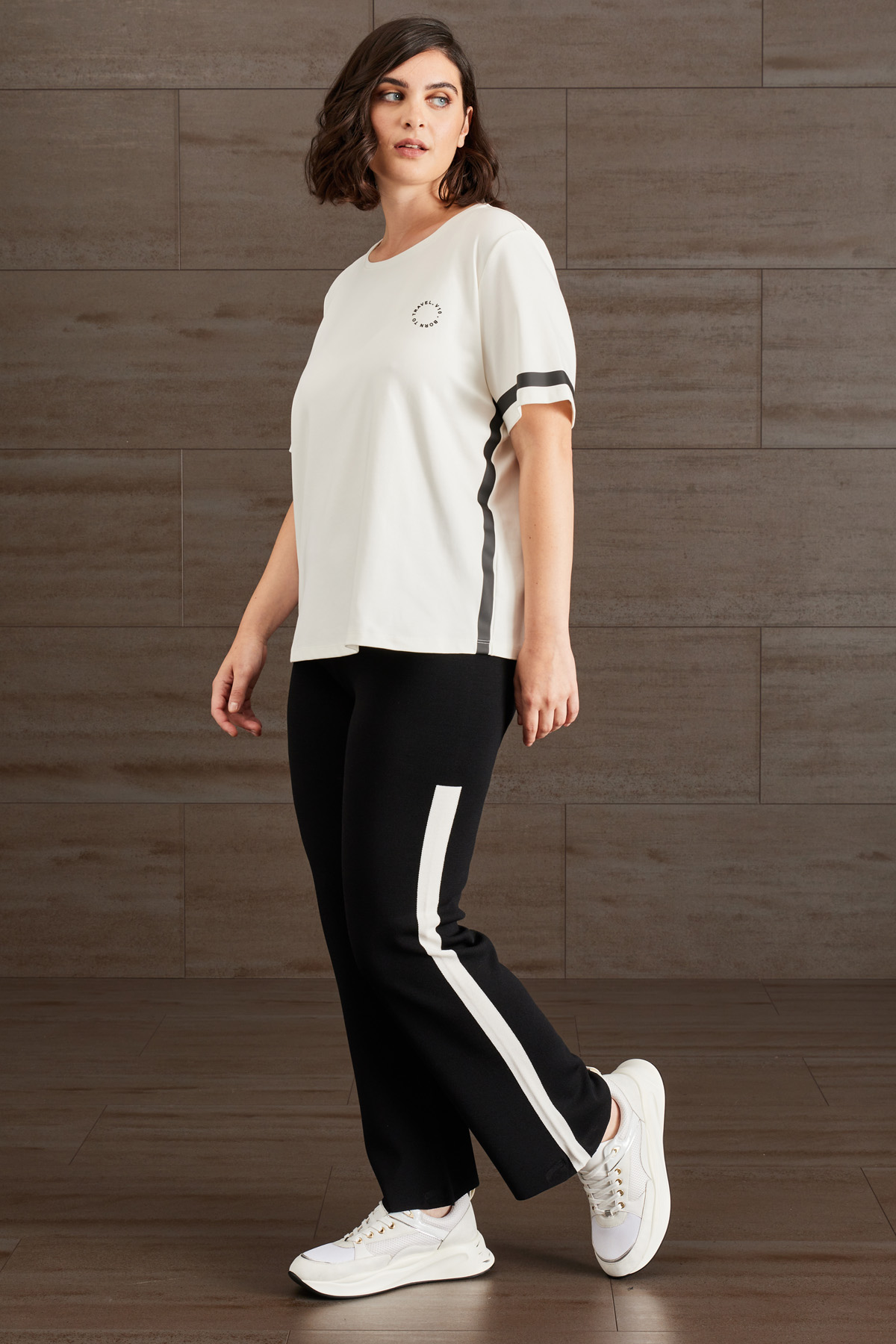 Pantaloni jogger dalla linea aderente realizzati in filato di misto viscosa con motivo a contrasto sui lati, e inserto elastico in vita.