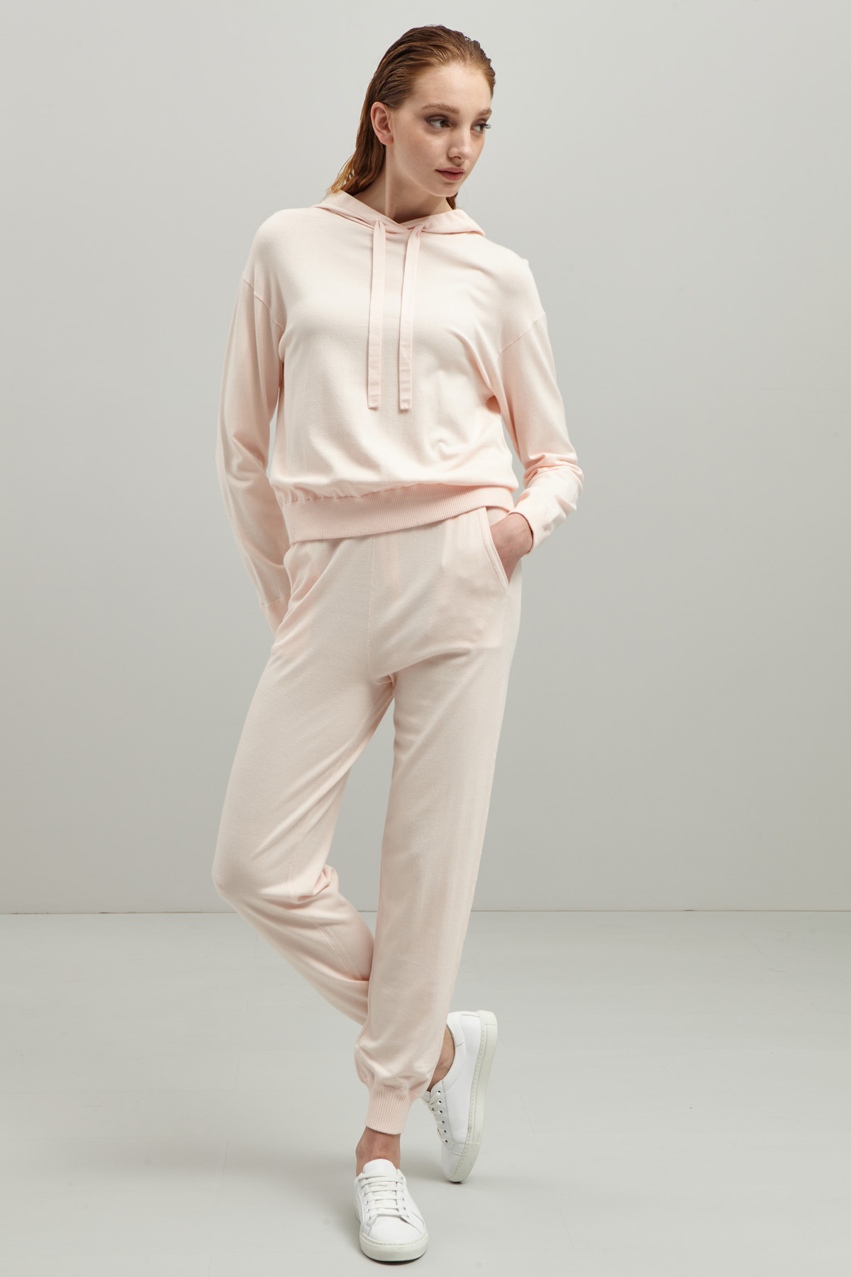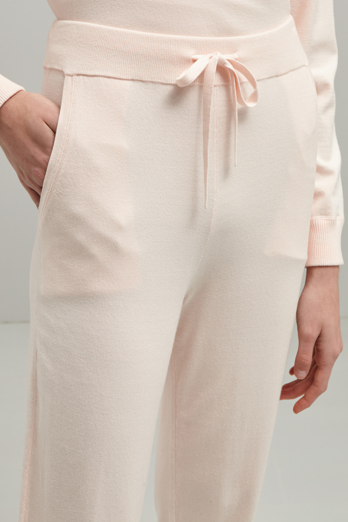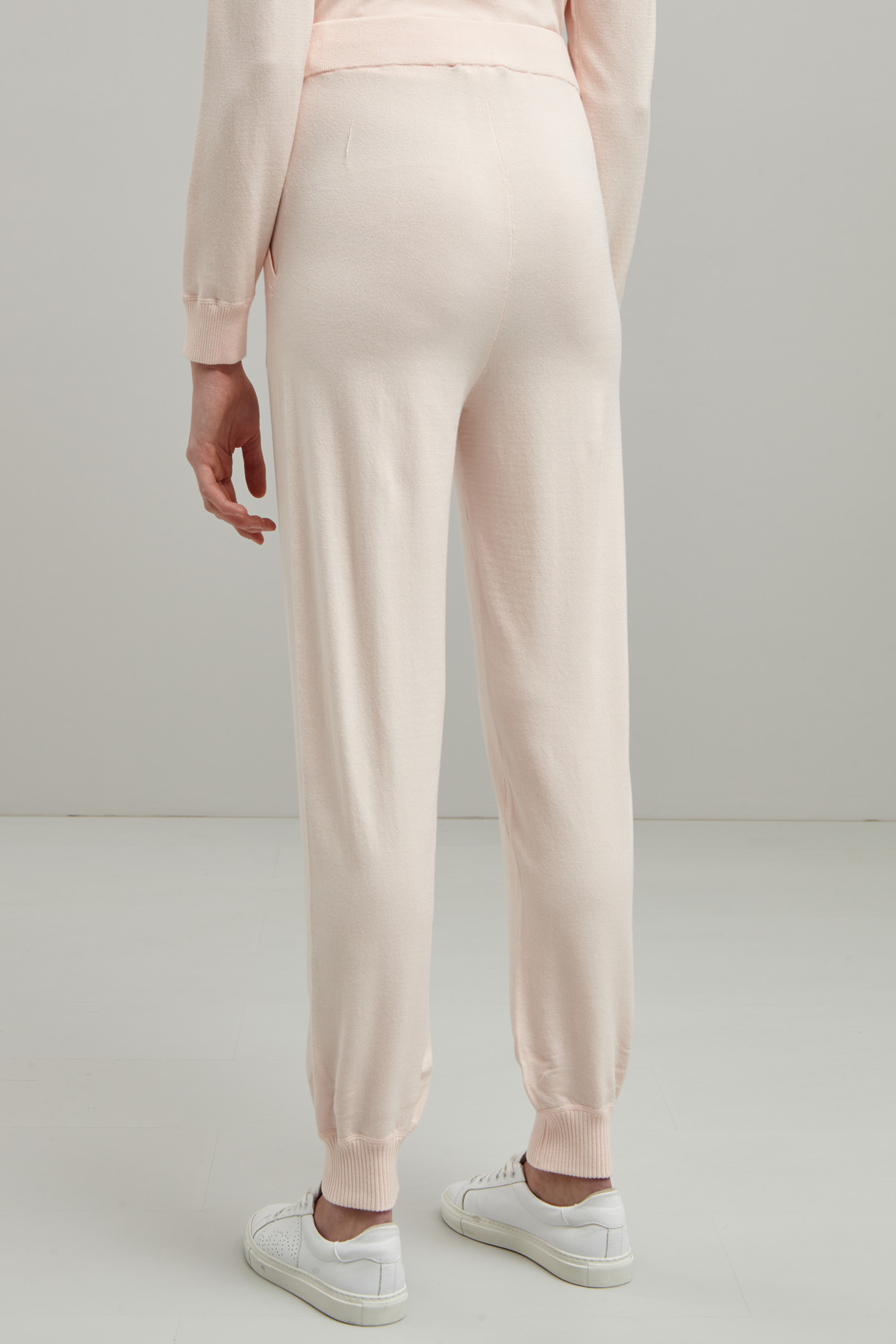 Jogger stretti al fondo realizzati in maglia di misto viscosa, con inserto elastico e coulisse in vita, tasche alla francese e profili rifiniti a coste.