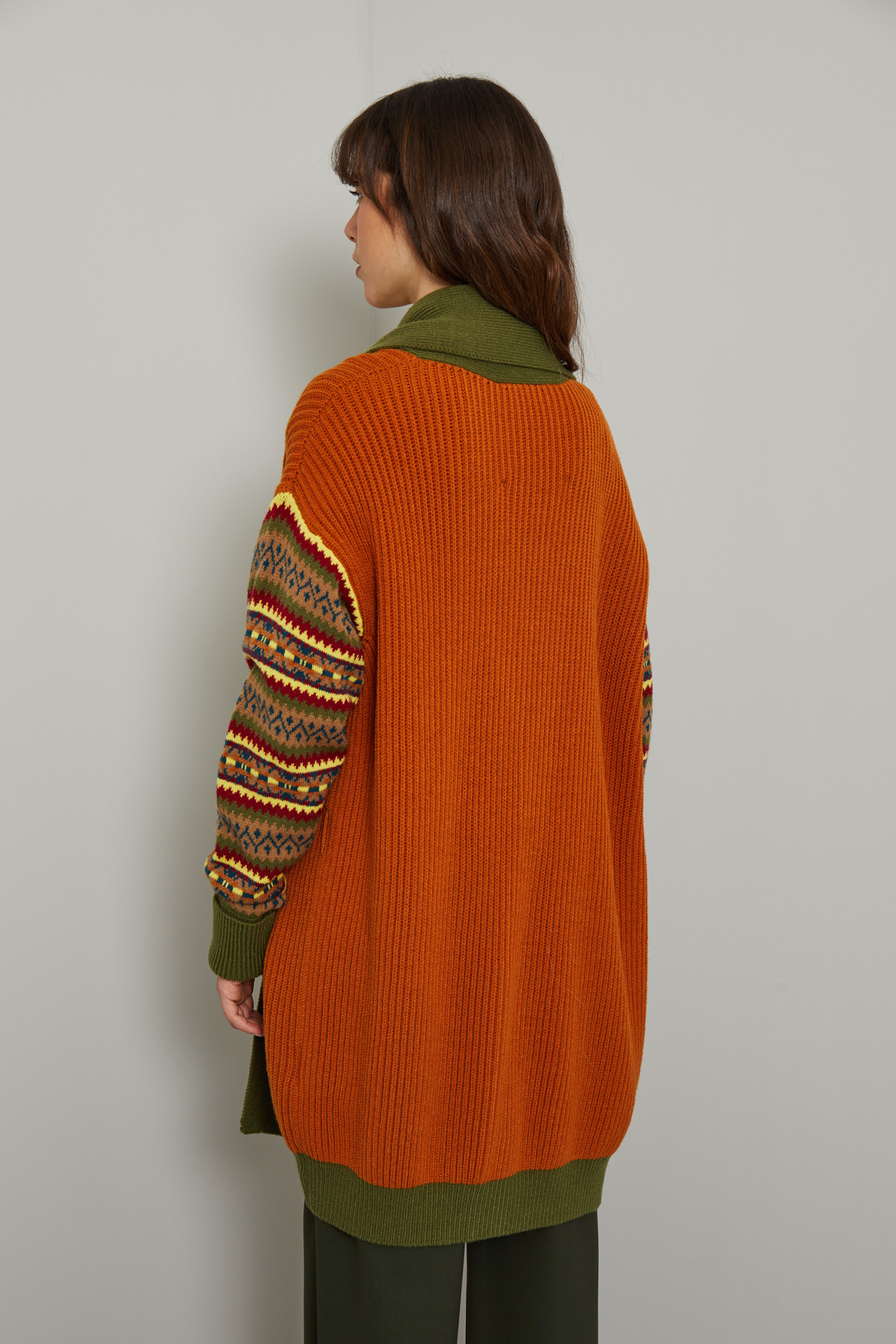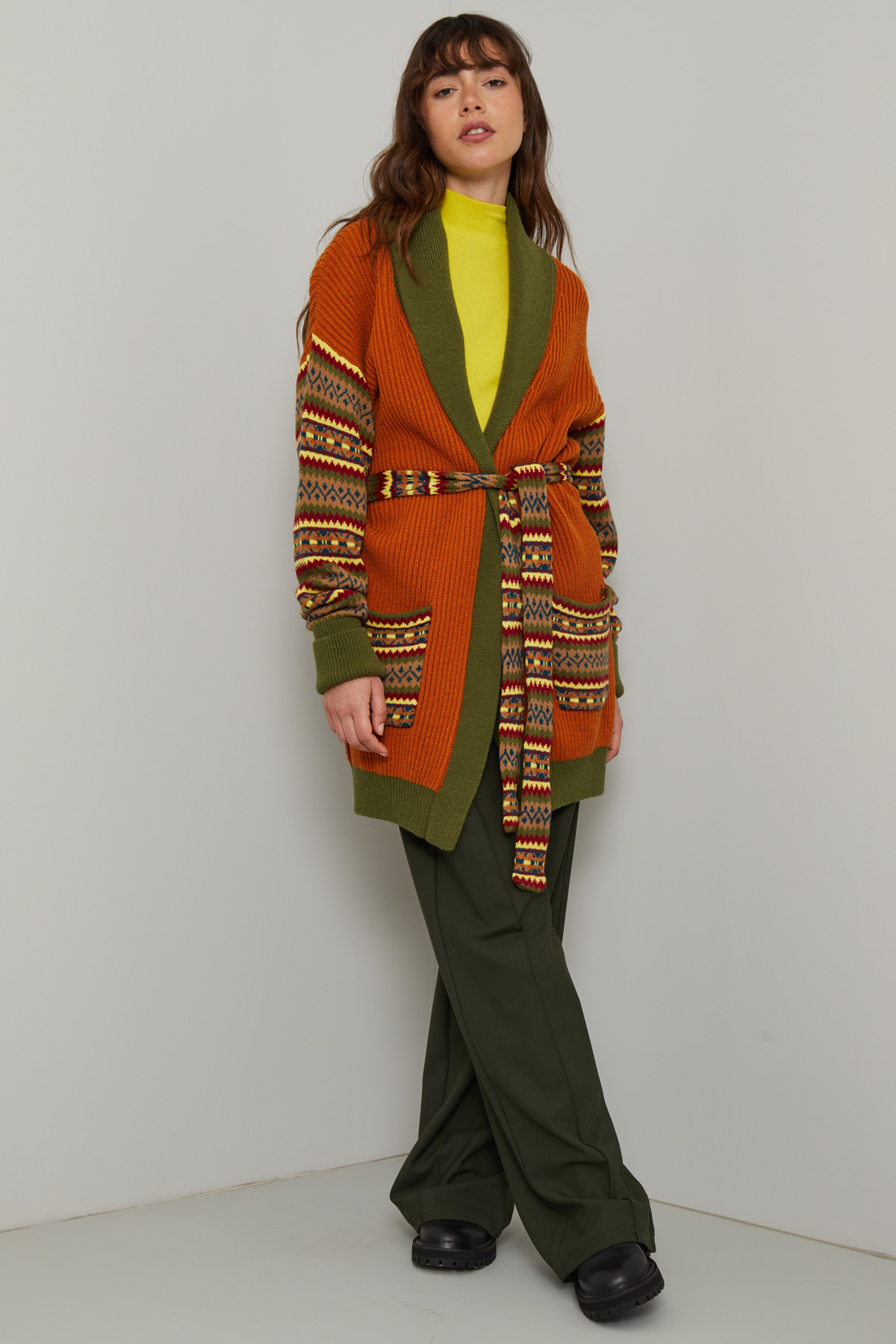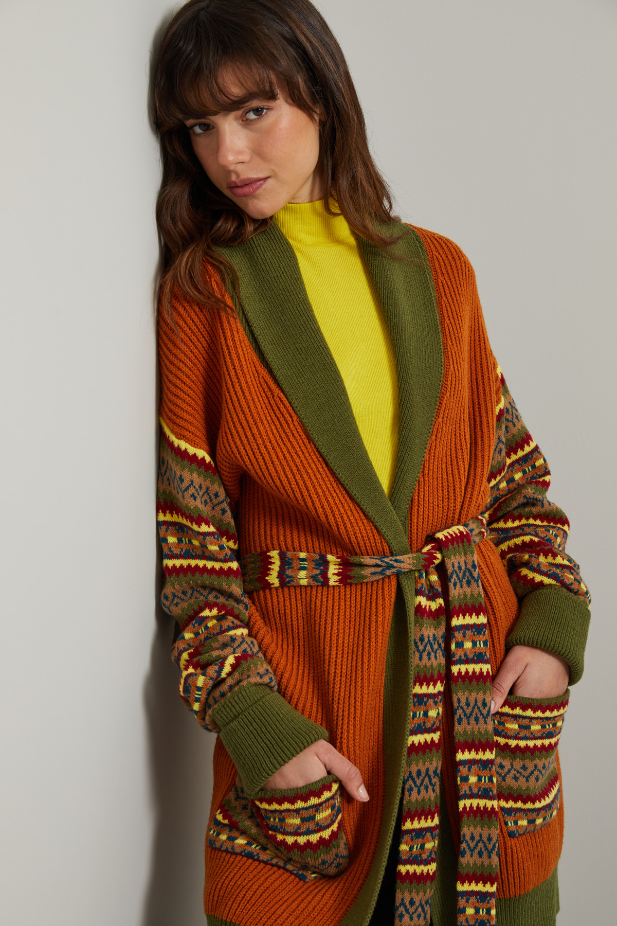 Cardigan lungo dalla linea morbida realizzato in maglia di misto lana tinto filo, con collo sciallato, maniche lunghe dal giro sceso, tasche applicate sul davanti e allacciatura tramite cintura coordinata.