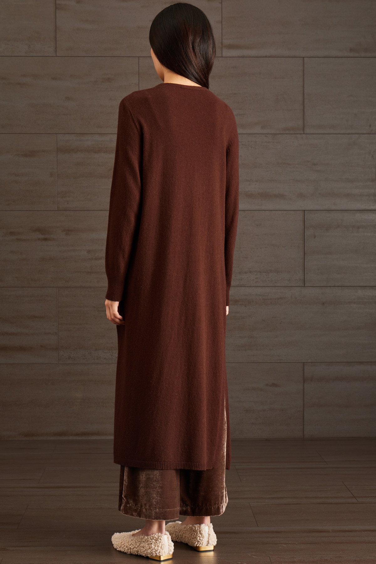 Cardigan lungo dalla linea morbida realizzato in filato di misto lana, viscosa e cashmere, con scollo a V, maniche lunghe, spacchi laterali e profili rifiniti a coste. Allacciatura tramite bottoni a vista.