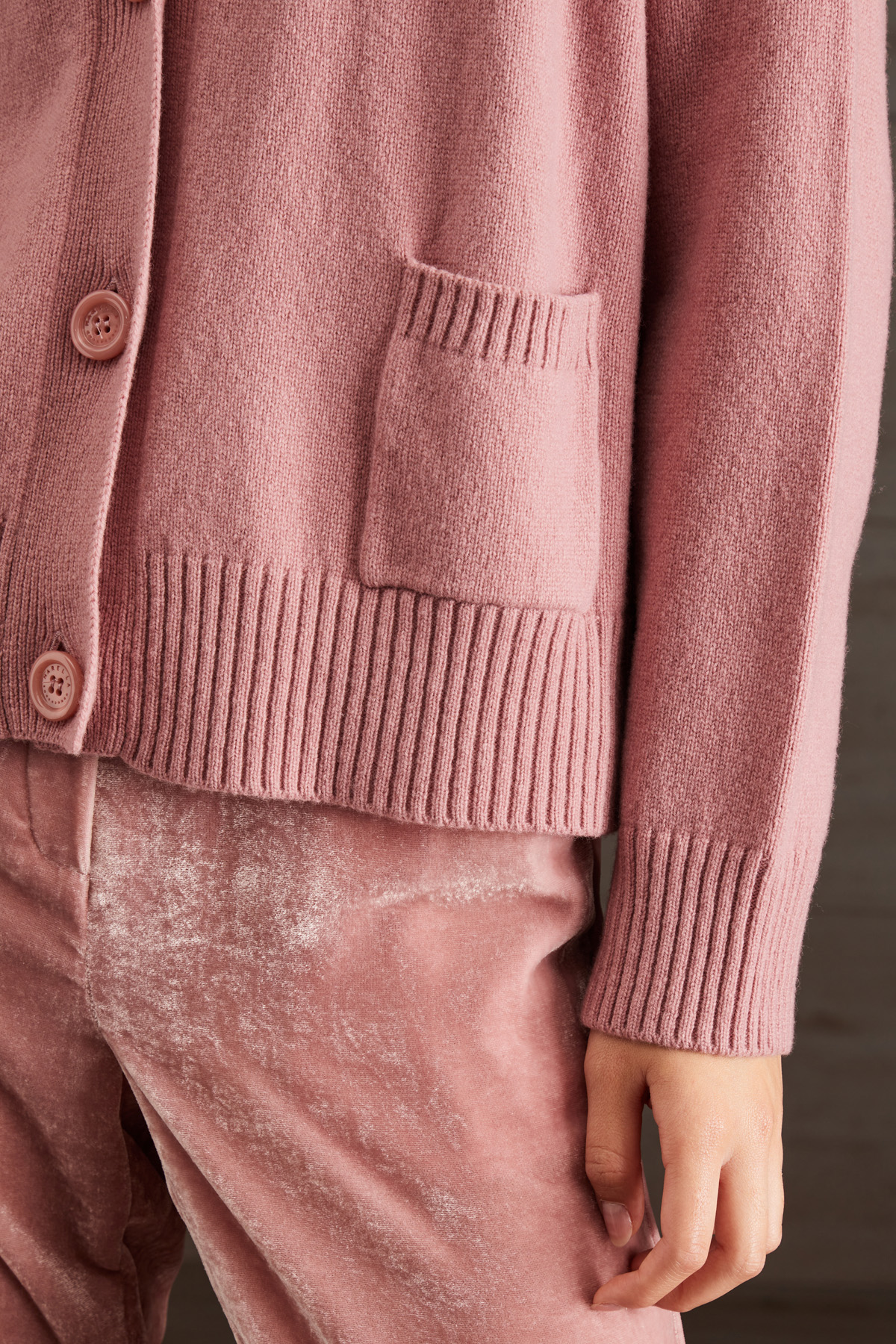 Cardigan corto dalla linea dritta realizzato in filato di pura lana, con scollo a V, maniche lunghe con spacchetti, taschini applicati sul davanti e profili rifiniti a coste. Allacciatura tramite bottoni a vista.