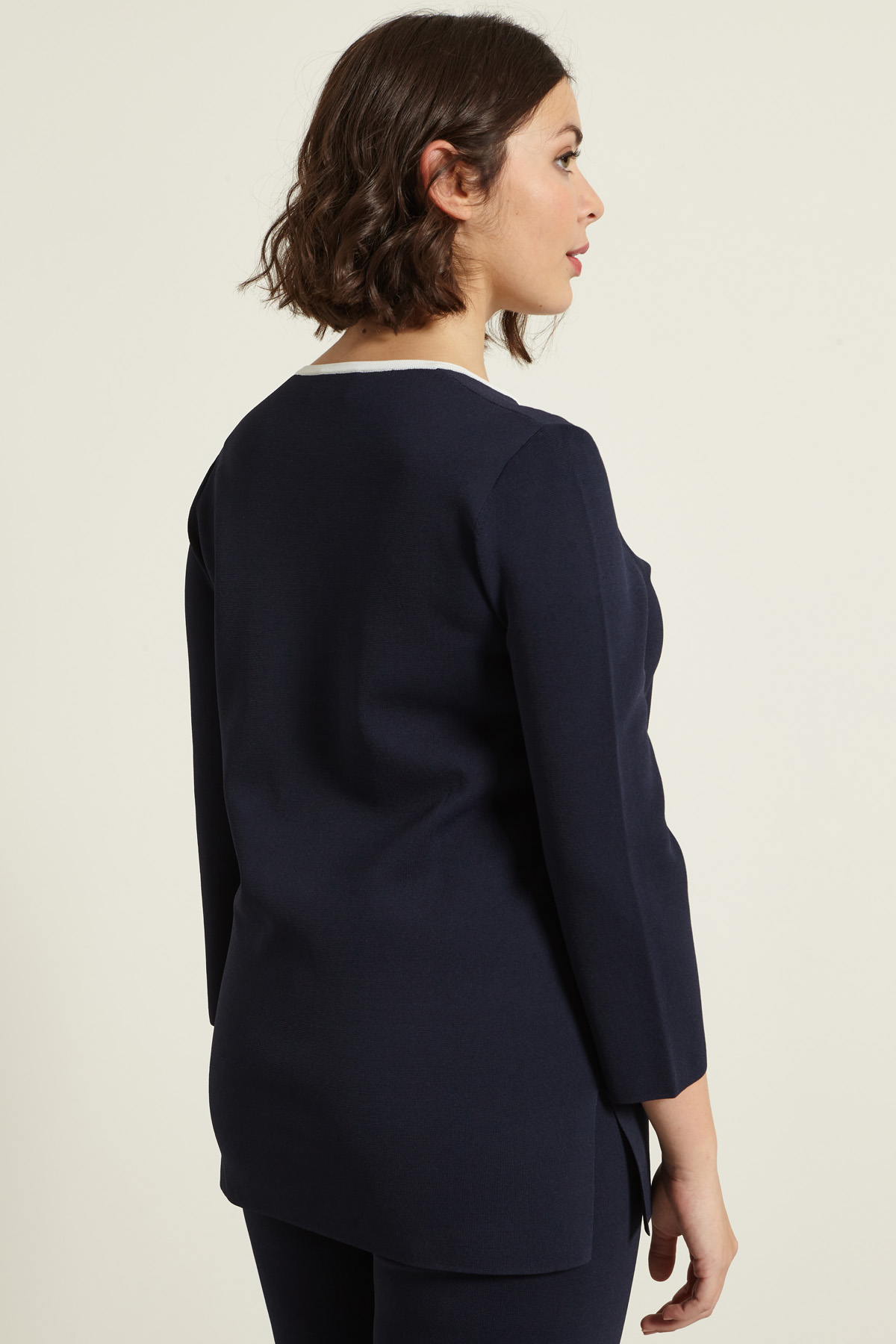 Maglia dalla linea dritta realizzata in filato crépe di misto viscosa, con scollo rotondo e apertura a V, maniche a tre quarti e spacchetti al fondo.