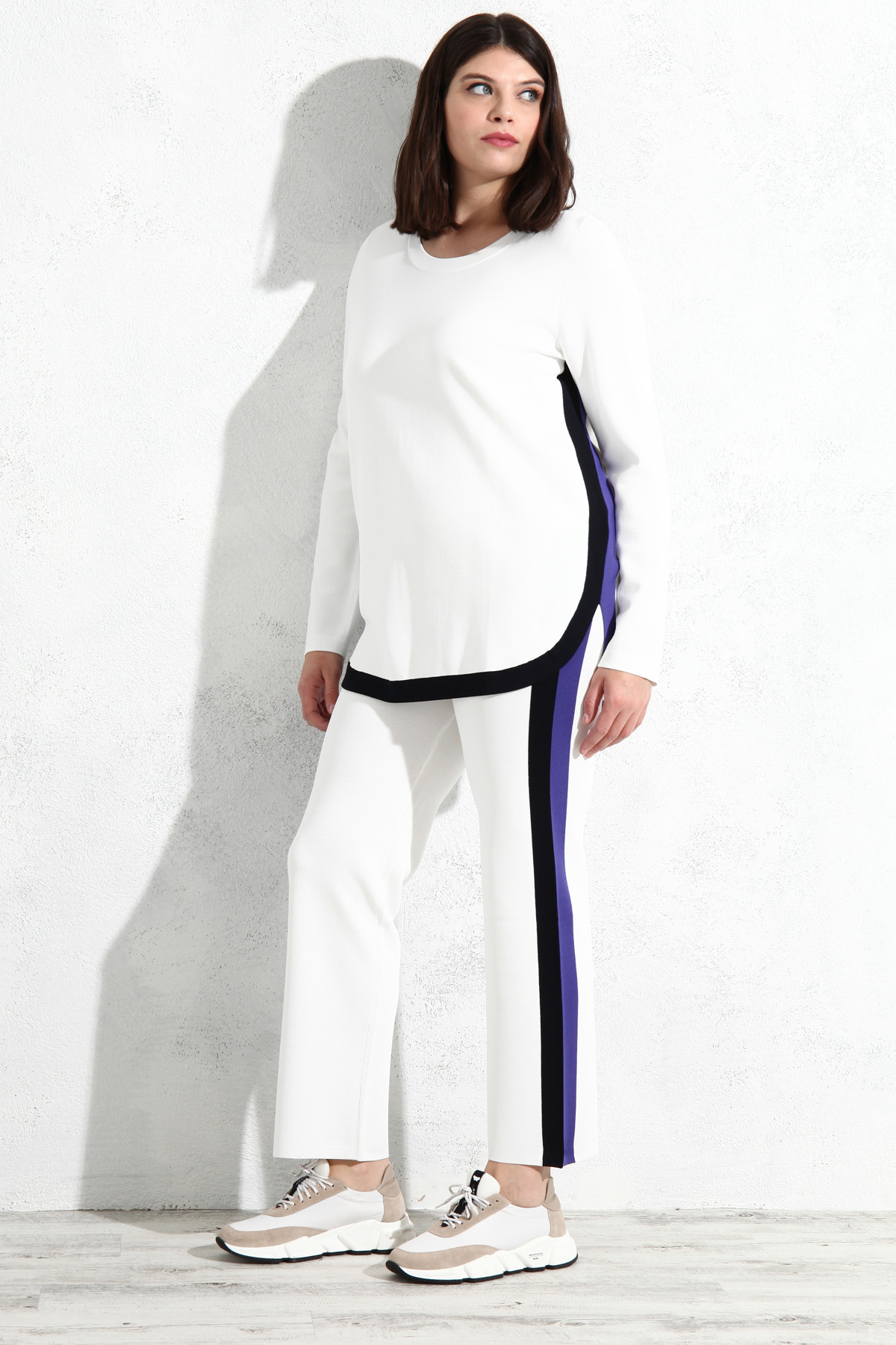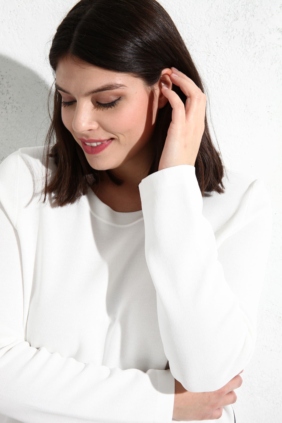 Maglia dalla linea dritta realizzata in filato di viscosa, con motivo ad intarsio, scollo rotondo, maniche lunghe e spacchi al fondo.