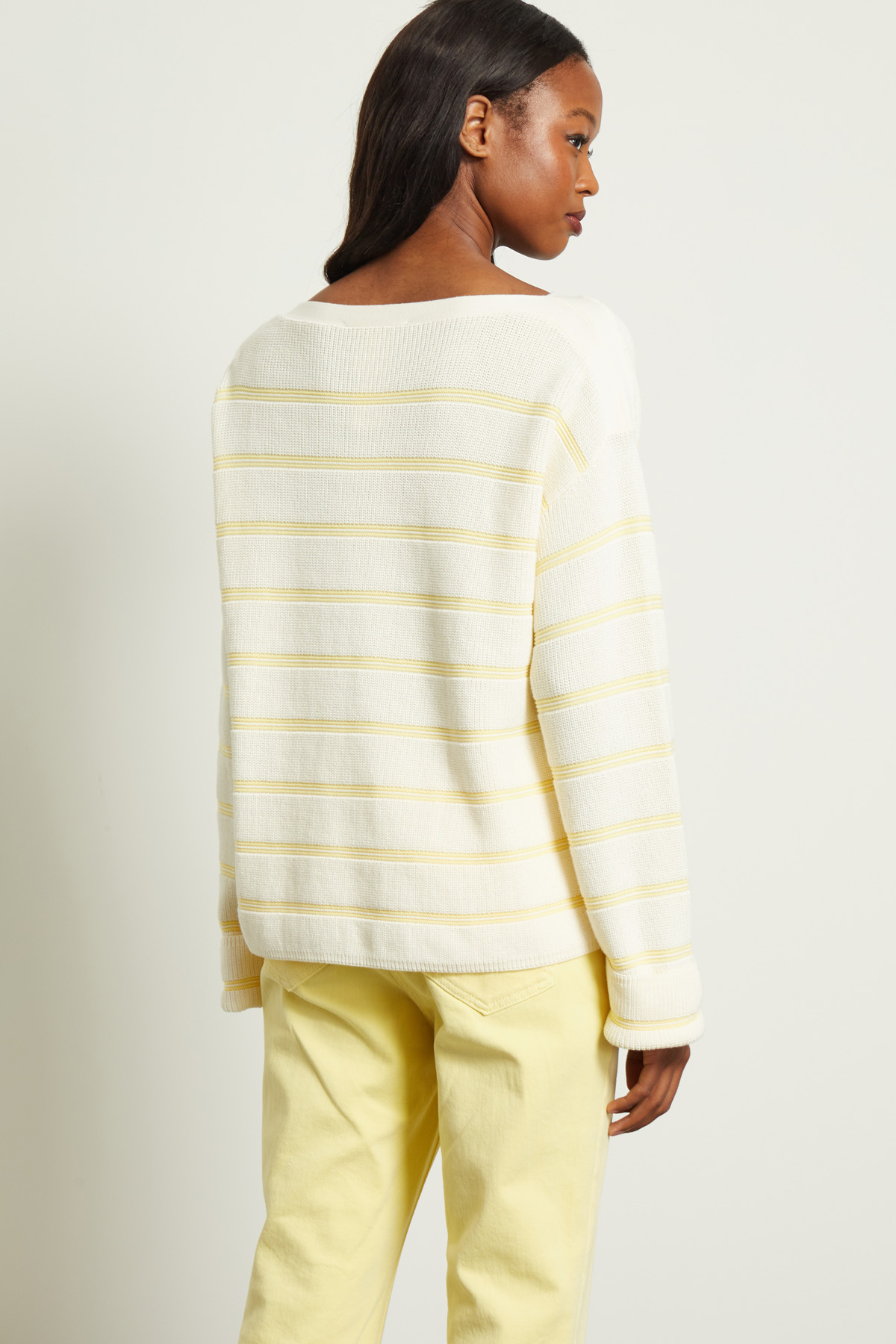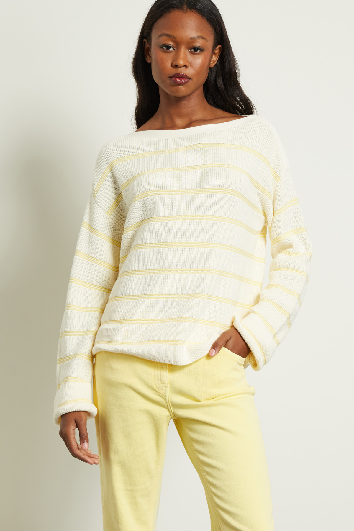 Maglia dalla linea morbida realizzata in filato di cotone con lavorazione a rilievo, scollo a barchetta, maniche lunghe dal giro sceso e risvolto al fondo.