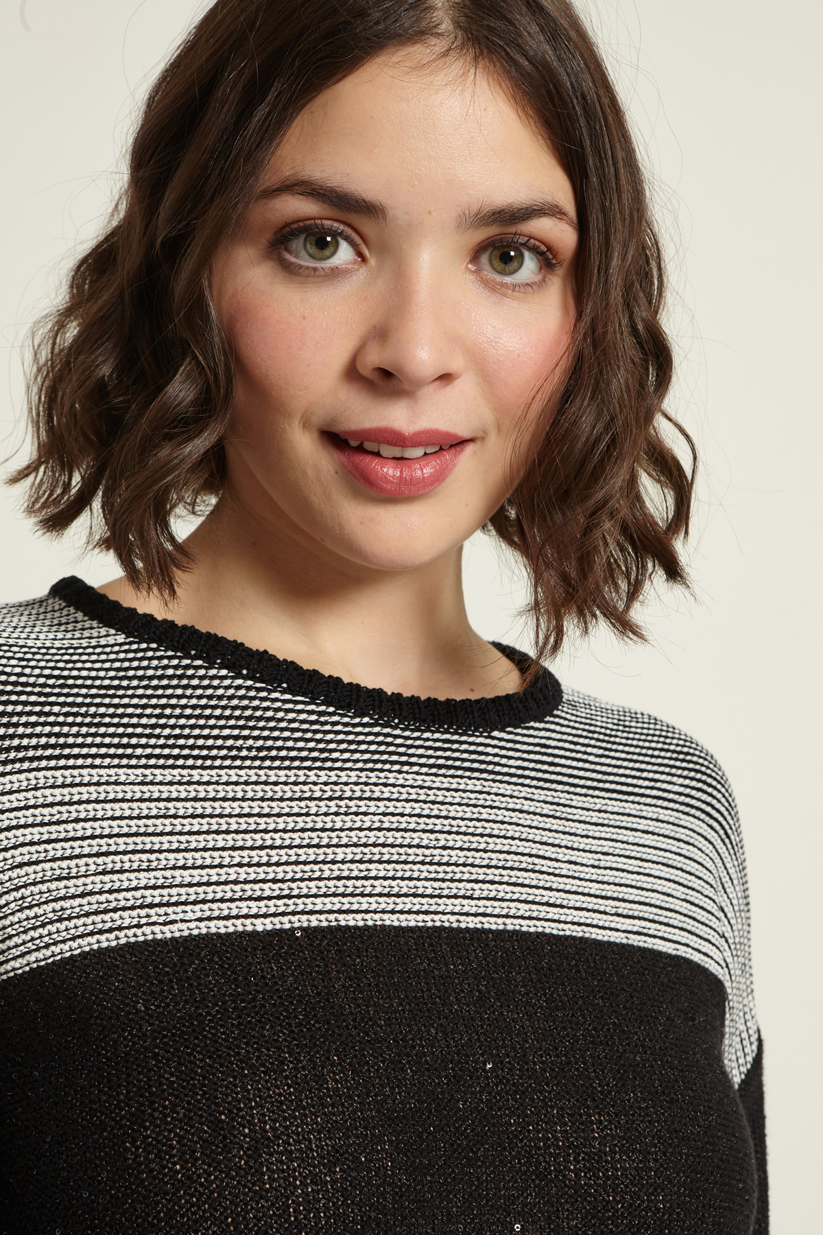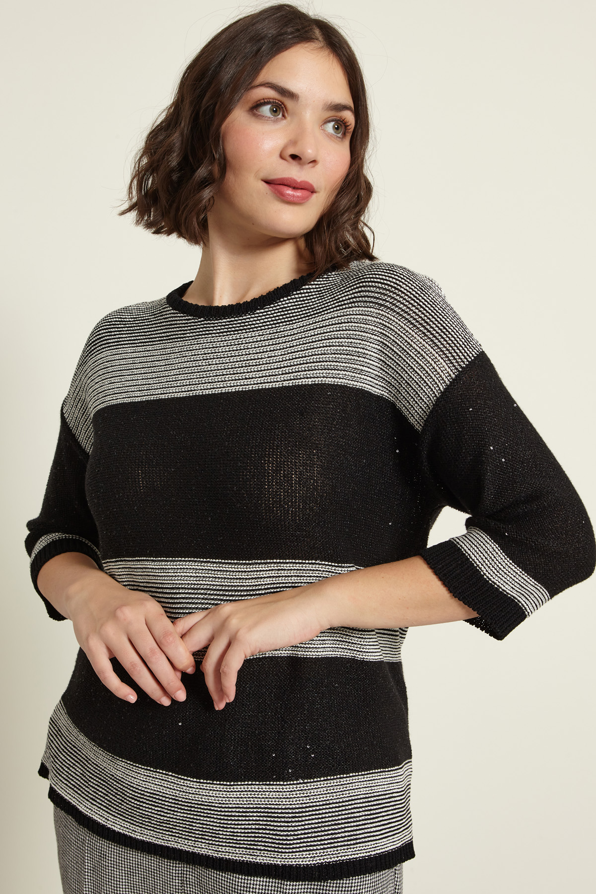 Maglia dalla linea regolare realizzata in filato di puro cotone tinto filo, con micro paillettes ricamate, scollo rotondo, maniche a tre quarti e profili rifiniti a coste.
