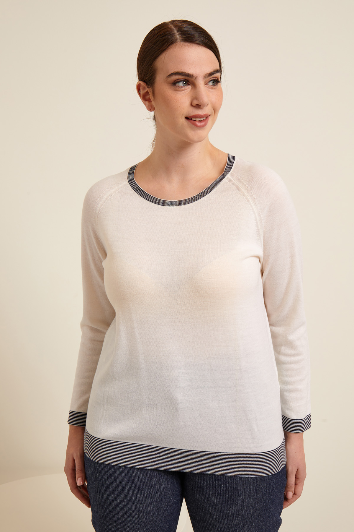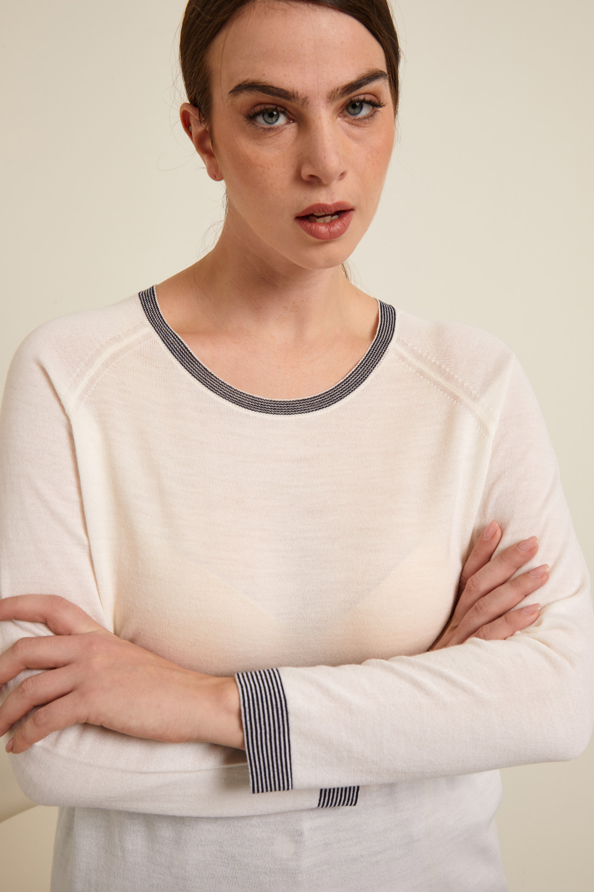 Maglia dalla linea dritta realizzata in filato di pura lana, con scollo a barchetta, maniche lunghe raglan e profili rifiniti a contrasto.
