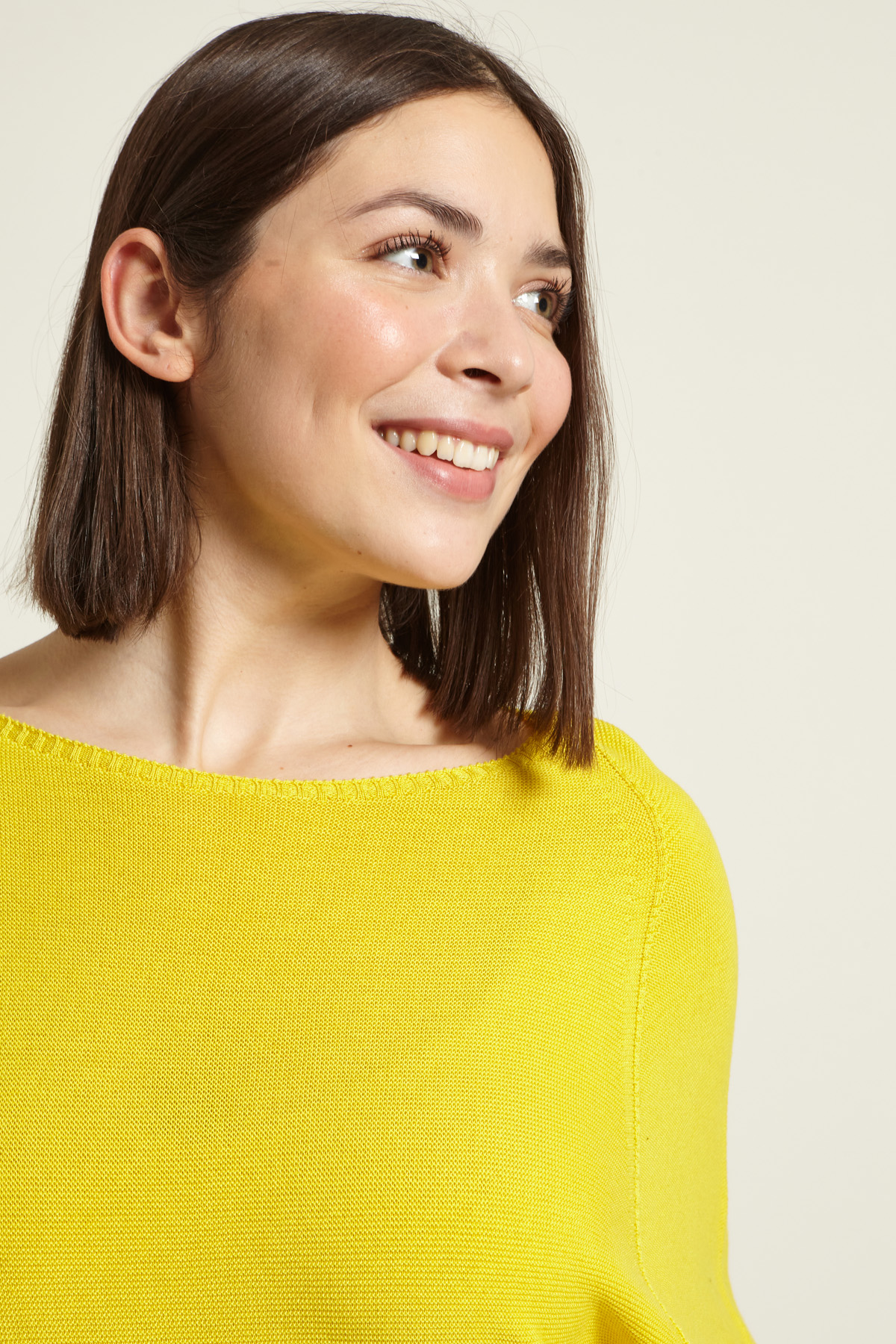 Maglia dalla linea regolare realizzata in filato crépe di puro cotone, con scollo a barchetta e maniche corte raglan.