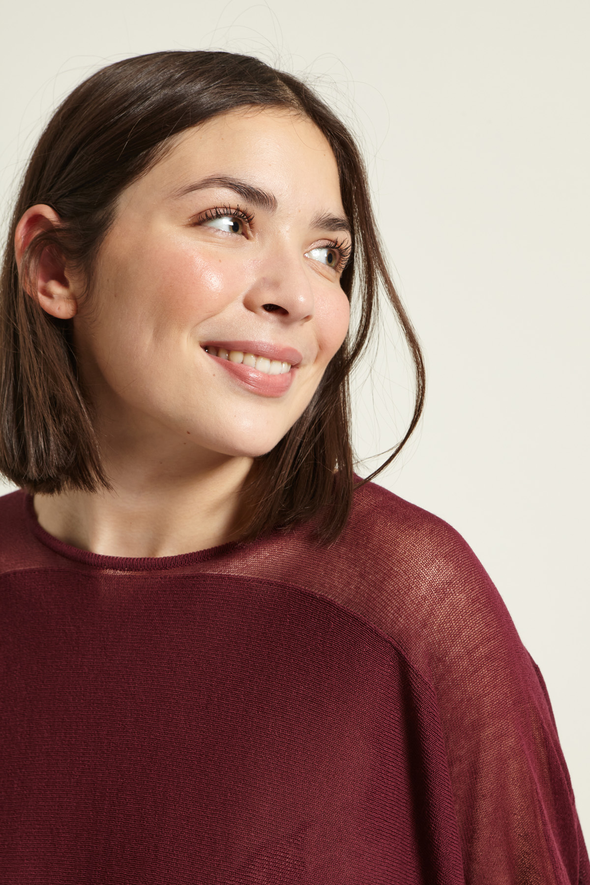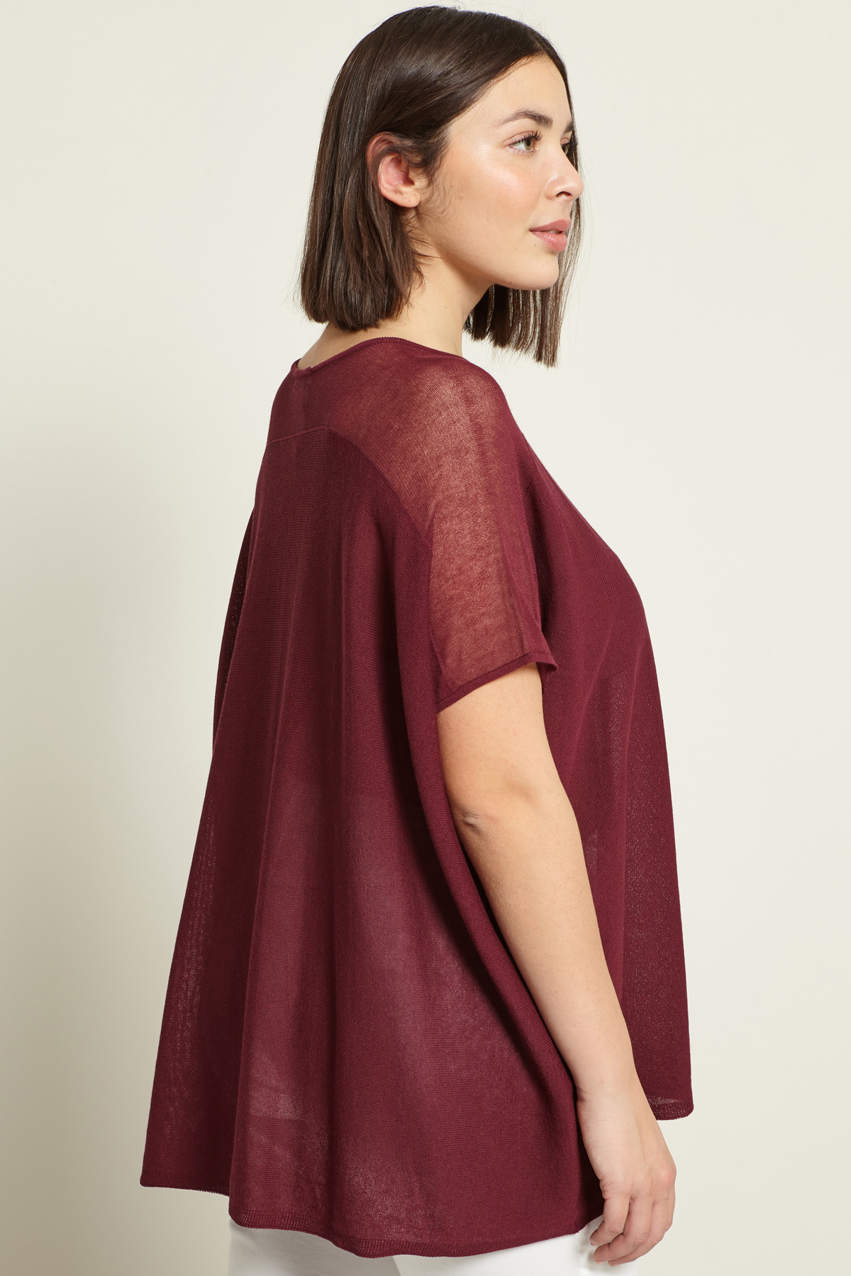 Maglia dalla linea morbida realizzata in filato crépe di misto viscosa, con motivo in trasparenza sulle spalle, scollo rotondo e maniche corte a kimono.