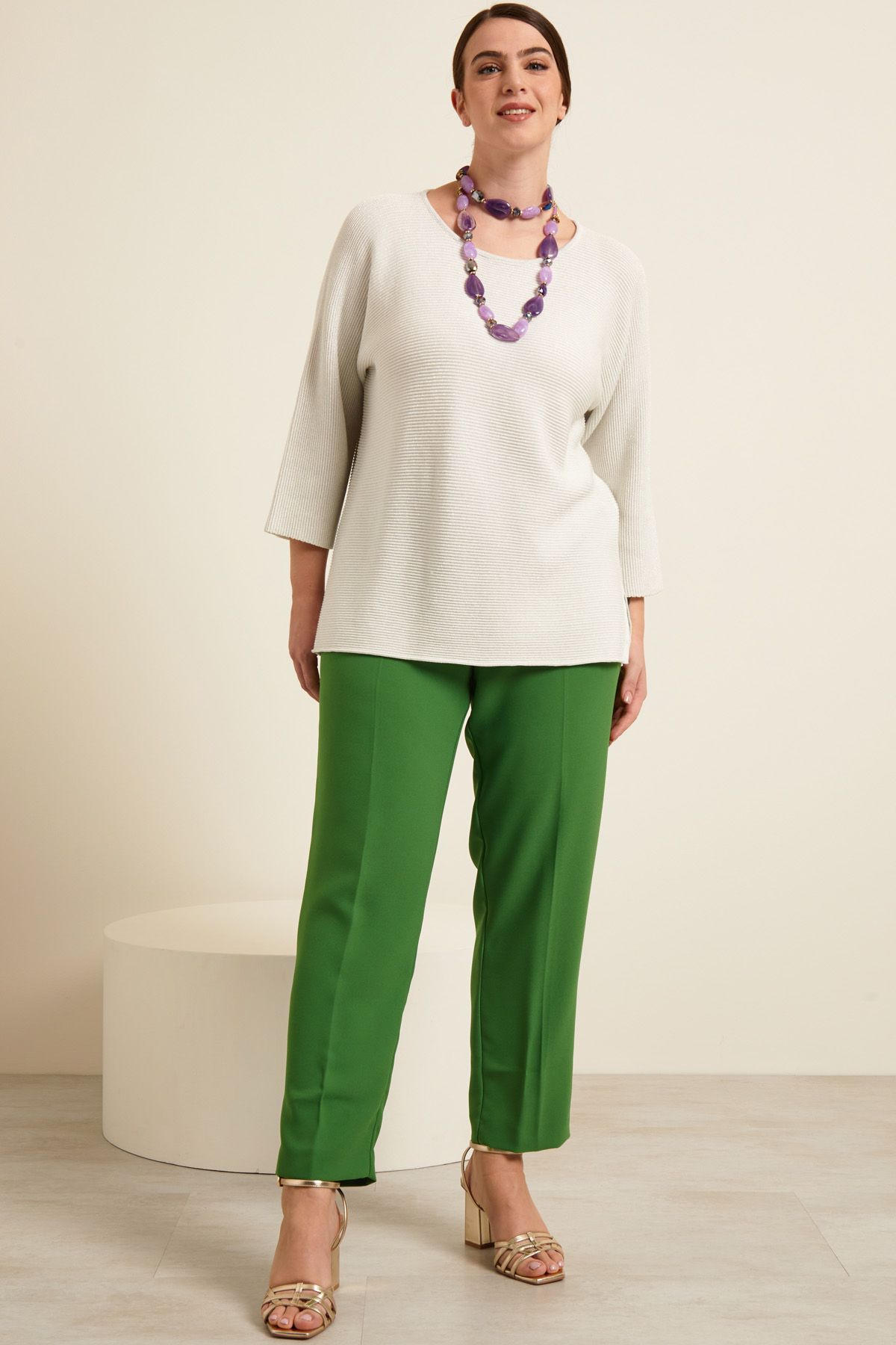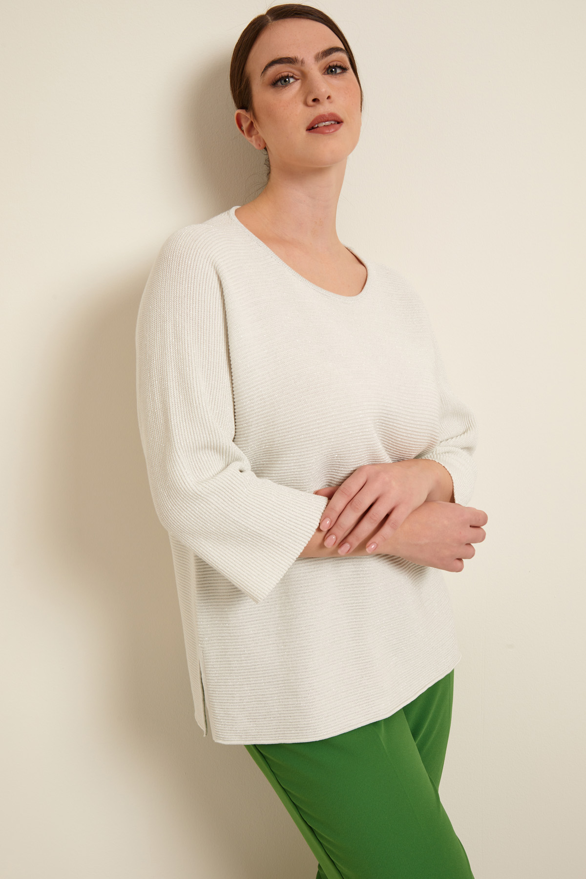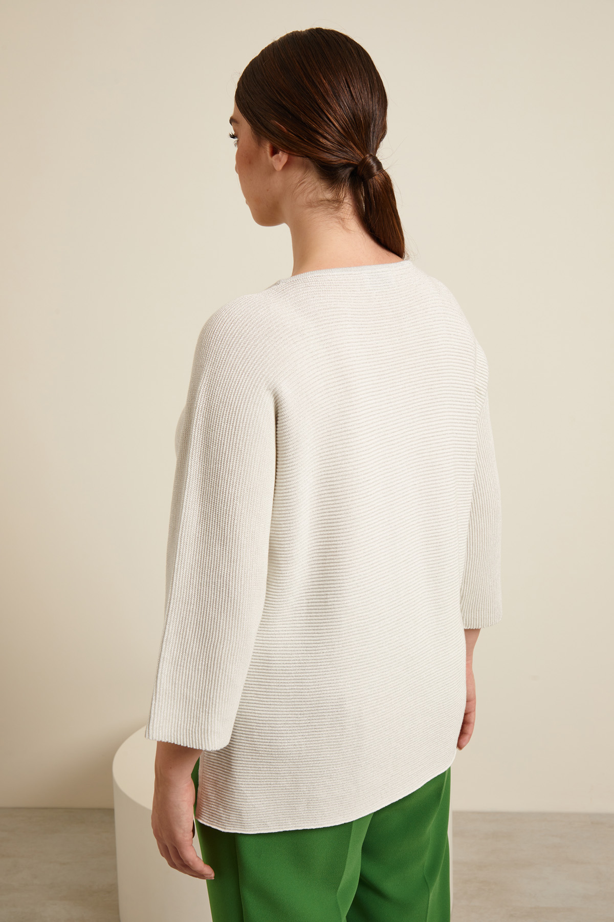 Maglia dalla linea dritta realizzata in filato di misto cotone a coste orizzontali, con inserto in fibra lamè, scollo rotondo, maniche tre quarti a kimono e spacchetti laterali a fondo capo.