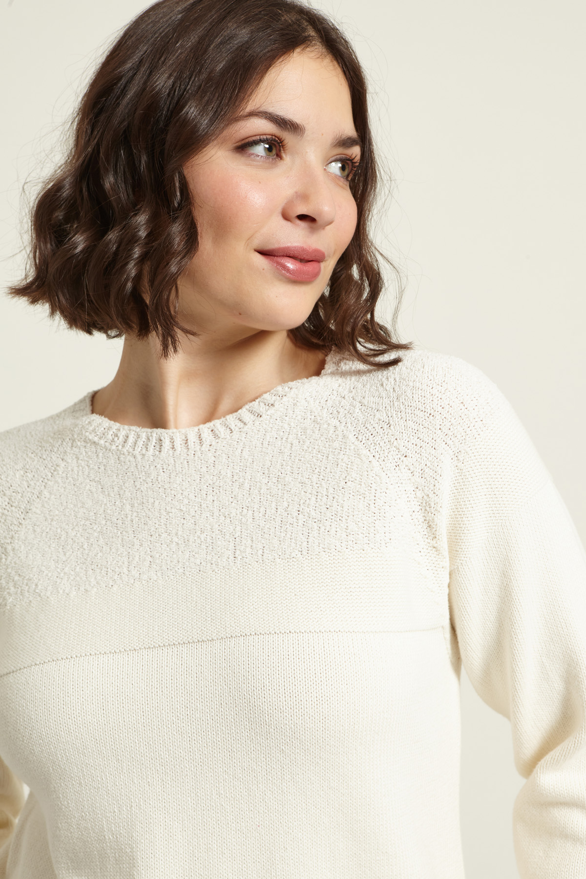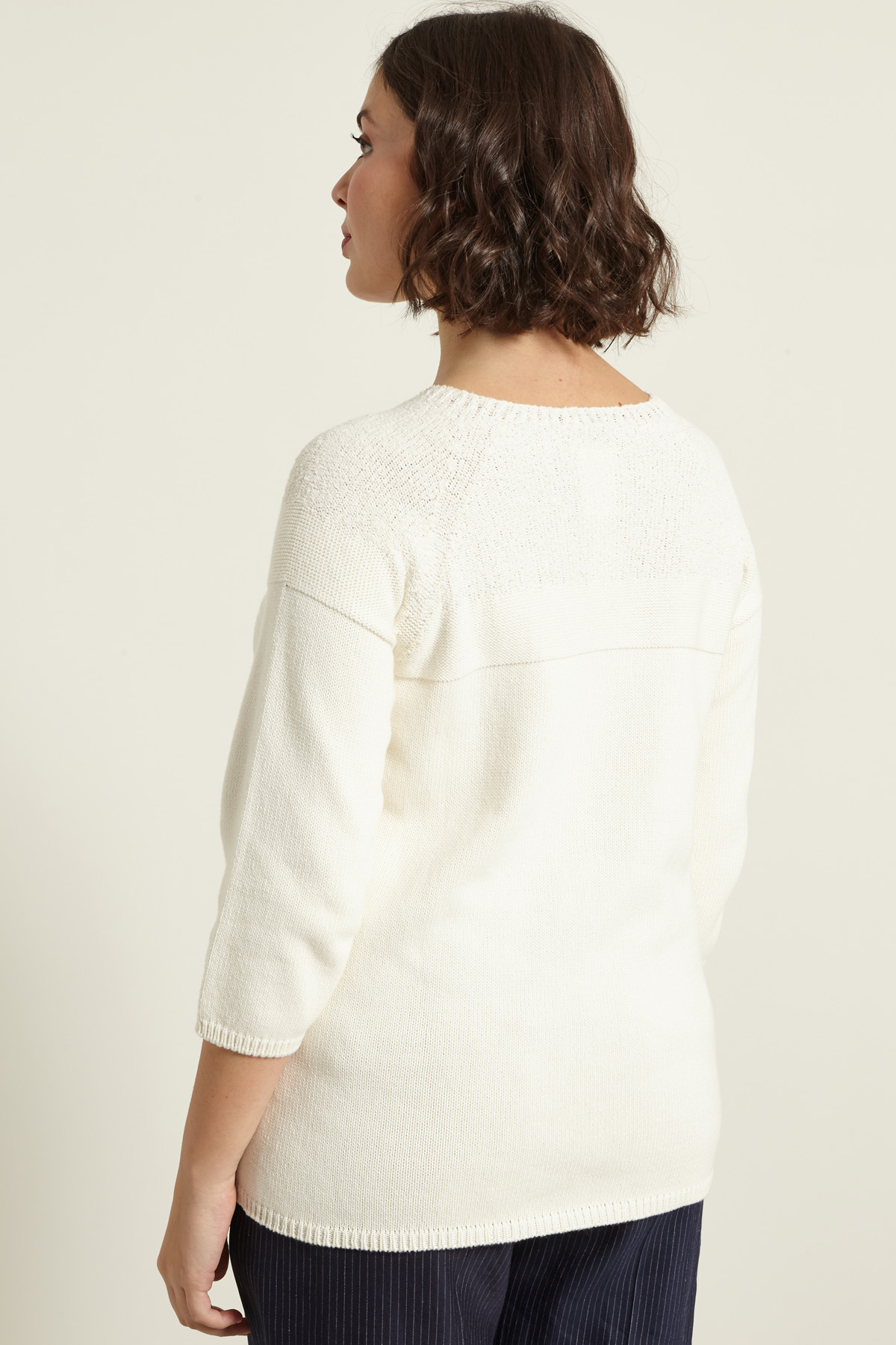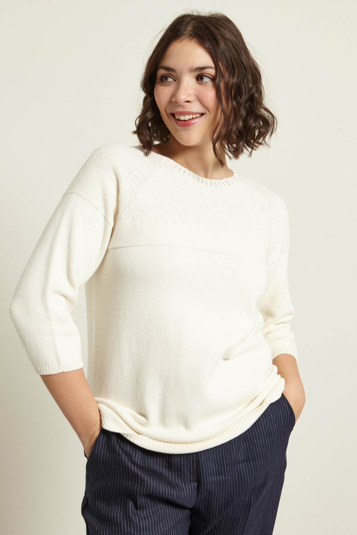 Maglia dalla linea regolare realizzata in filato di puro cotone, con motivo effetto spugna, scollo a giro, maniche tre quarti raglan e profili rifiniti a coste.
