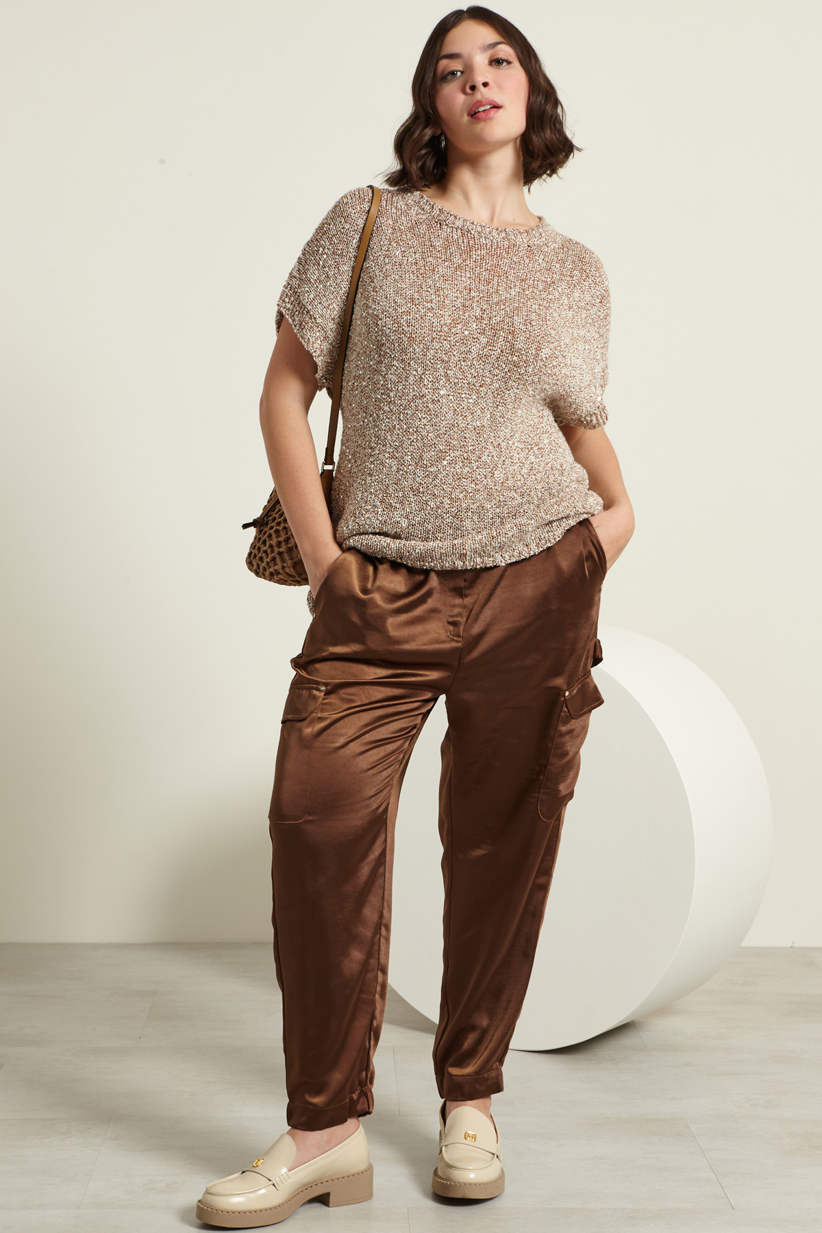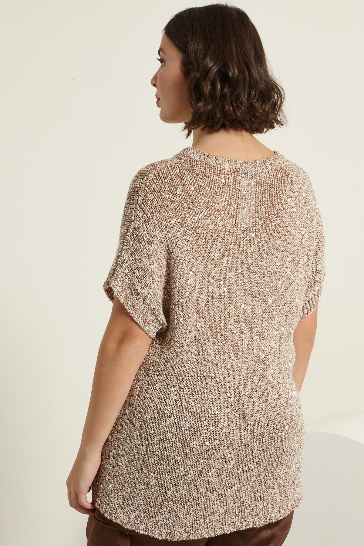 Maglia dalla linea regolare realizzata in filato bottonato di misto viscosa e cotone tinto filo, con micro paillettes ricamate, scollo a giro, maniche corte a kimono e profili rifiniti a coste.