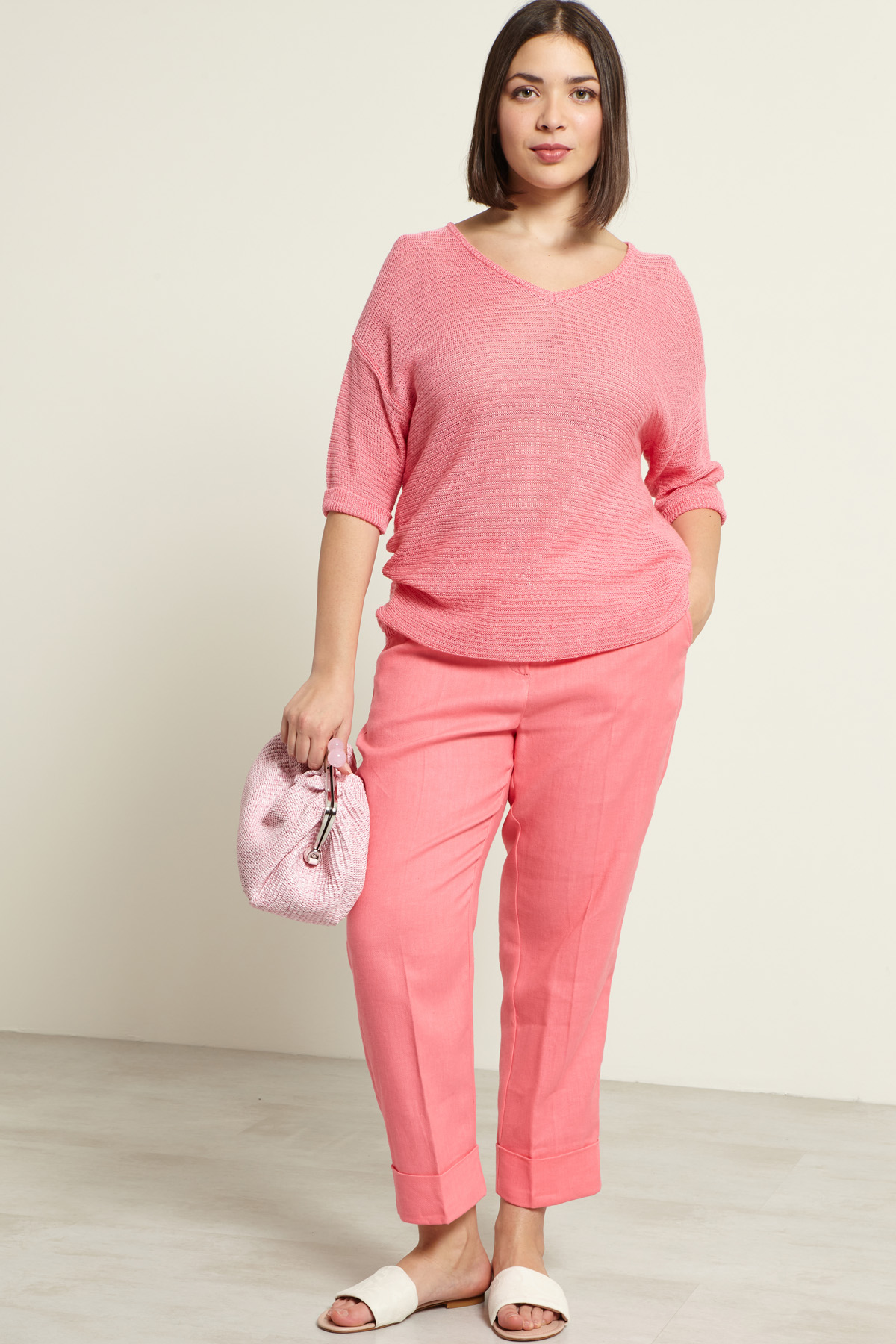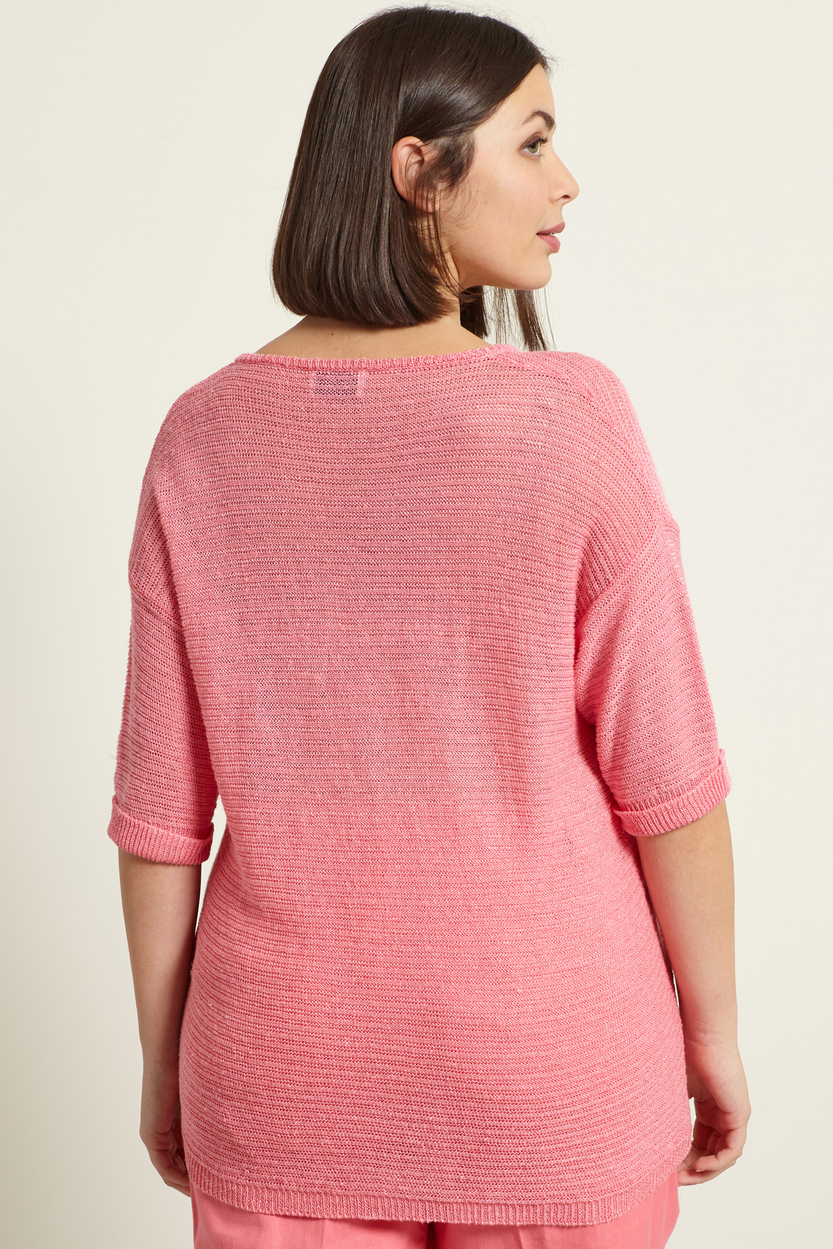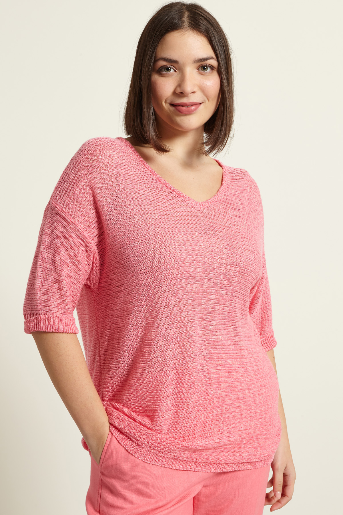 Maglia dalla linea regolare realizzata in filato di lino e viscosa crépe, con scollo a V, maniche corte e profili rifiniti a coste.