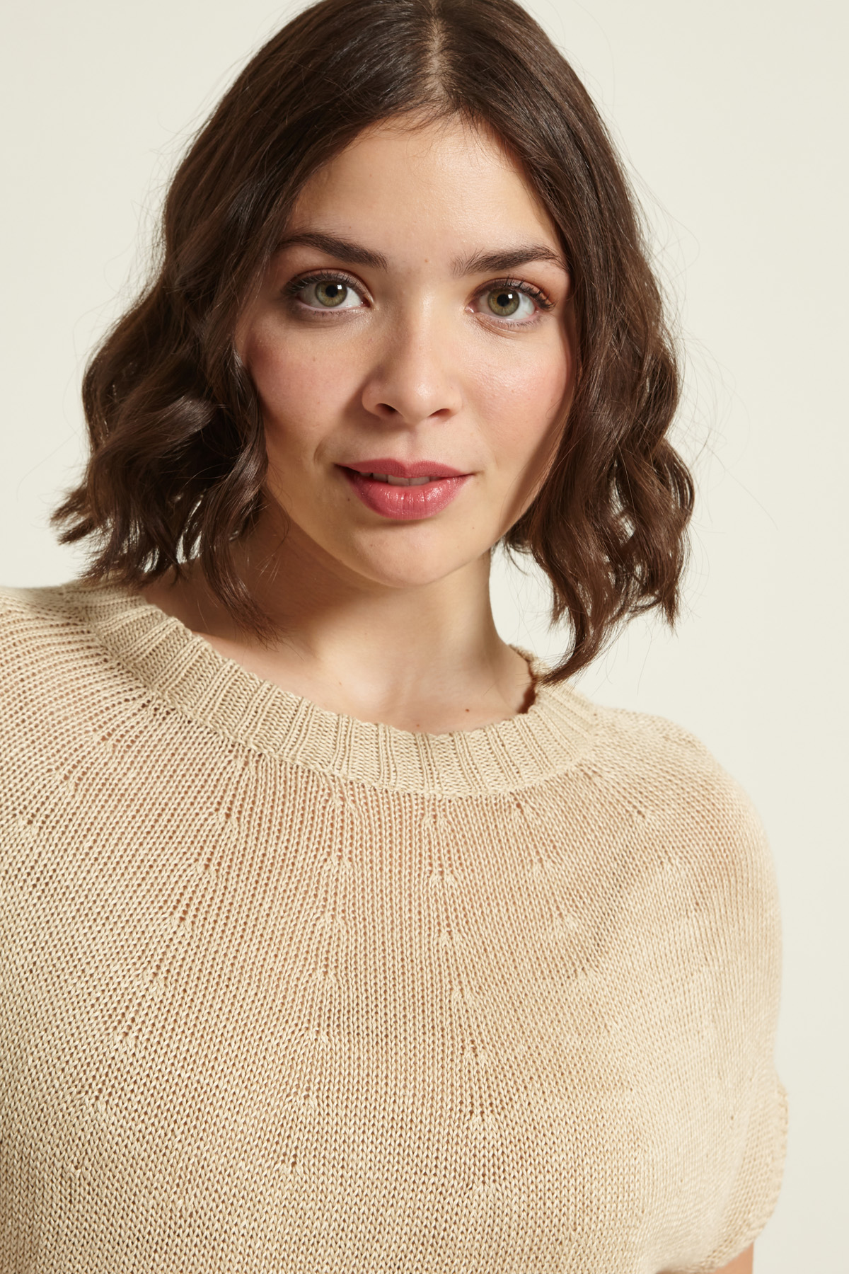 Maglia dalla linea regolare realizzata in filato di puro lino, con scollo a giro, maniche corte a kimono e profili rifiniti a coste.