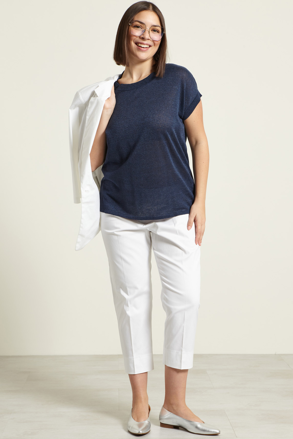 Maglia dalla linea regolare realizzata in filato di misto lino con inserto in fibra lamè, scollo a giro e maniche corte a kimono.