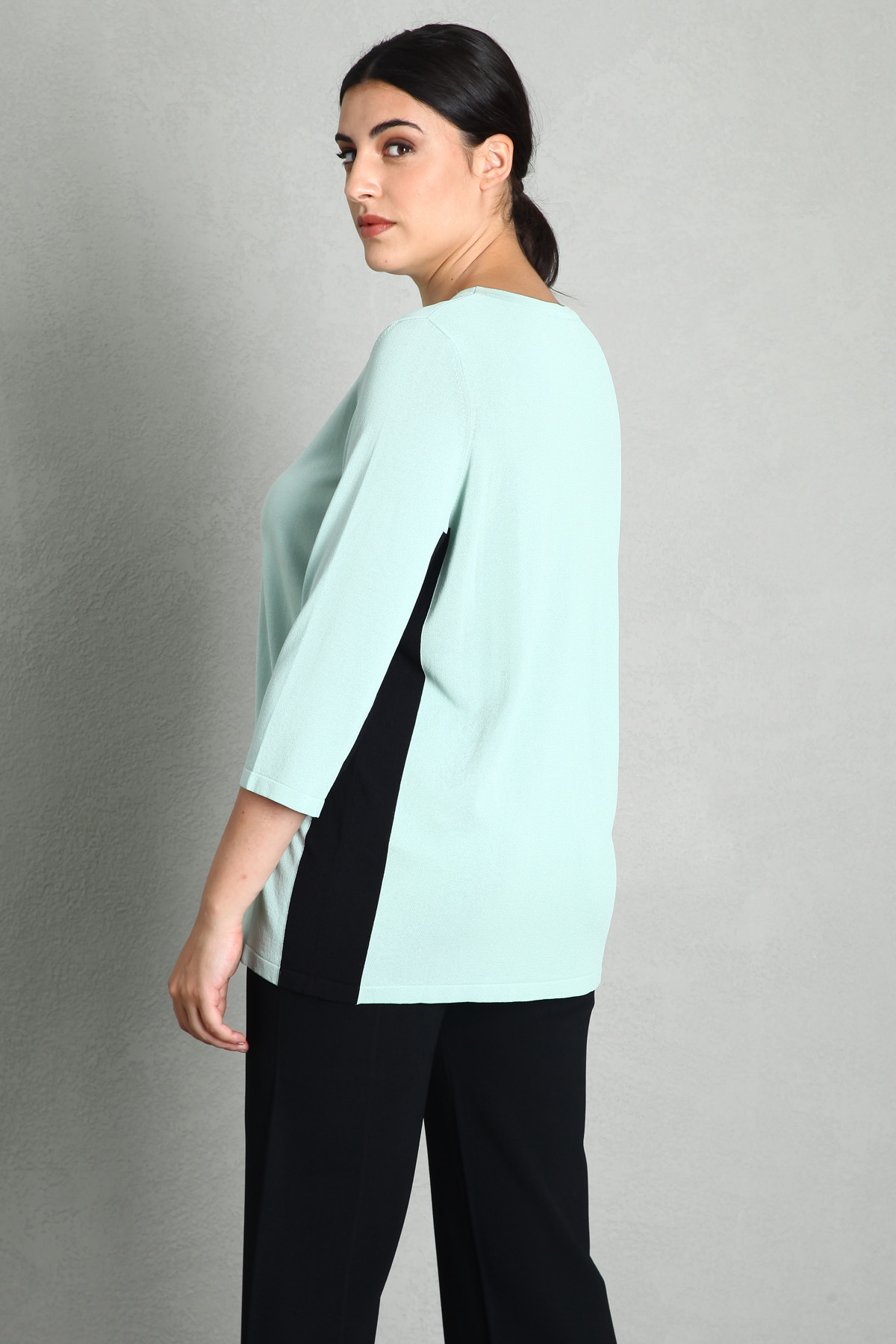 Maglia dalla linea dritta realizzata in filato di misto viscosa, con intarsi a contrasto, scollo rotondo e maniche a tre quarti.