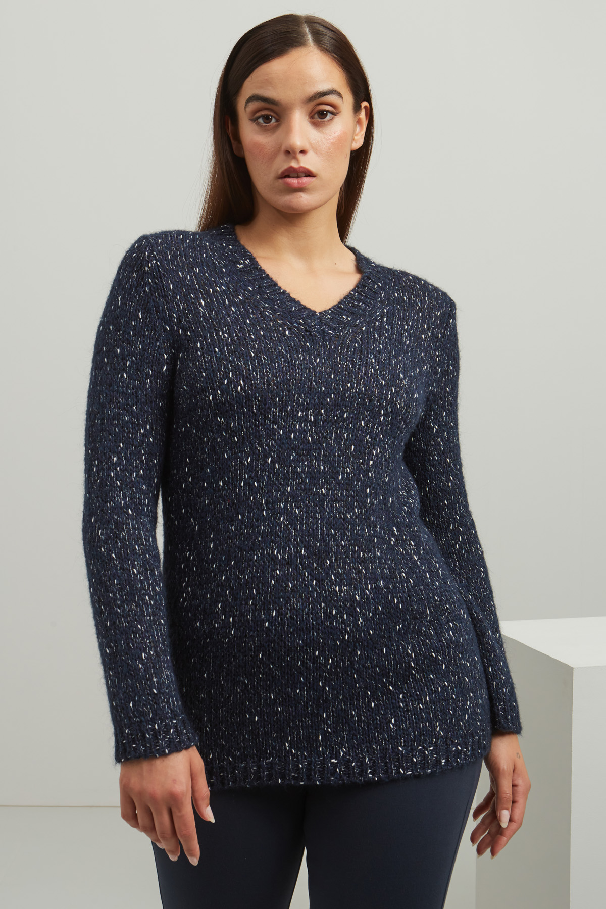 Maglia dalla linea dritta realizzata in filato di misto lana, alpaca e mohair bottonato con dettaglio di micro paillettes e lamè, scollo a V e maniche lunghe.
