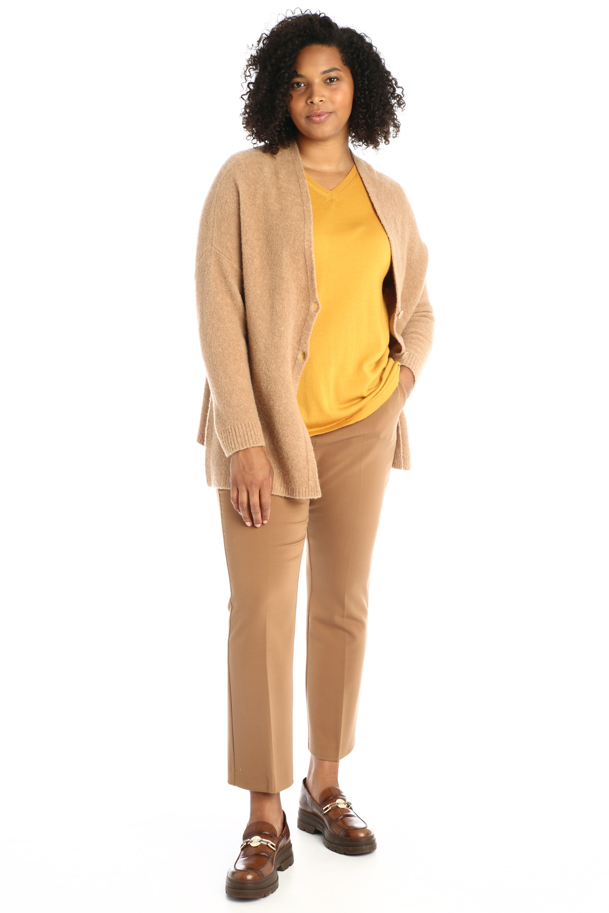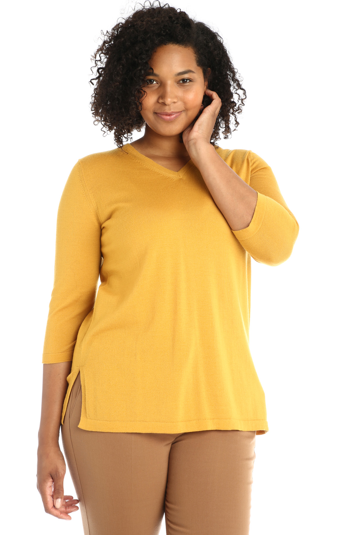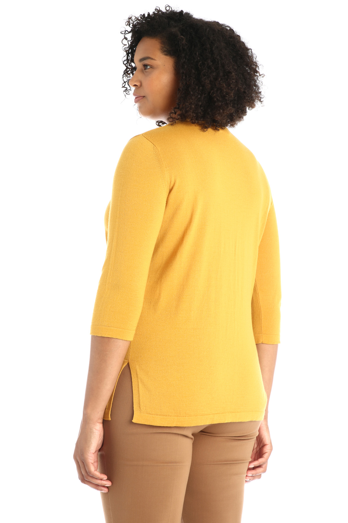 Maglia dalla linea diritta realizzata in filato di pura lana, con scollo a V, maniche a tre quarti e spacchi al fondo.