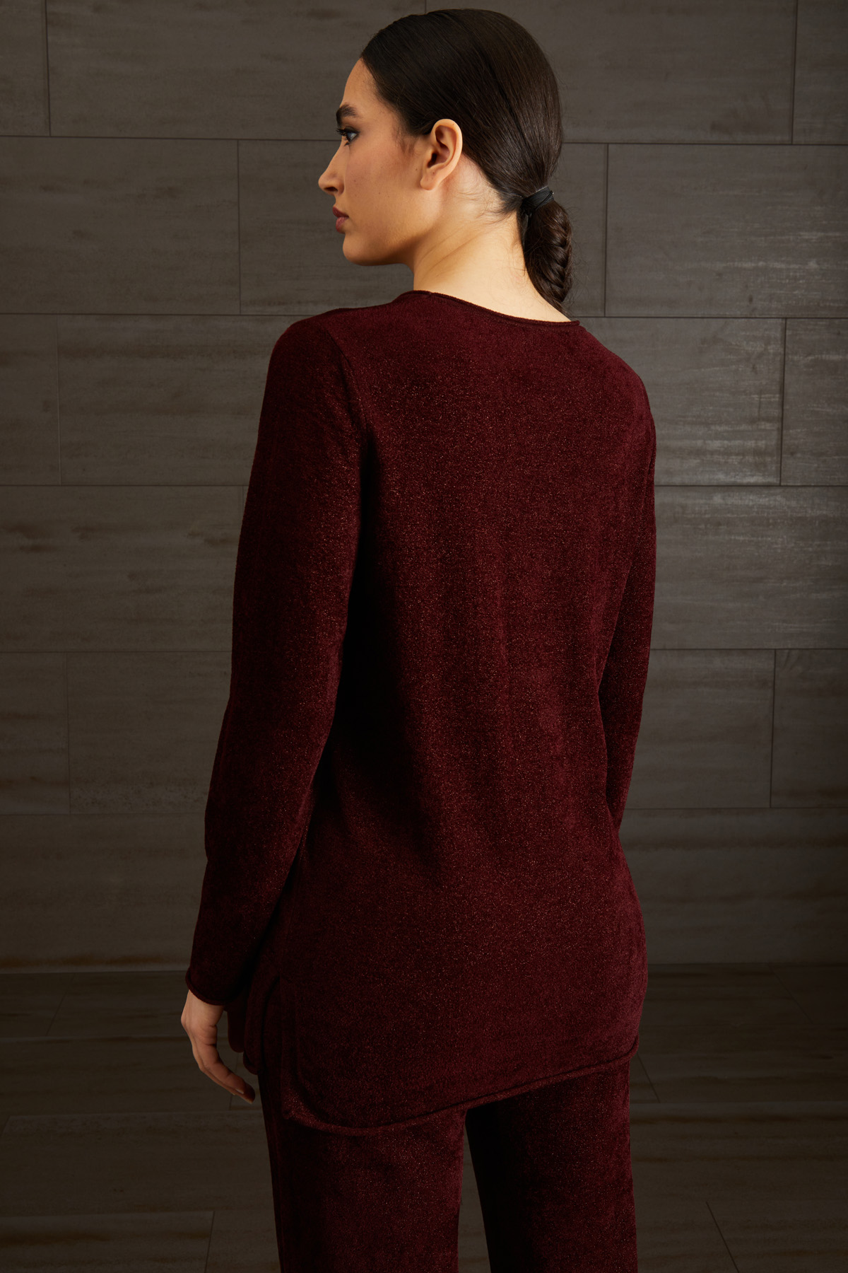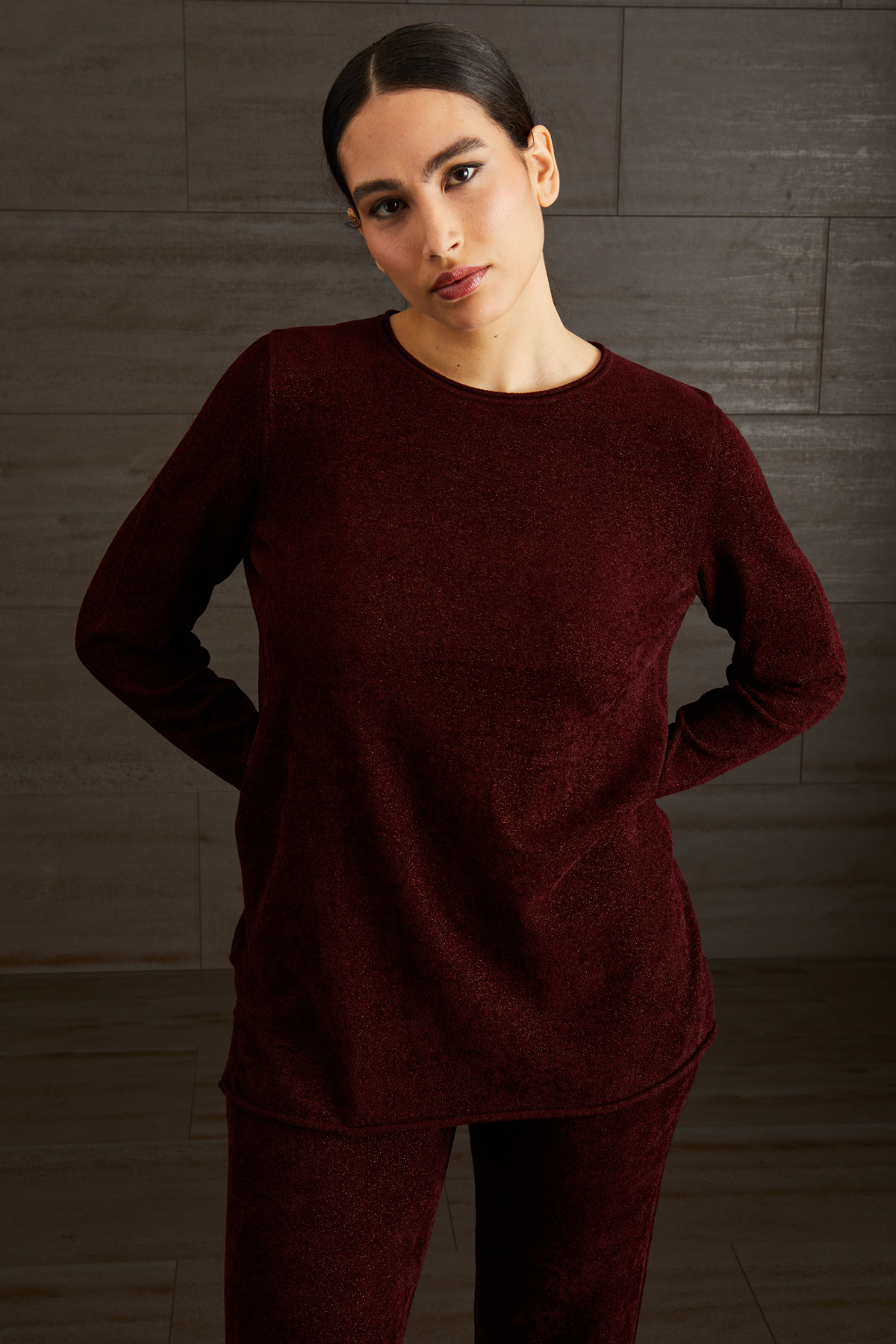 Maglia idalla linea dritta realizzata in ciniglia di misto viscosa lamè, con scollo a giro e maniche lunghe.