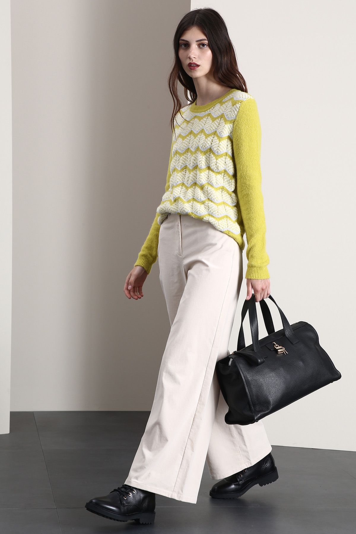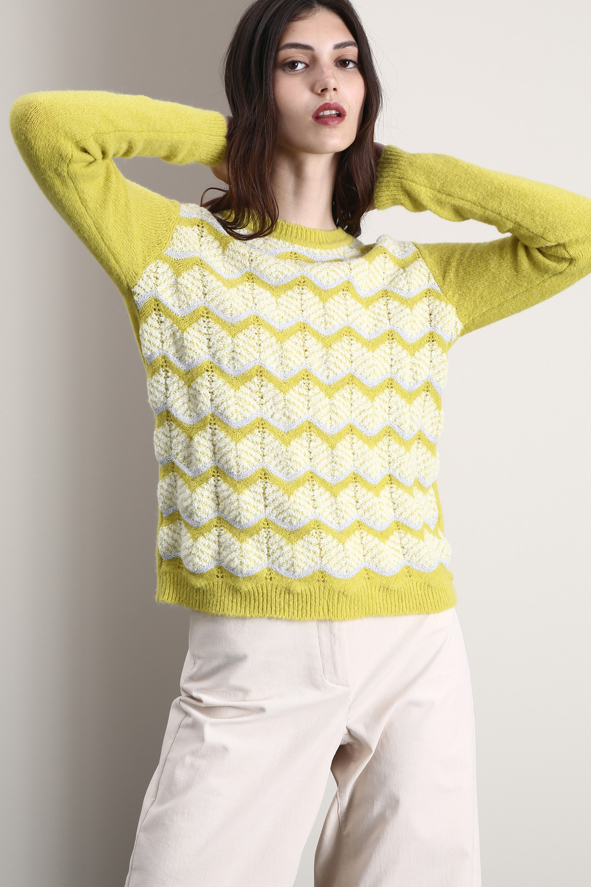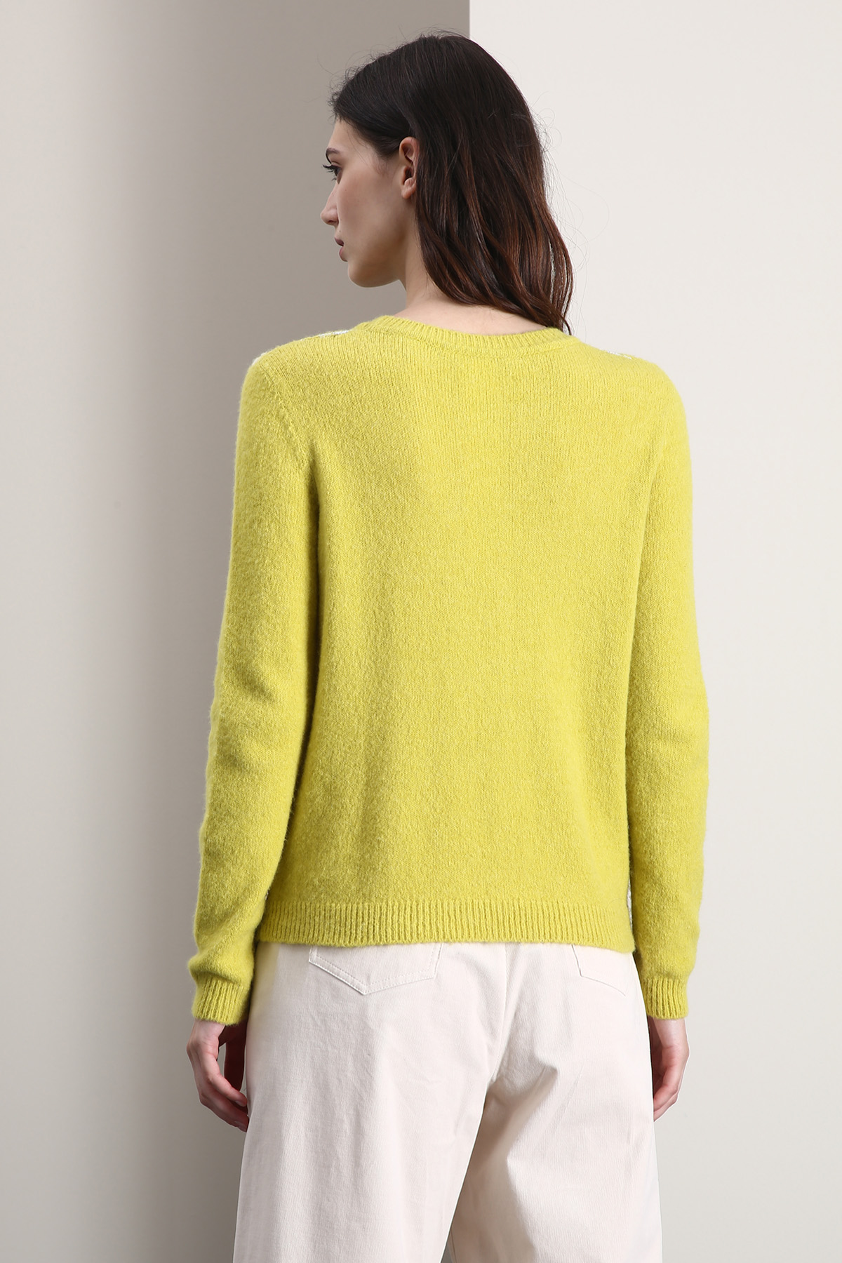 Maglia dalla linea dritta realizzata in filato di misto alpaca stretch, con intarsio bouclè sul davanti, inserto di fibra lamè, scollo a giro, maniche lunghe e profili rifiniti a coste.