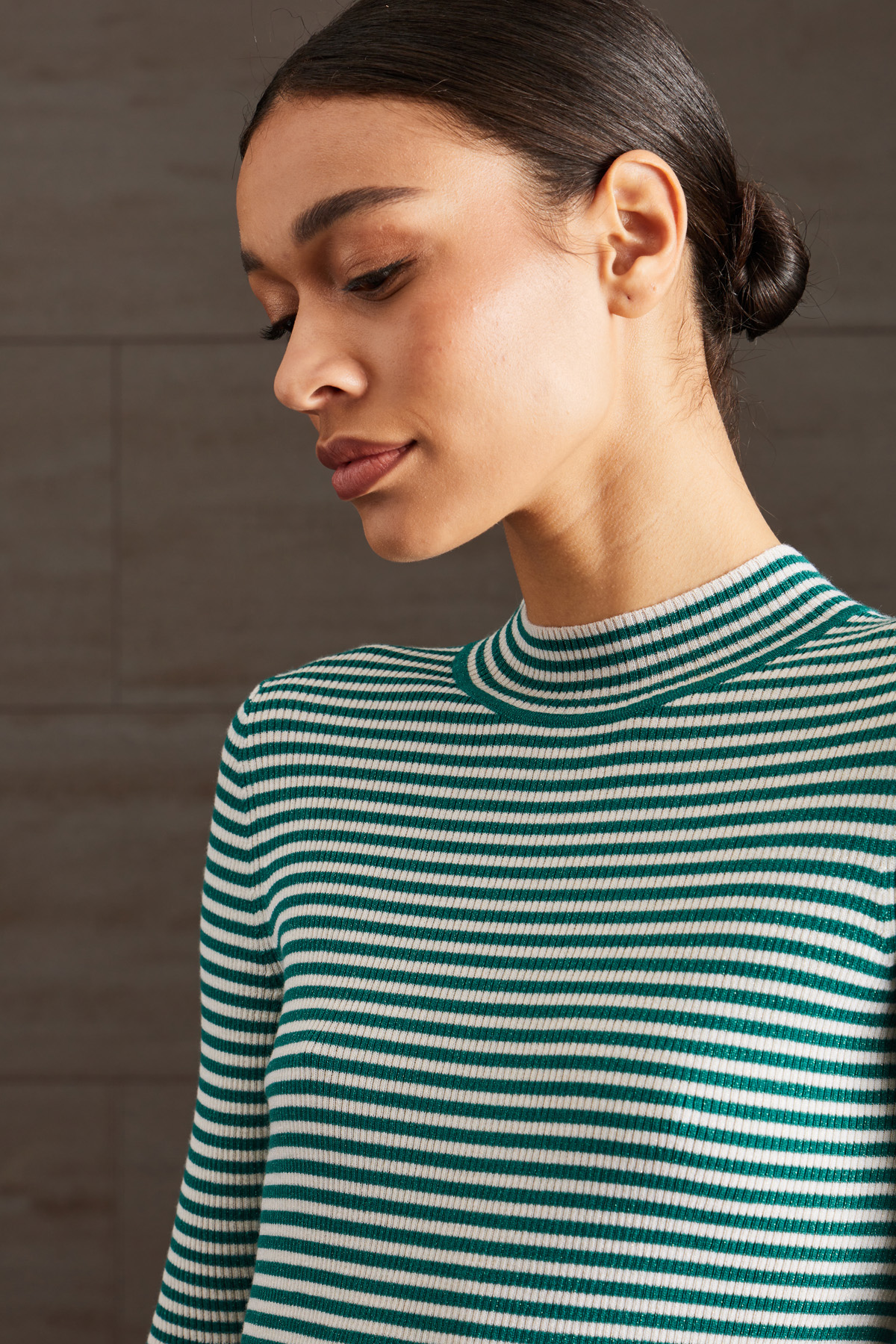 Maglia dalla linea aderente realizzata in filato di misto lana tinto filo, con inserti in fibra lame, collo montante e maniche corte.