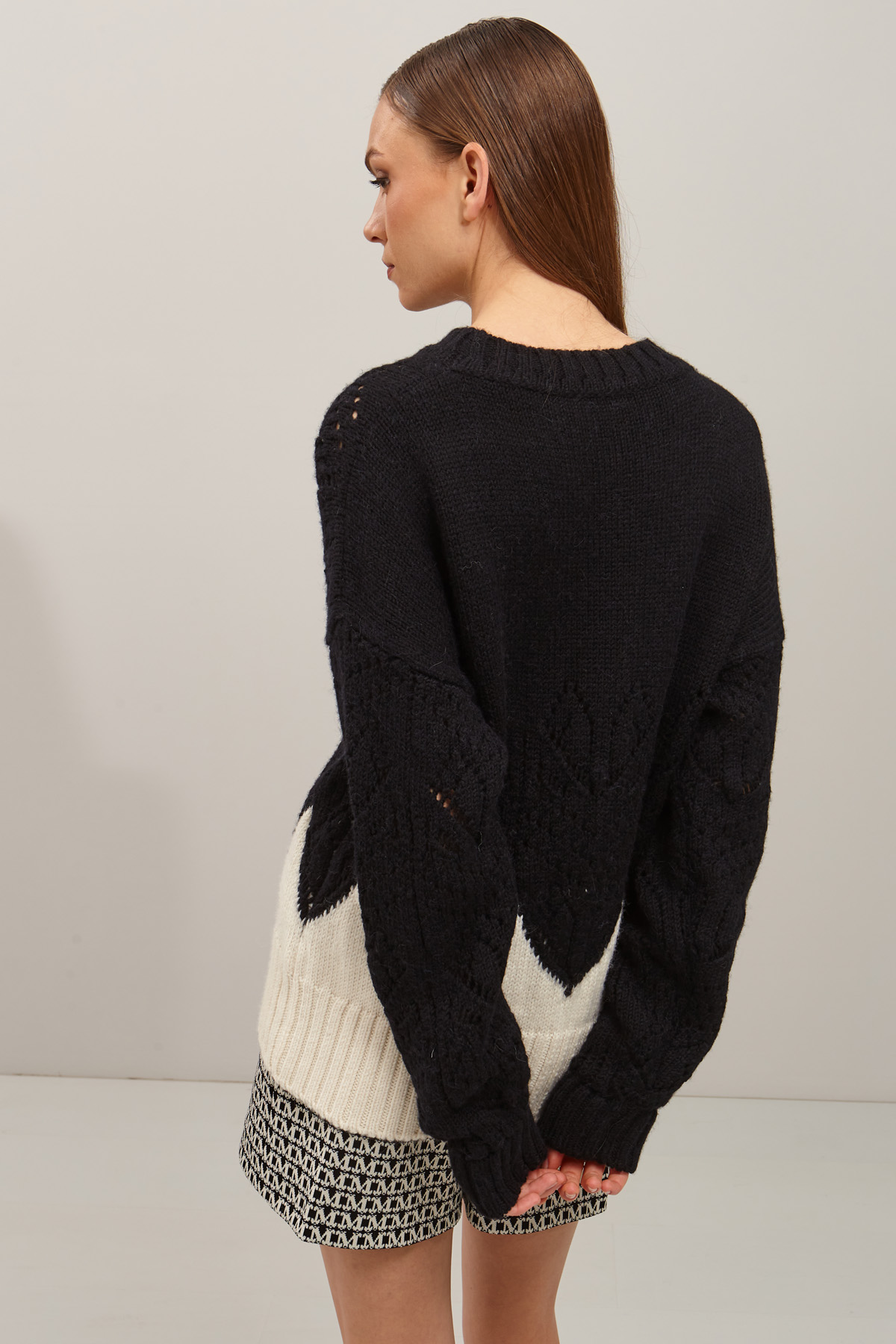 Maglia dalla linea dritta realizzata in filano di lana e alpaca con dettaglio intarsio, collo a giro e maniche lunghe dal giro sceso.